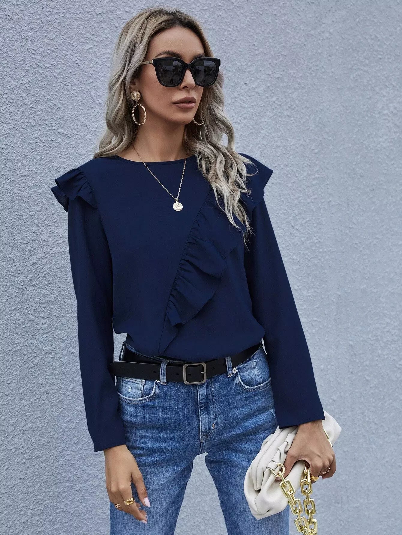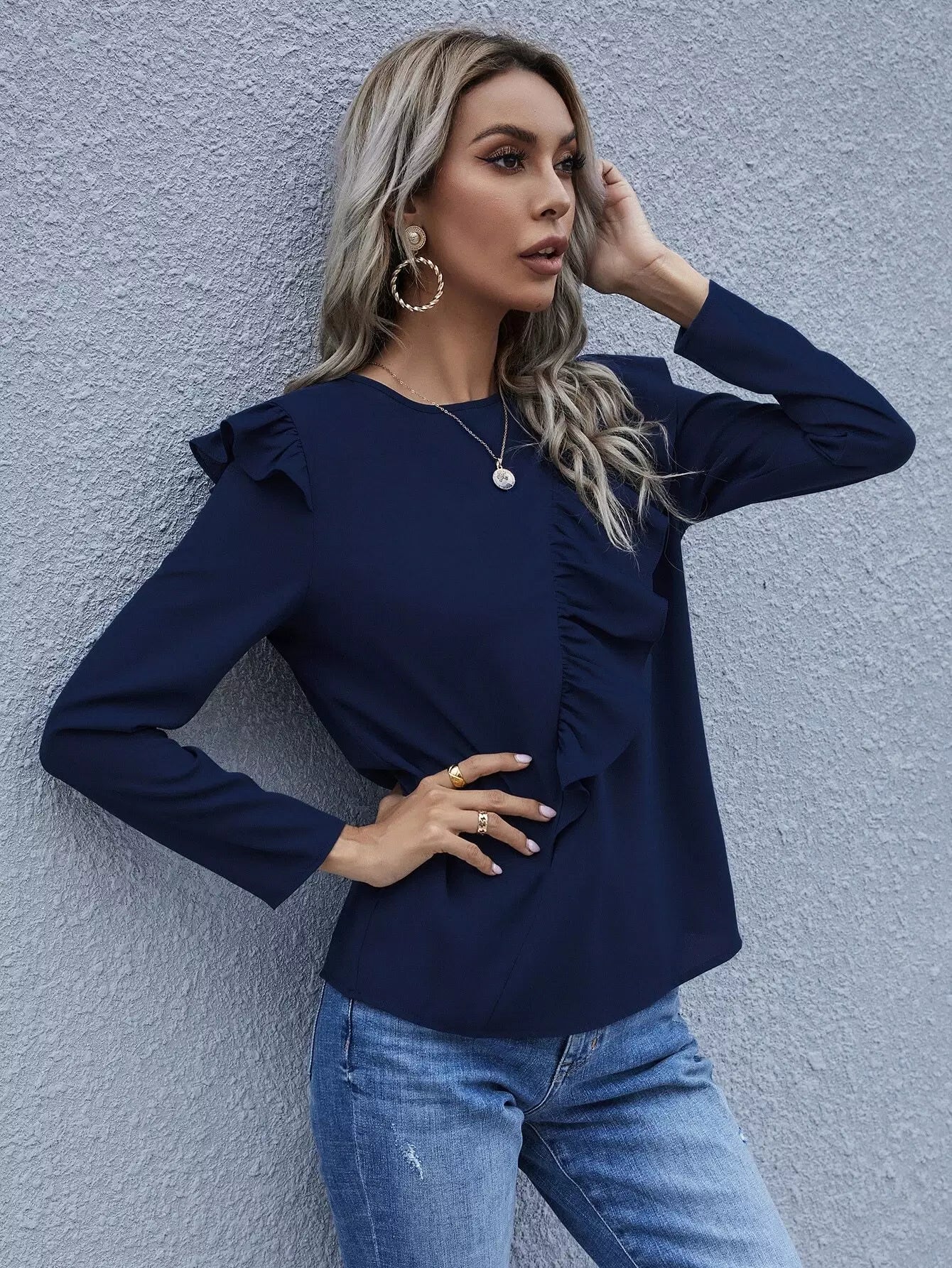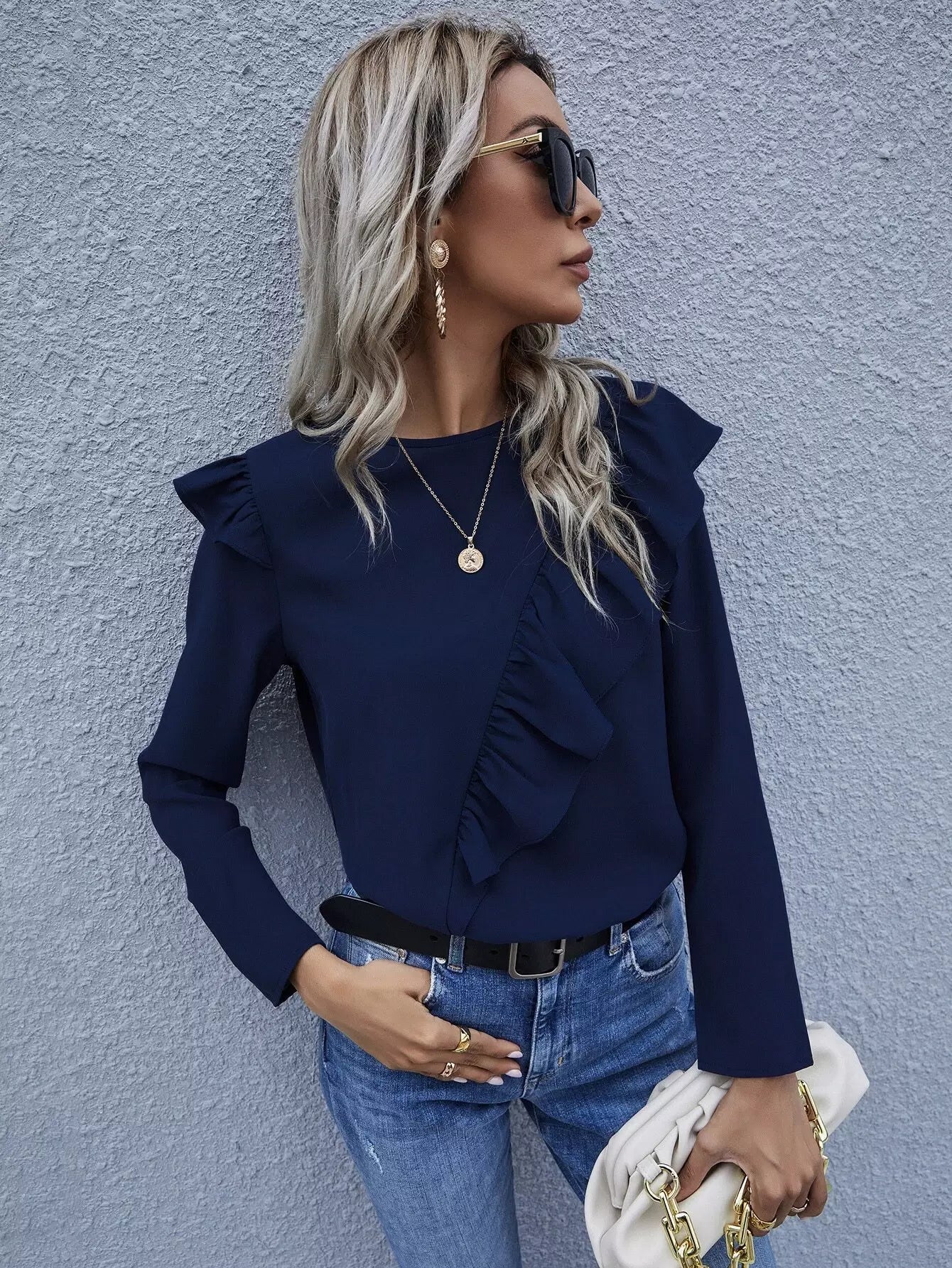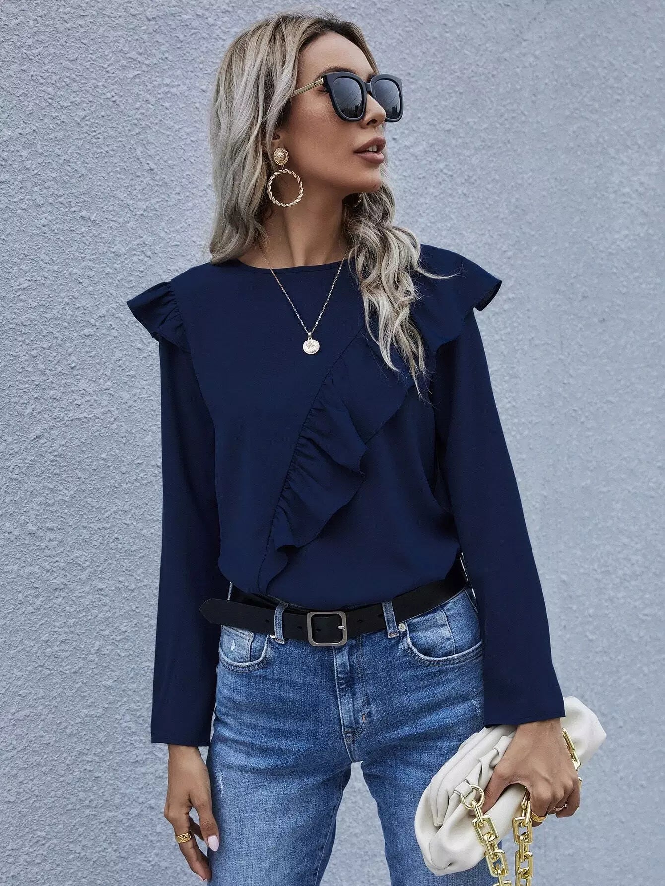 بلوزة سادة بياقة دائرية وحواف مكشكشة