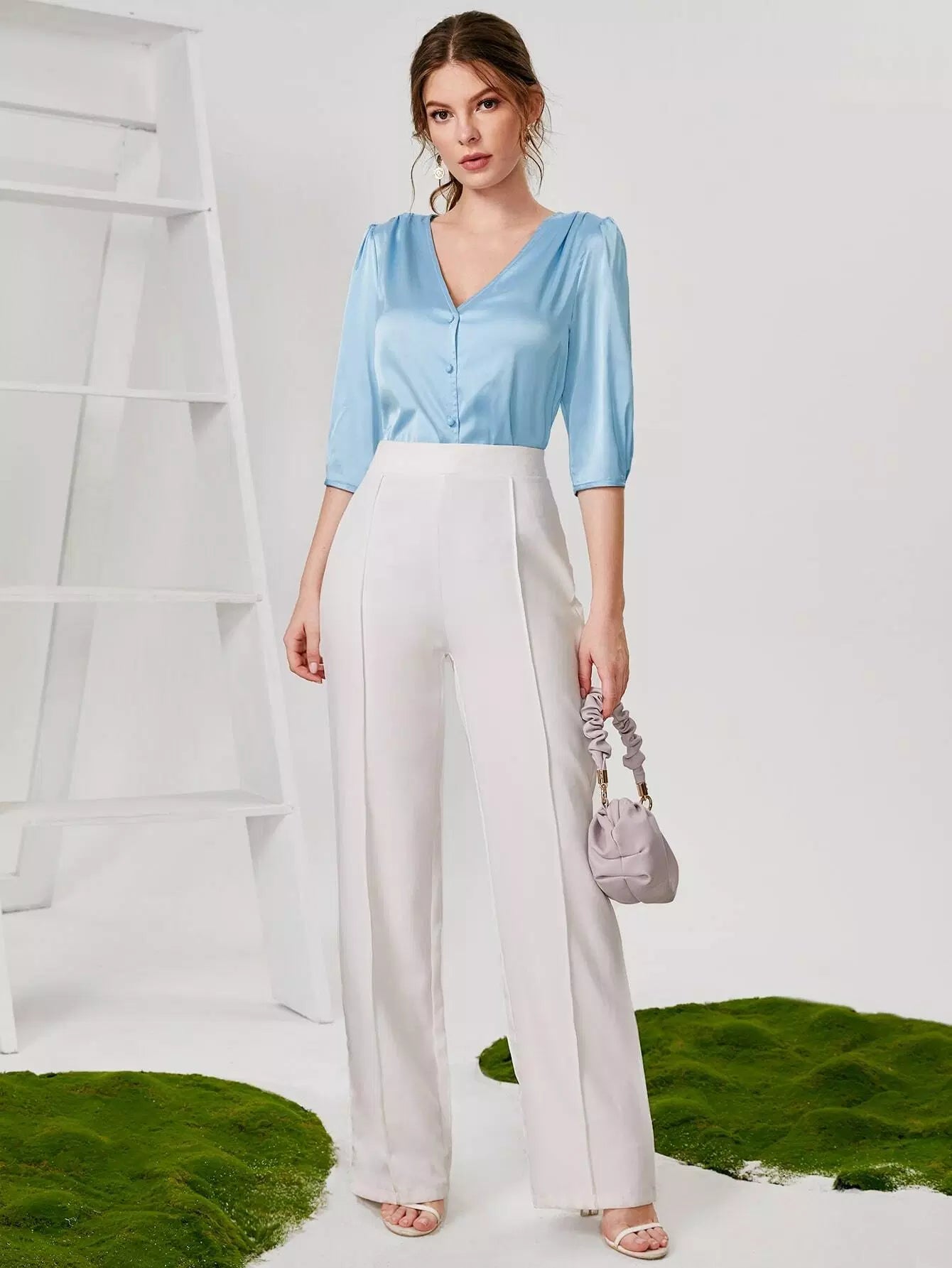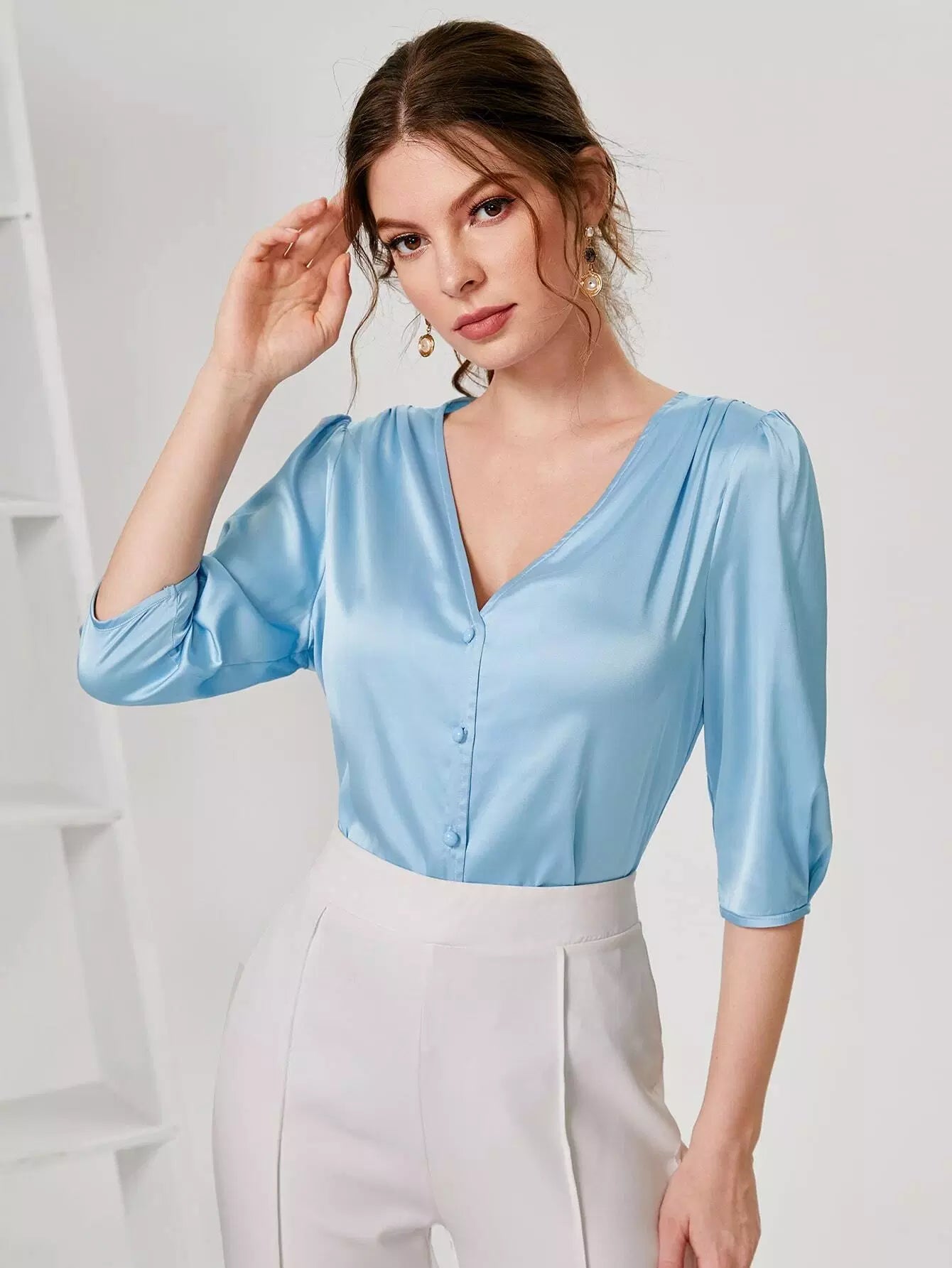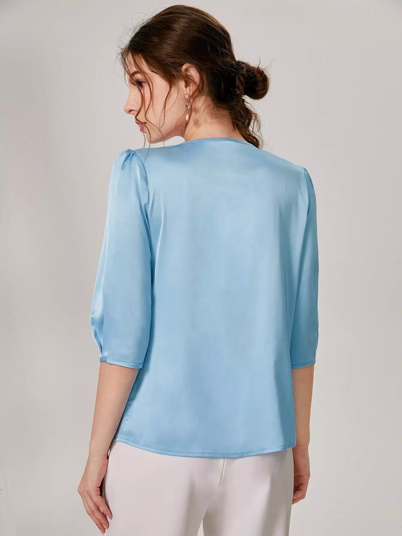 بلوزة ساتان برقبة على شكل V بأكمام منفوشة من الساتان