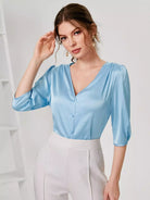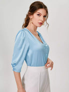 للنساء - بلوزة من الساتان بياقة على شكل V وأكمام منتفخة