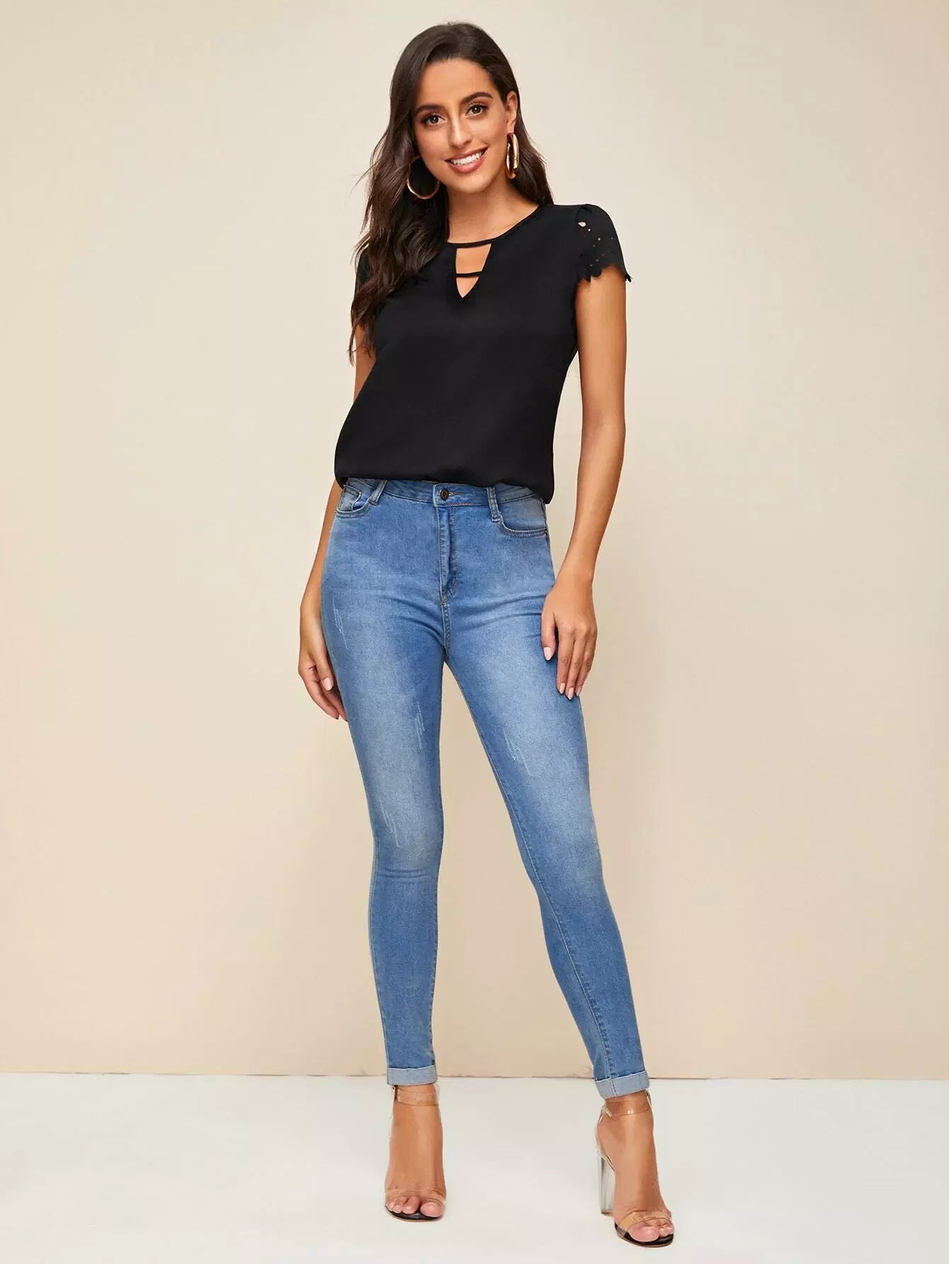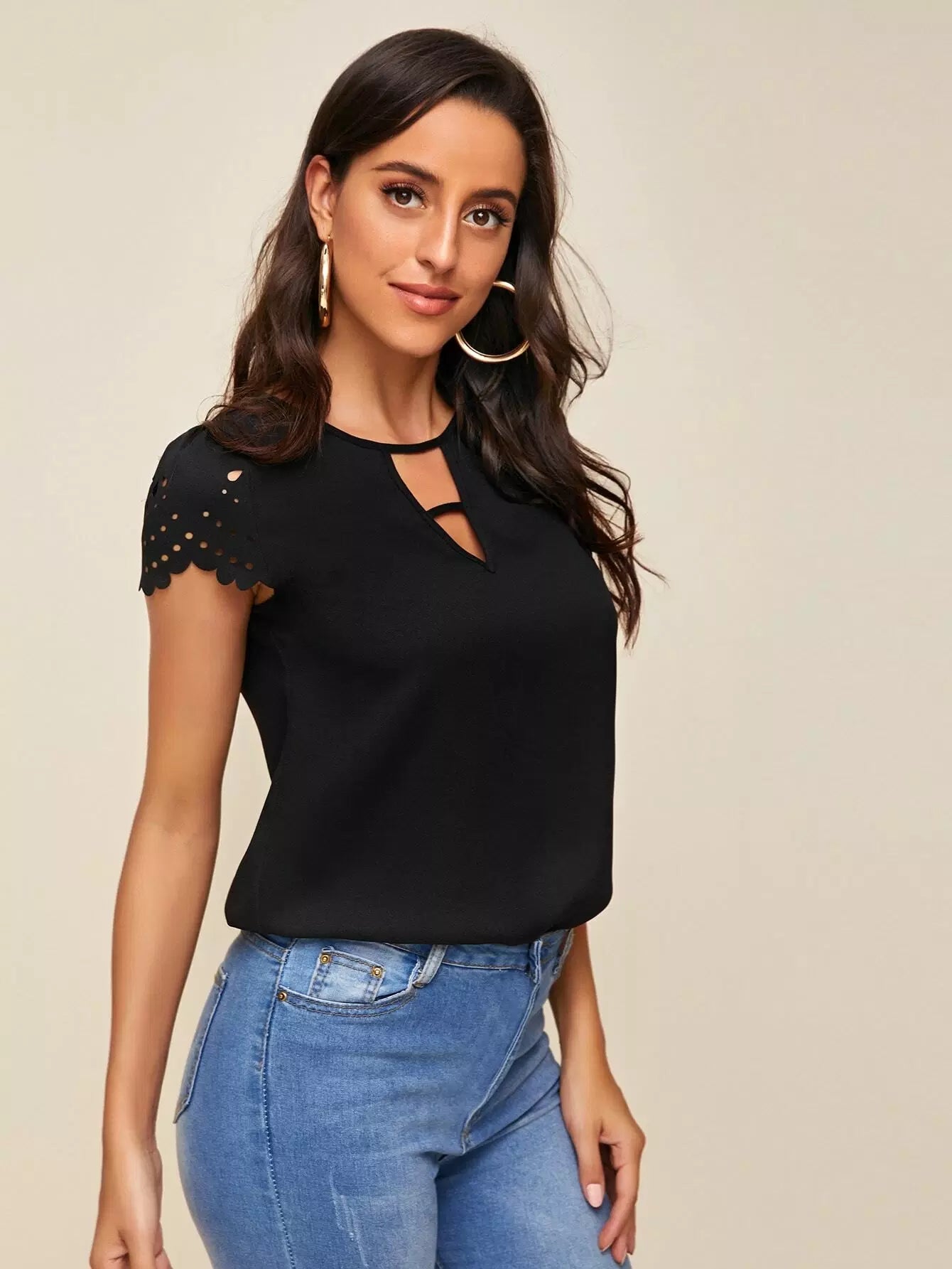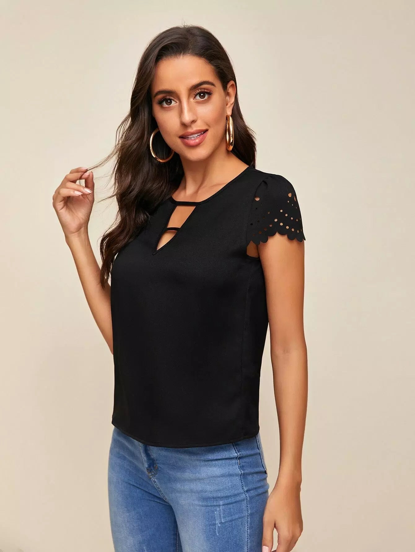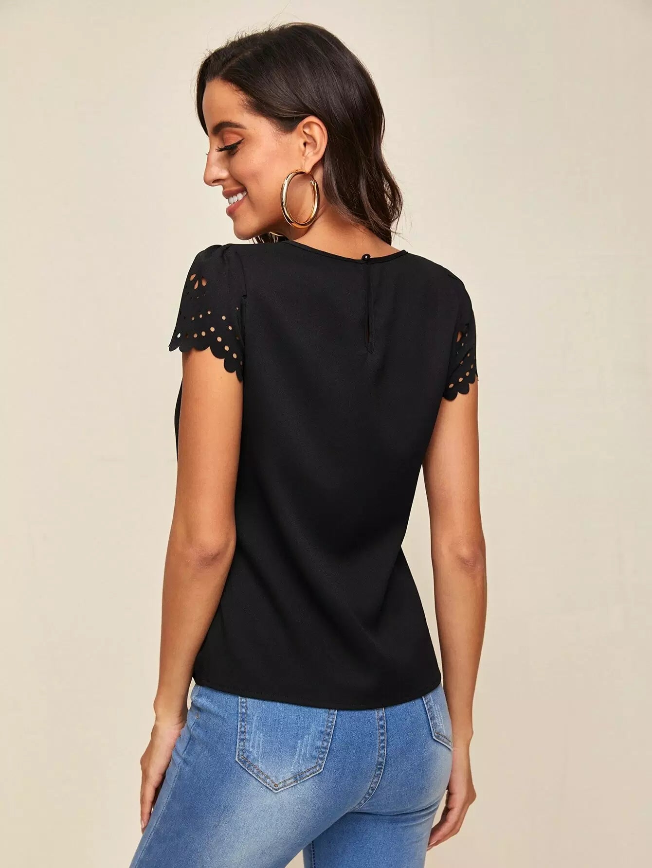 للنساء - بلوزة ذات تفاصيل مقطوعة بالليزر ومزخرفة بأشكال صدفية