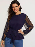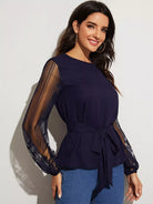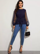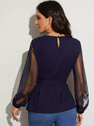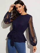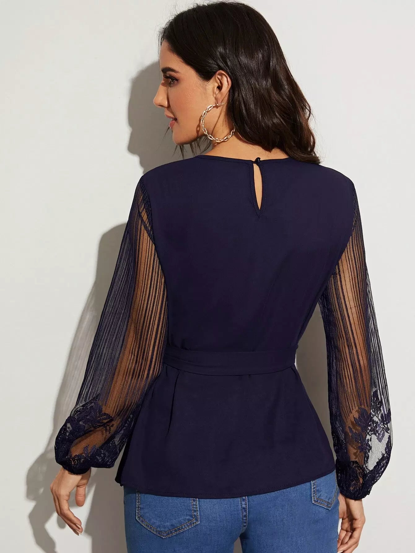 بلوزة بأكمام فانوس من الدانتيل الشفاف بدون حزام