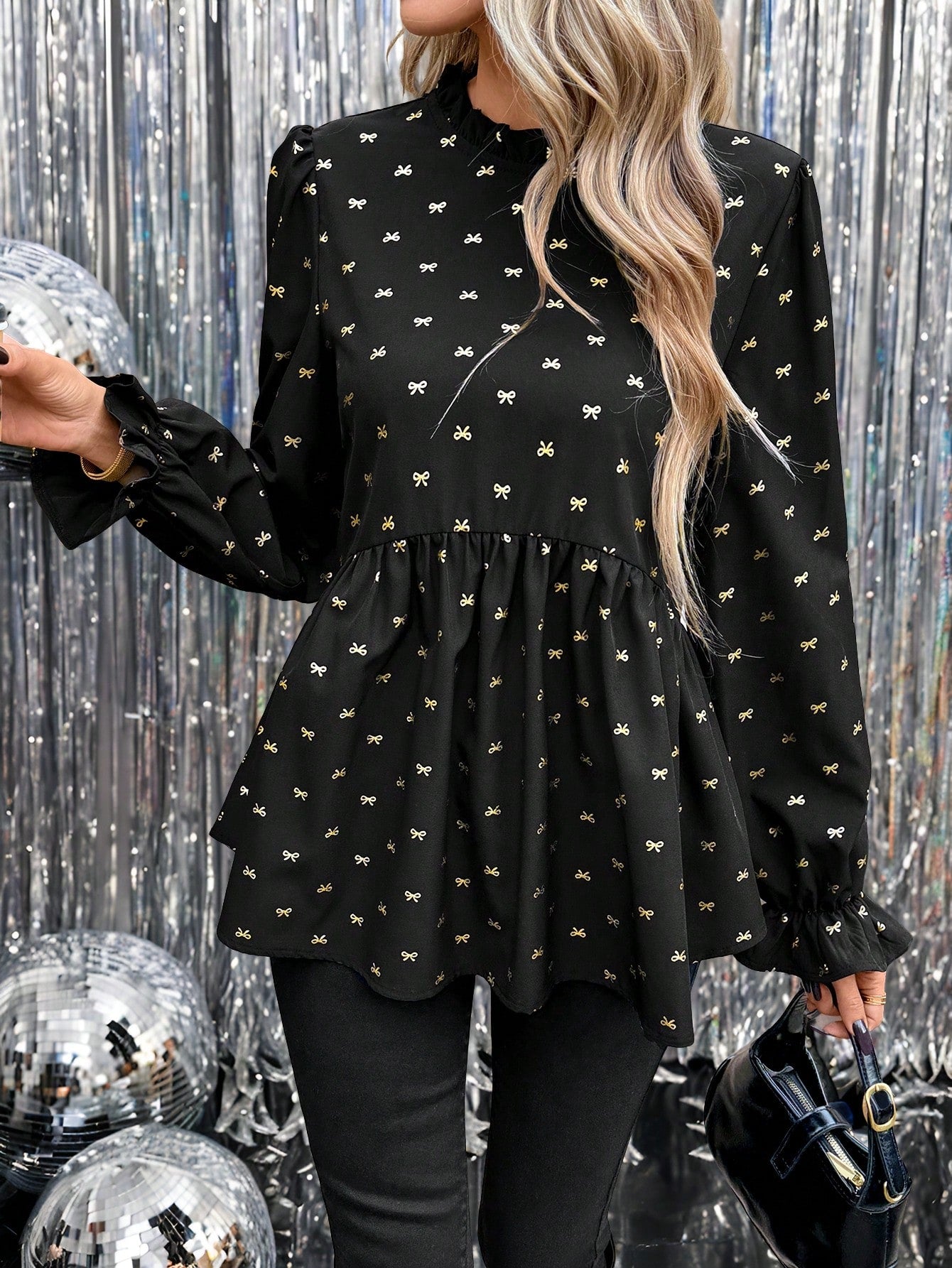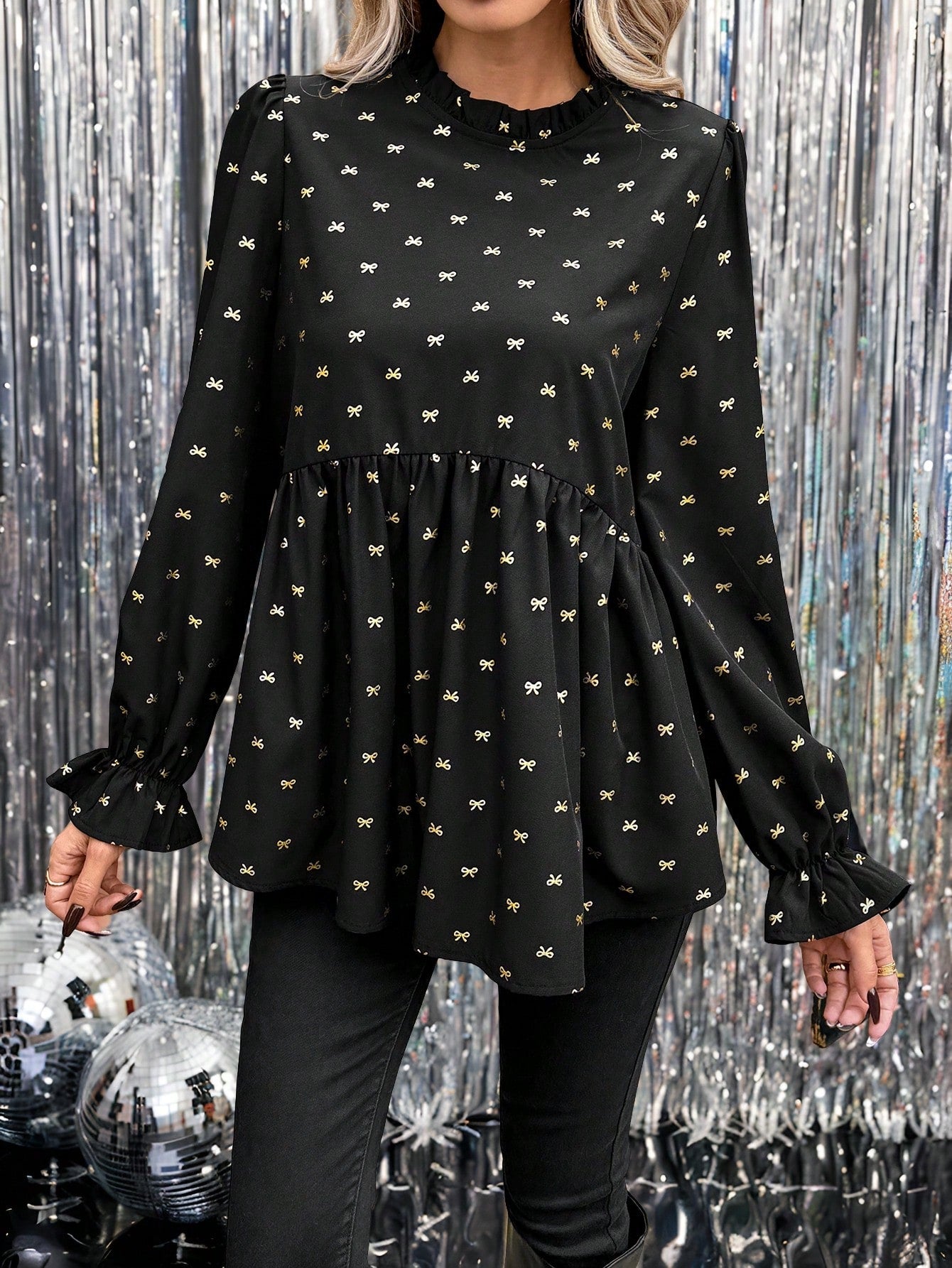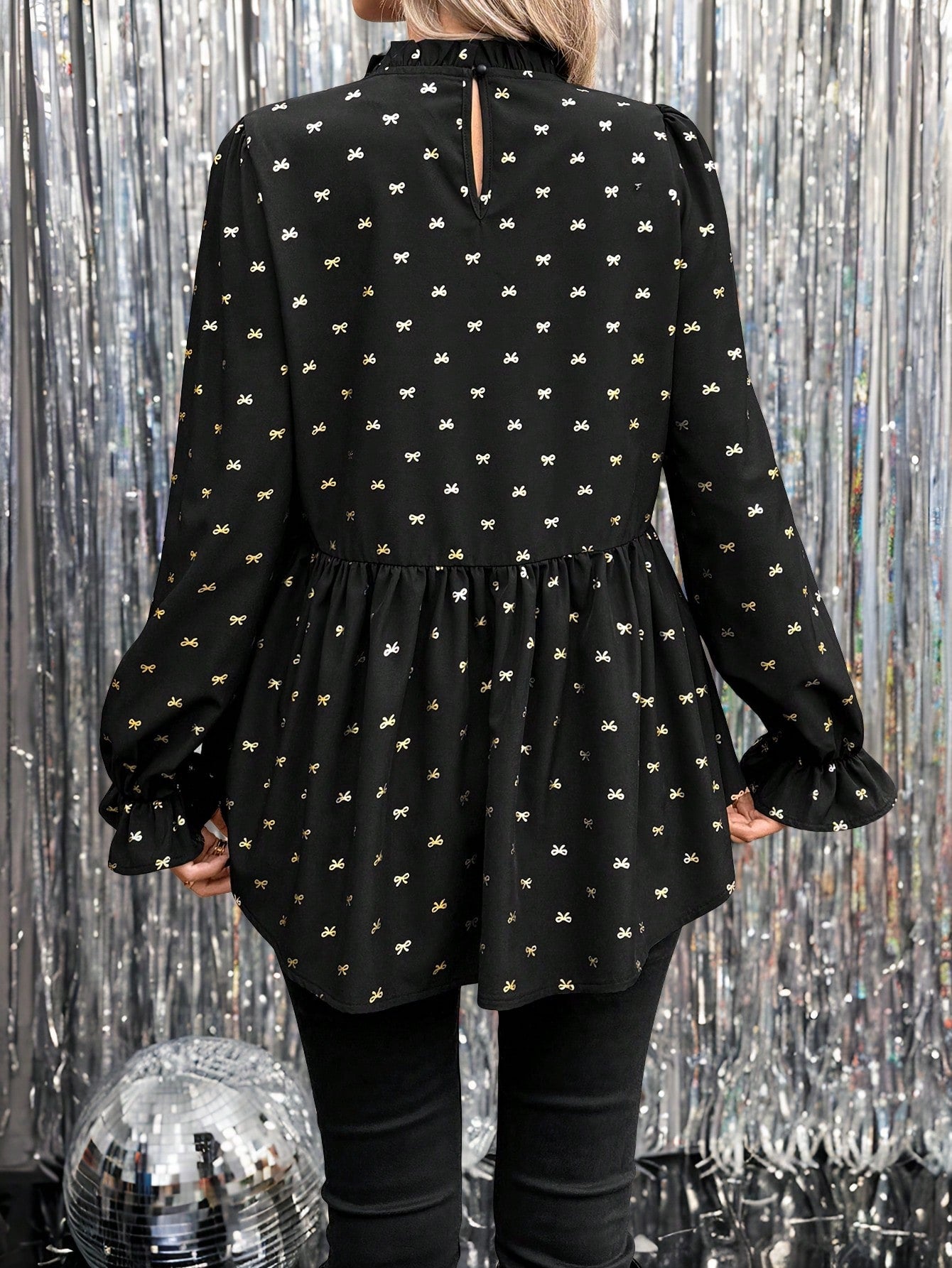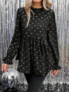 SHEIN LUNE New Year Eve Black Background Golden Butterfly Print Lantern Sleeve Ruffle Hem A-Line Blouse