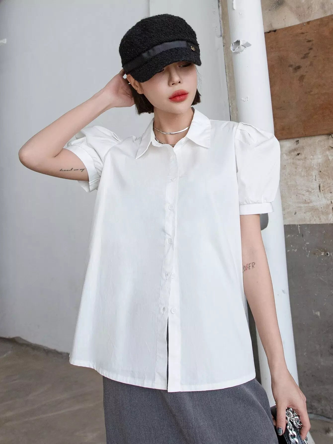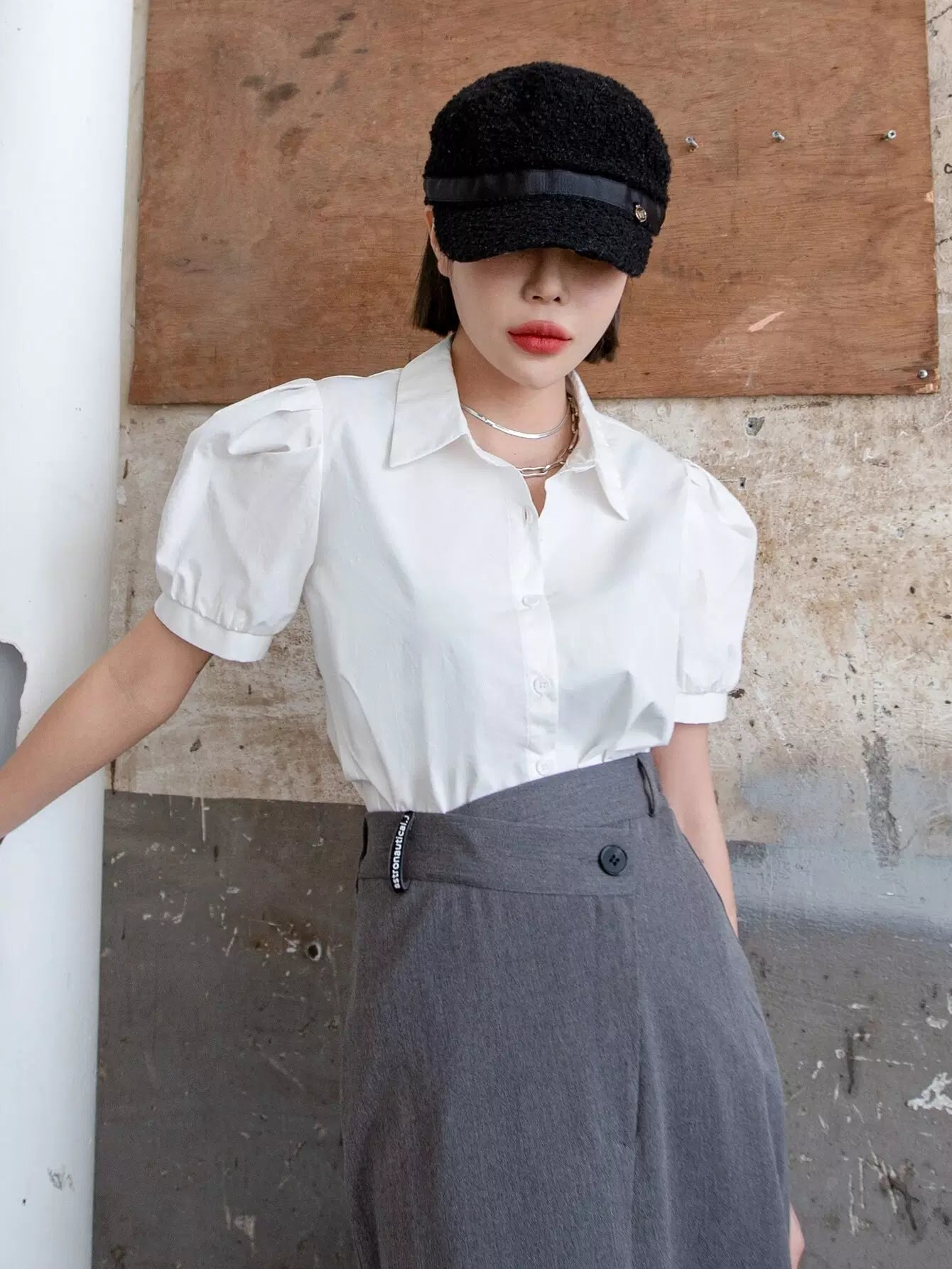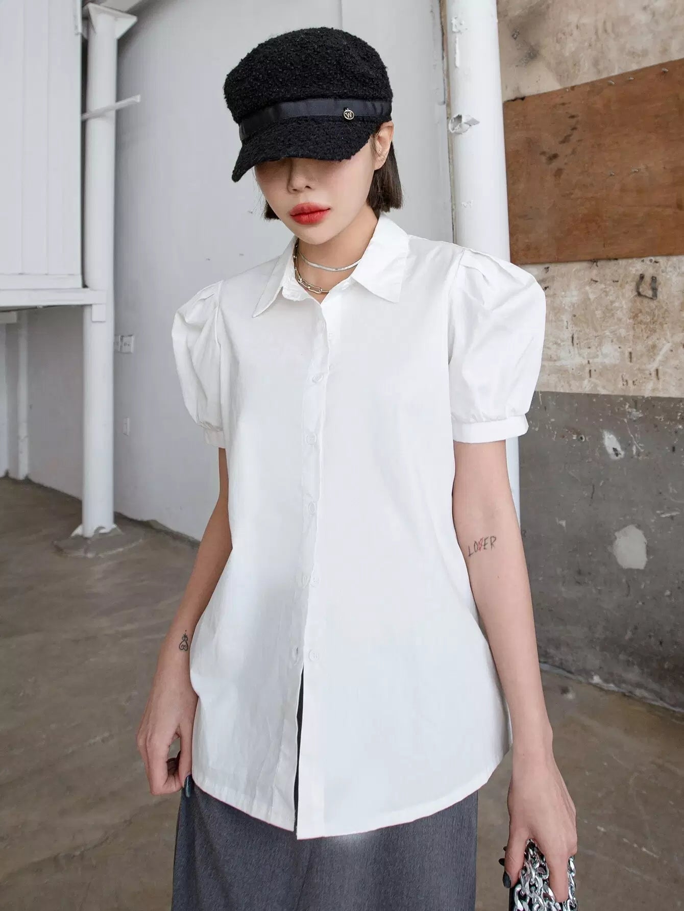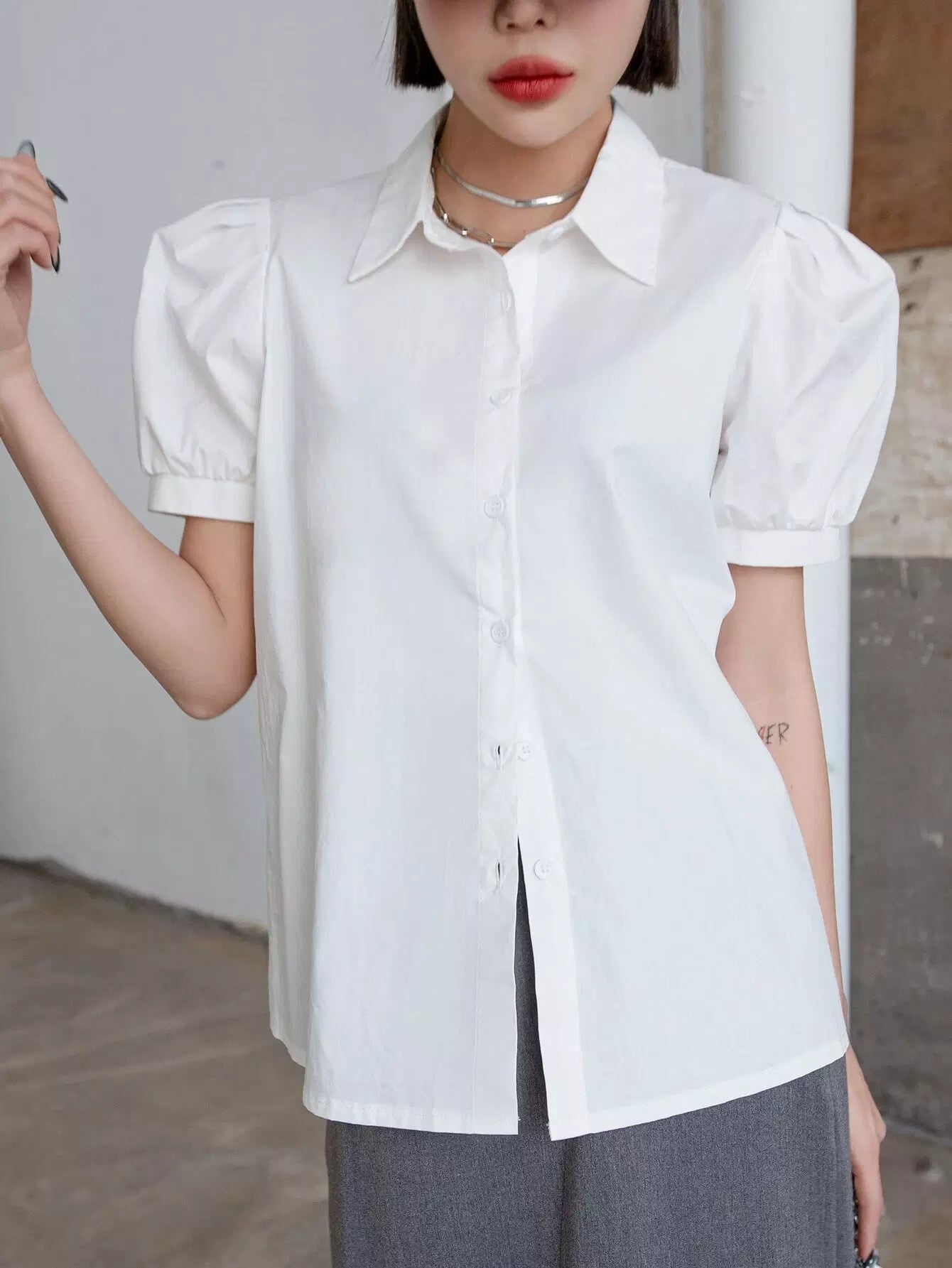 قميص سادة بأزرار أمامية بأكمام منفوخة بأزرار سادة