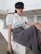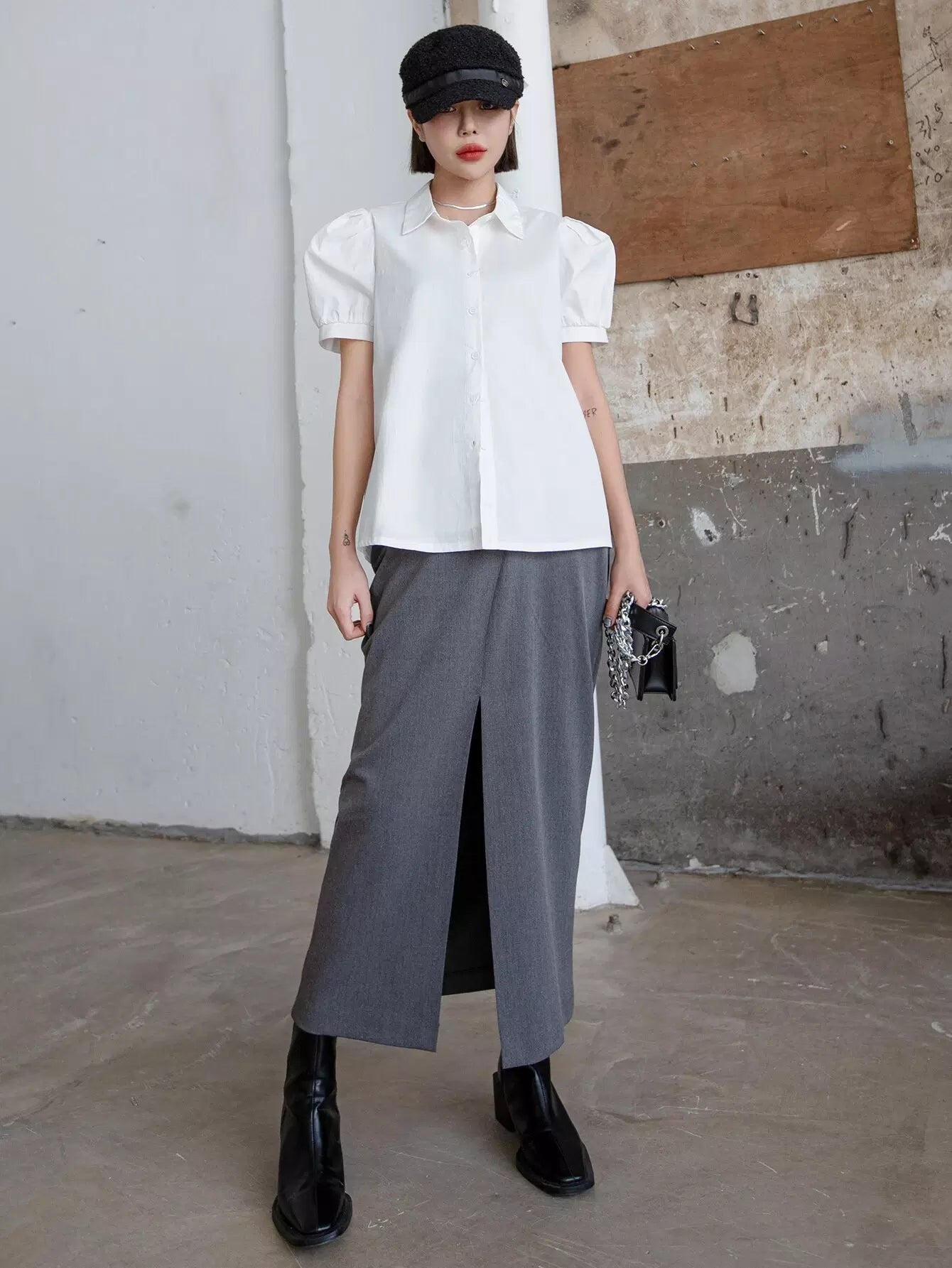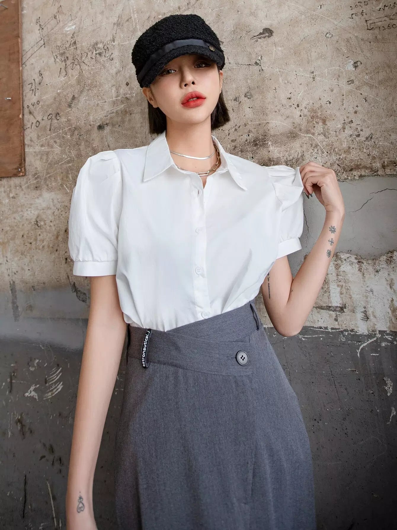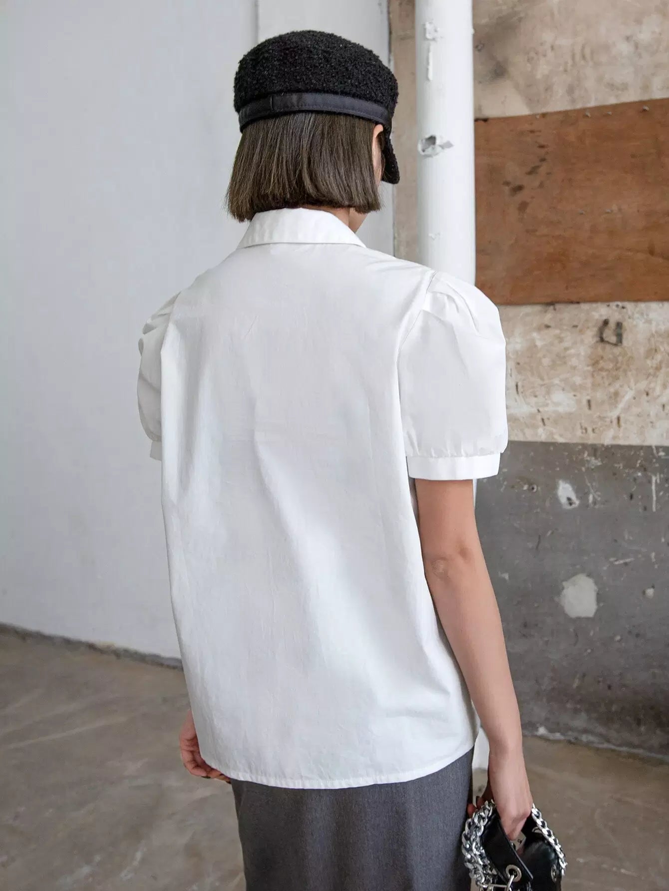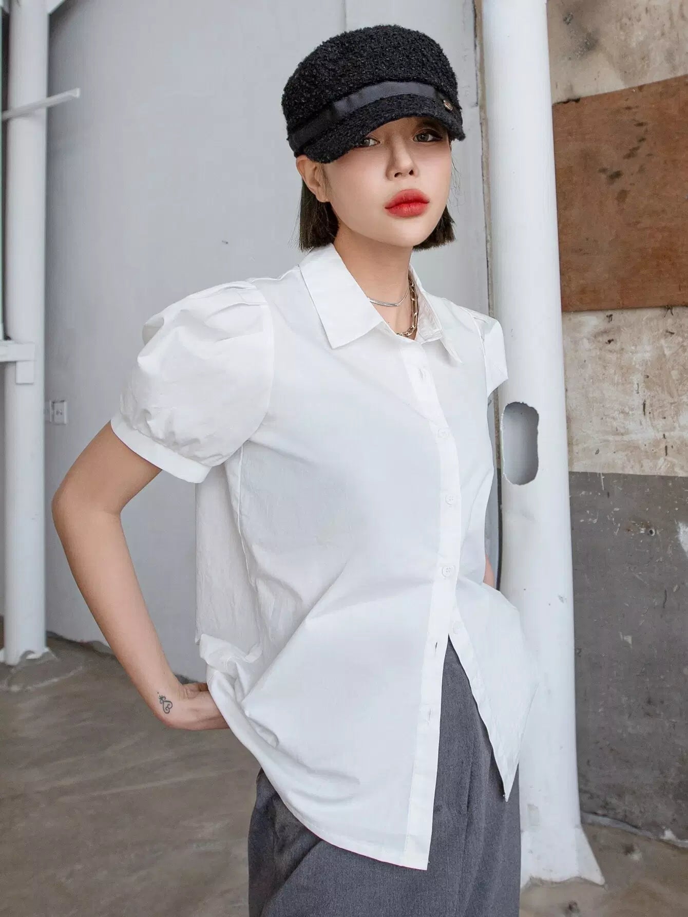 قميص سادة بأزرار أمامية بأكمام منفوخة بأزرار سادة
