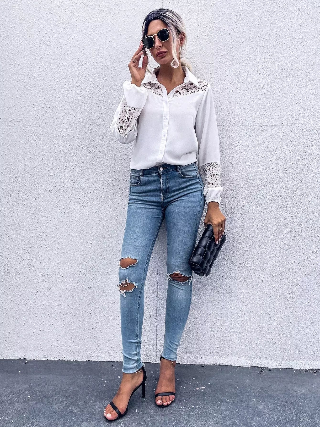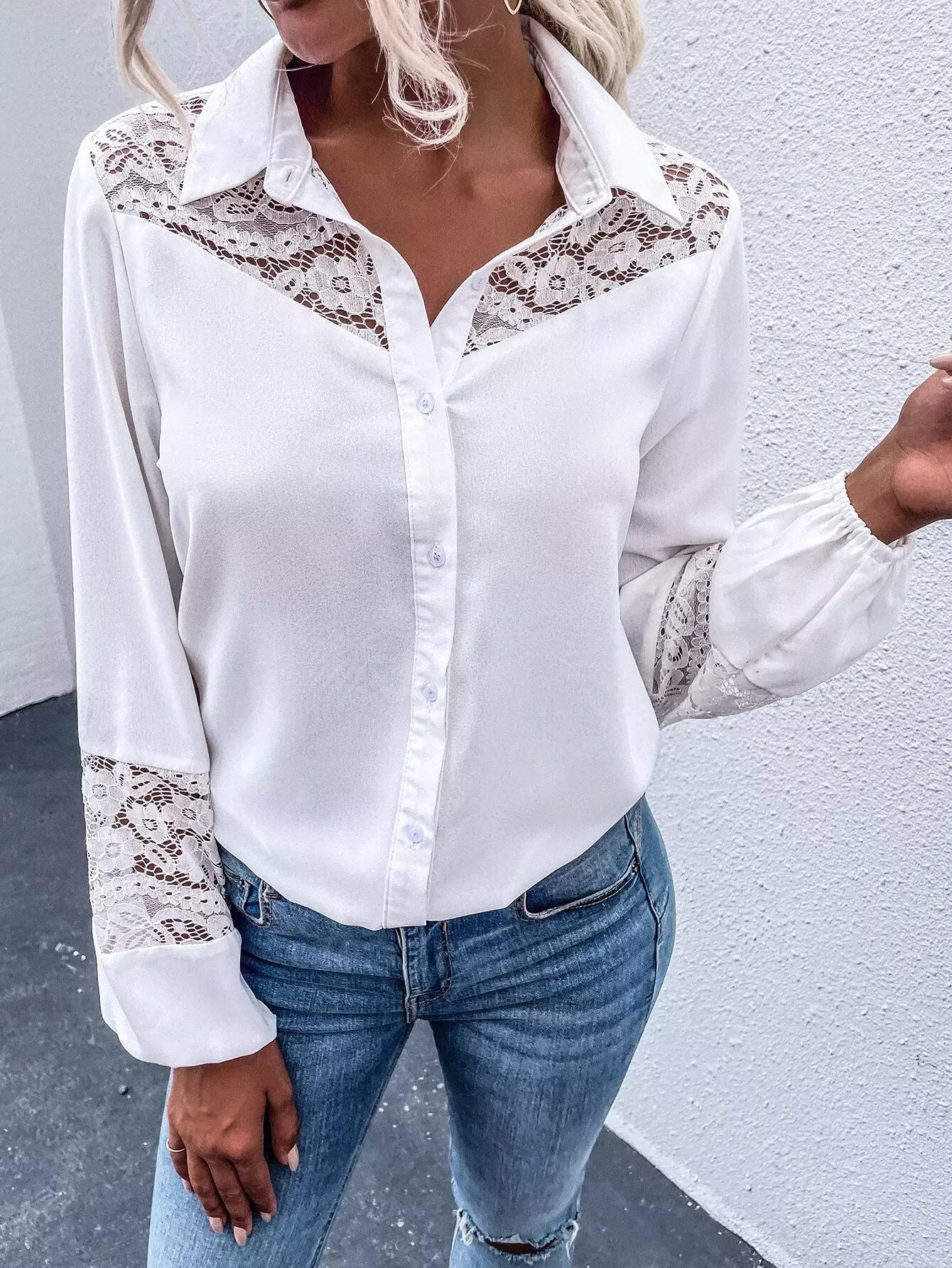 قميص بأزرار من الدانتيل بلون متباين سادة