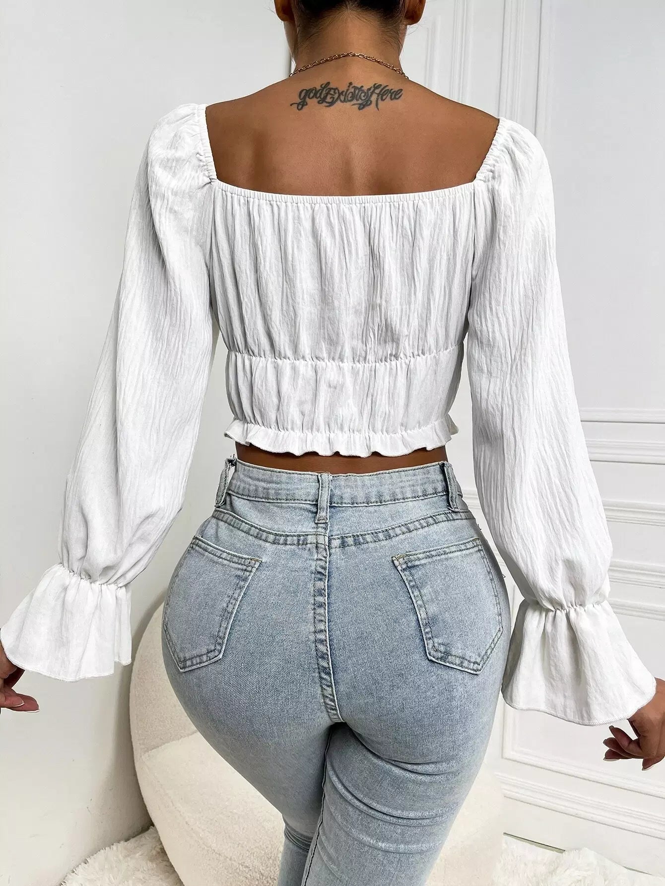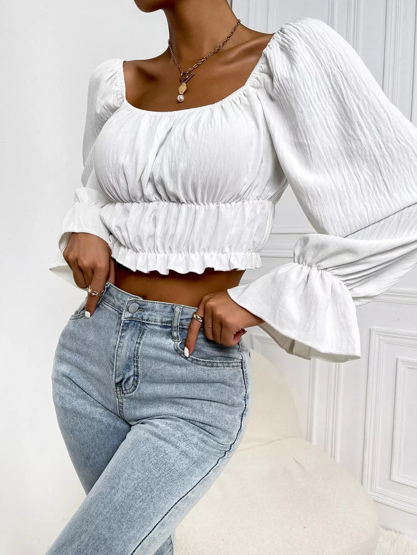 بلوزة سادة بأكمام منفوشة بأكمام منفوشة قصيرة