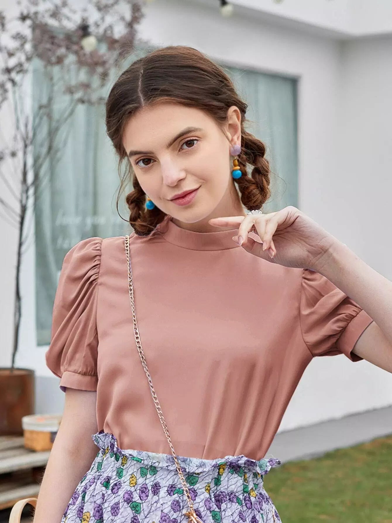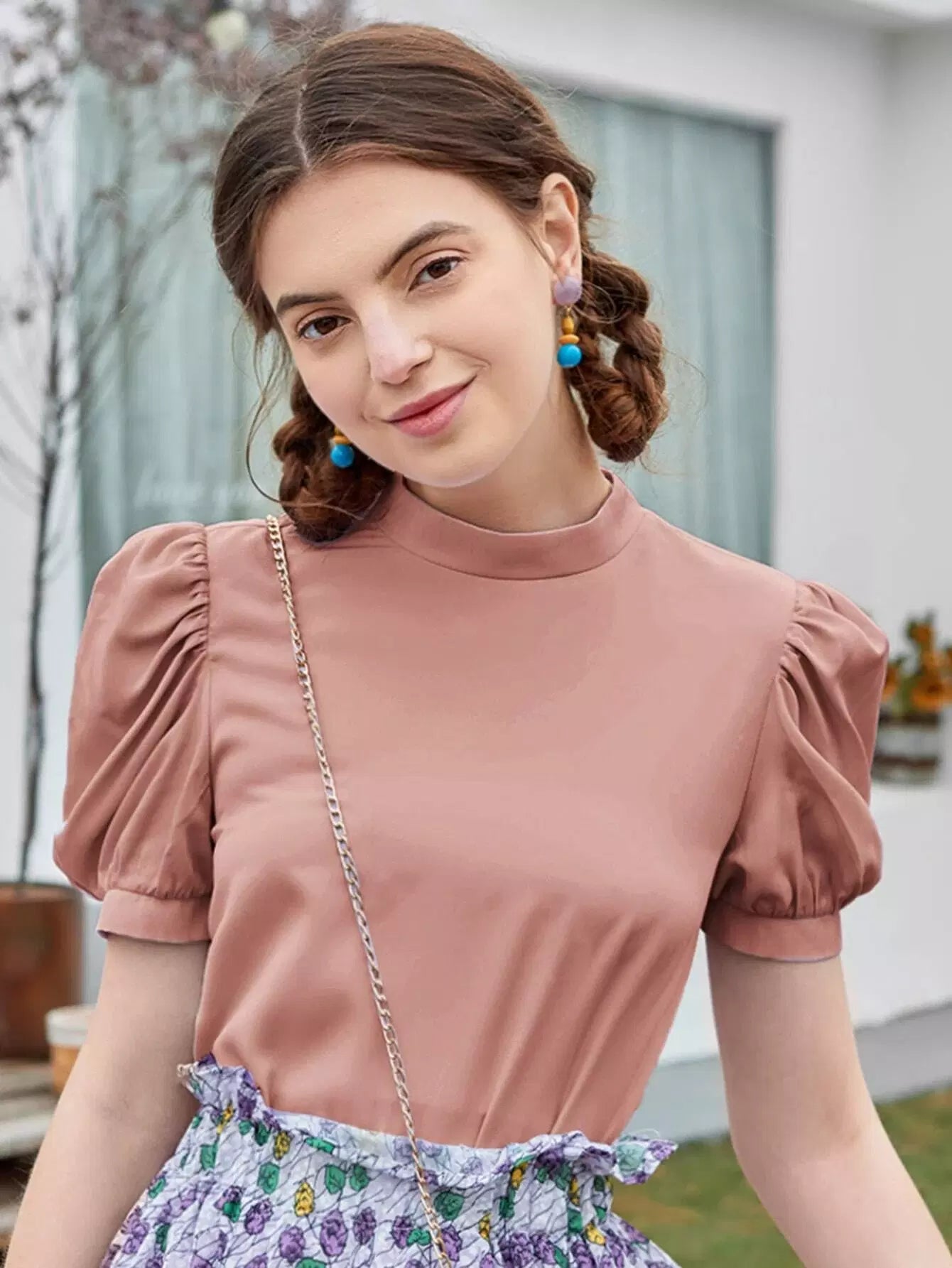 بلوزة سادة بأكمام منفوخة وأزرار وفتحة مفتاح