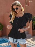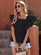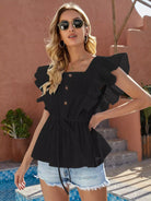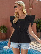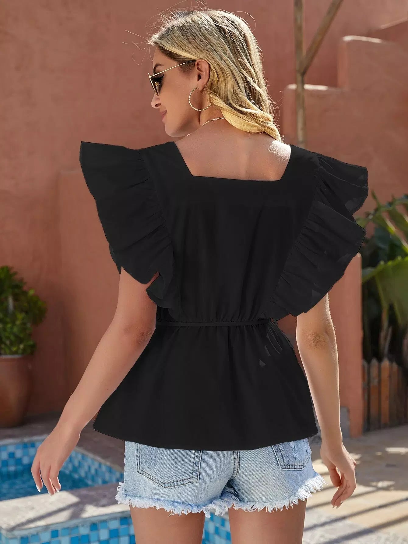 بلوزة برقبة مربعة ومزخرفة بكشكشة صلبة بدون حزام