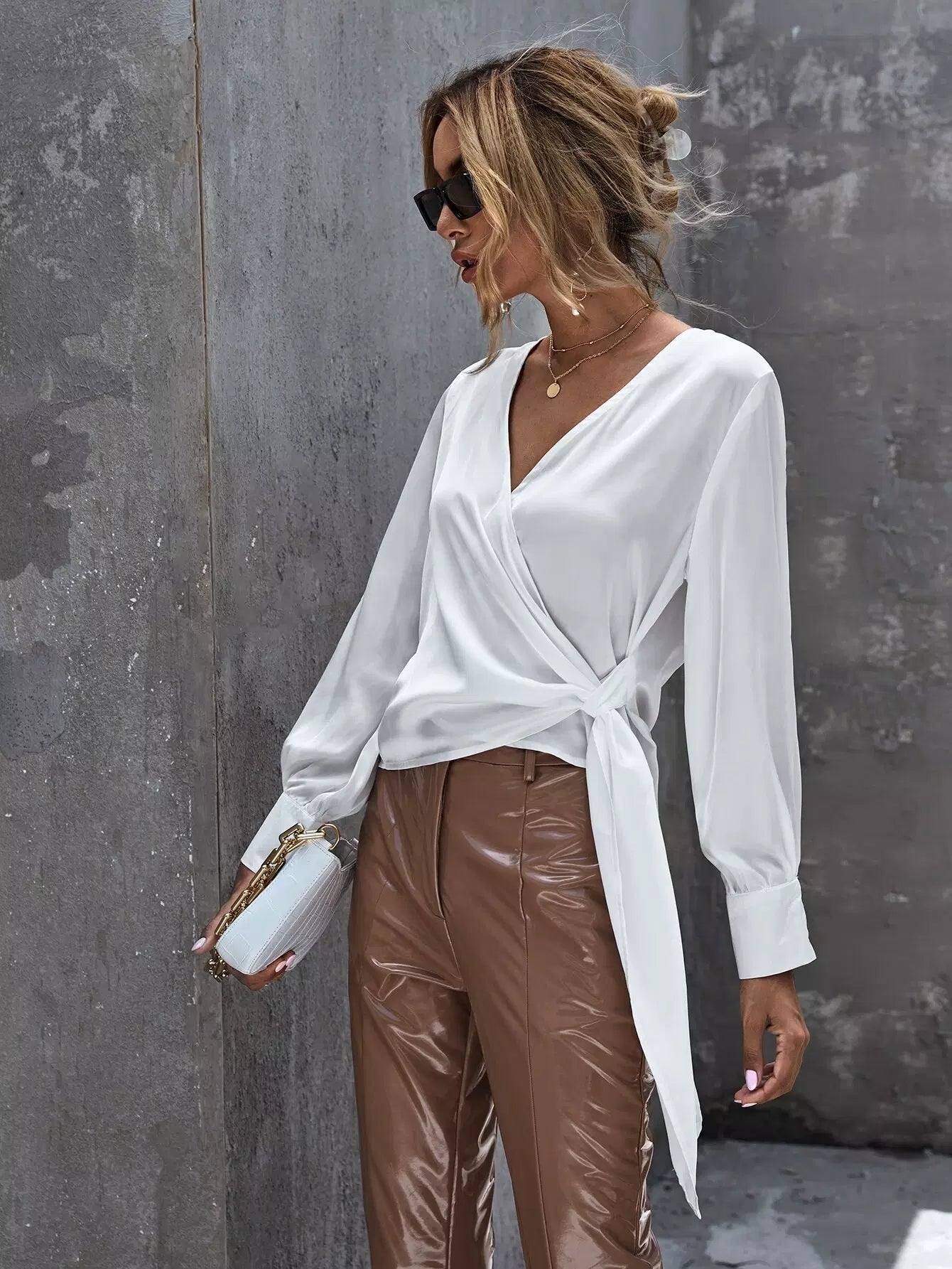 بلوزة سادة ملفوفة بربطة عنق أمامية سادة