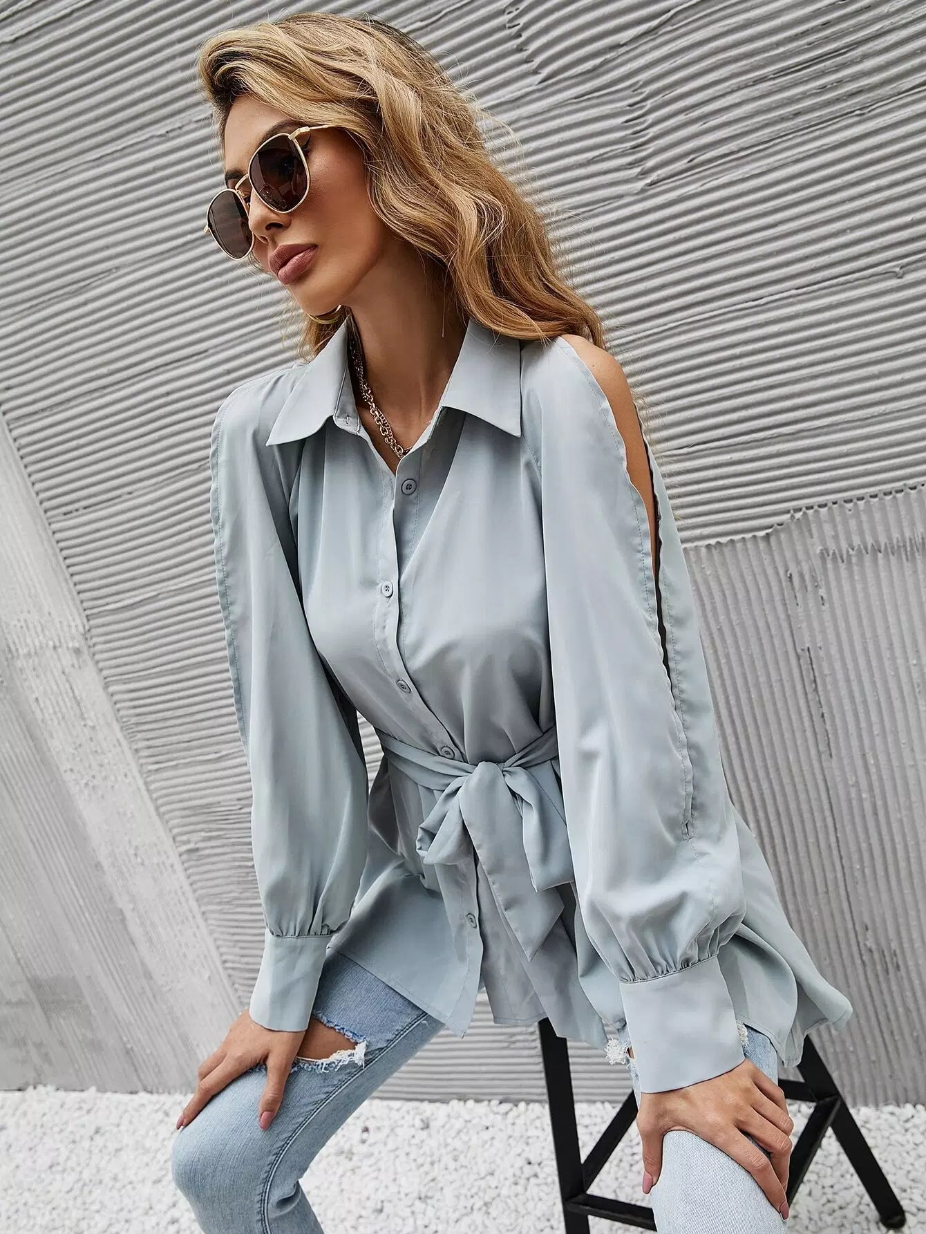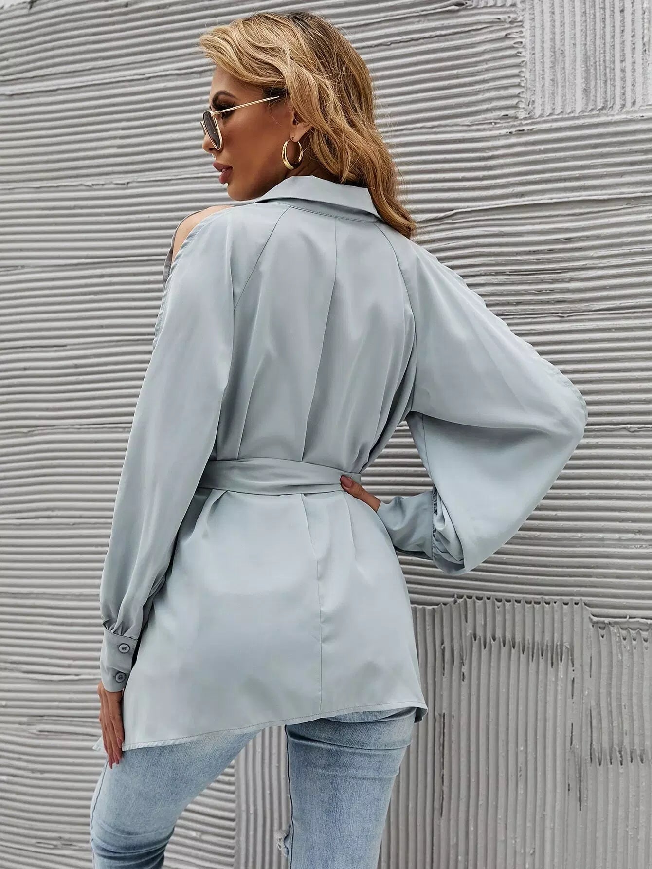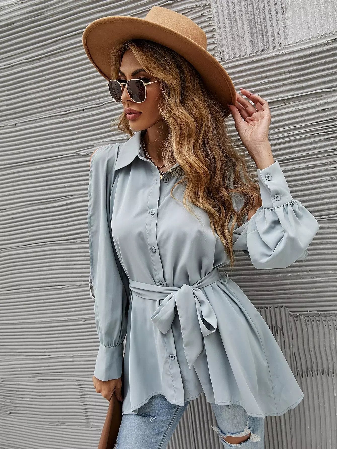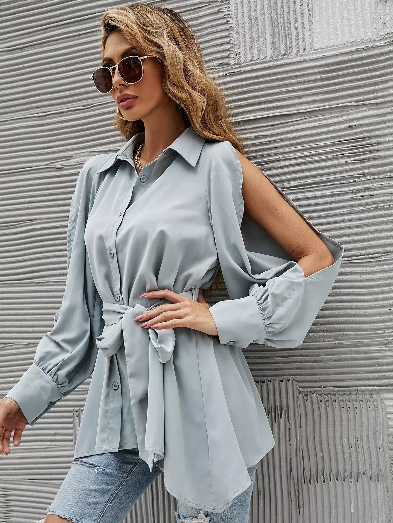 قميص طويل الأكمام منقسم بدون حزام