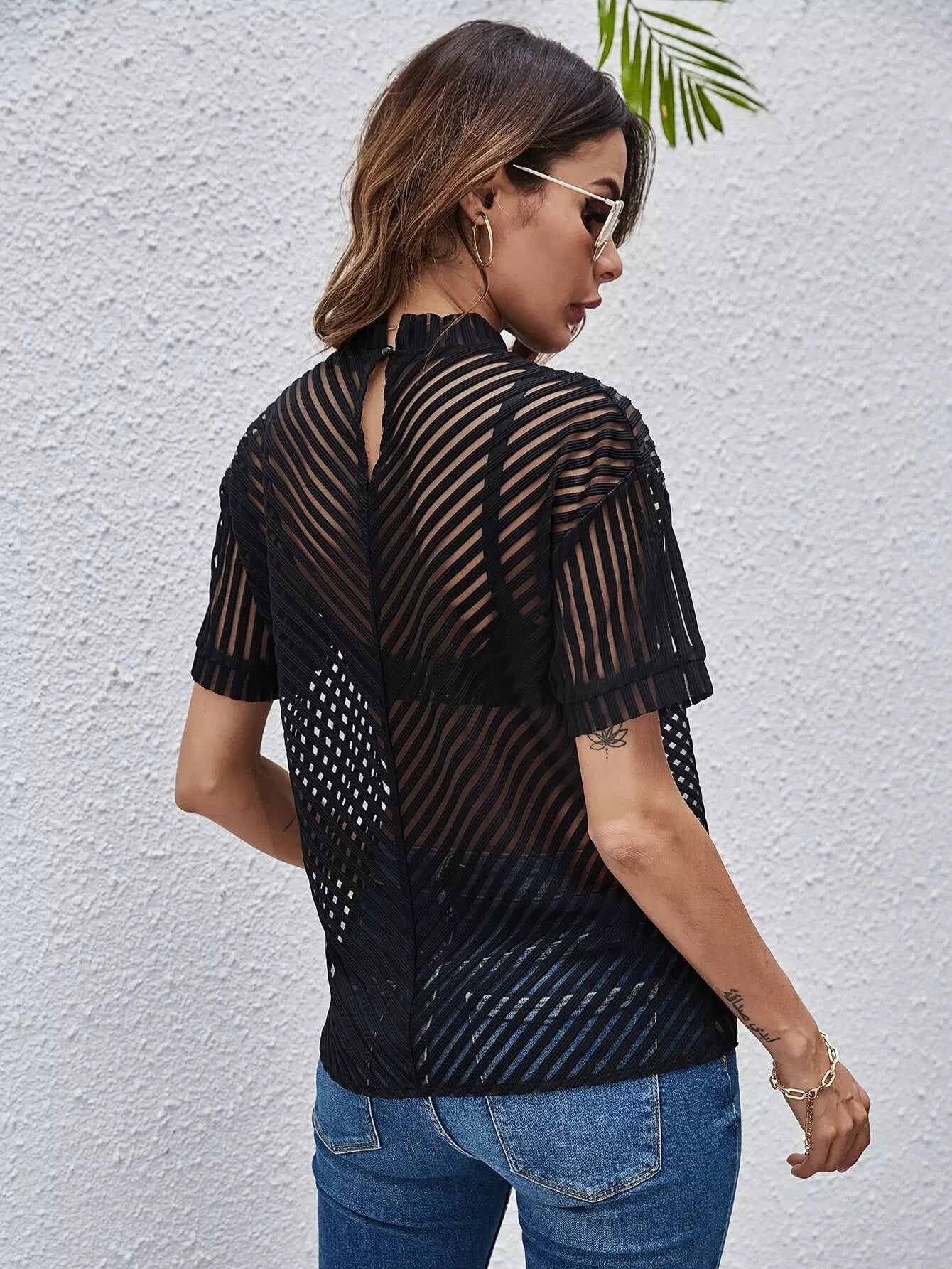 بلوزة شفافة مخططة بفتحة رقبة على شكل مفتاح بدون حمالة صدر