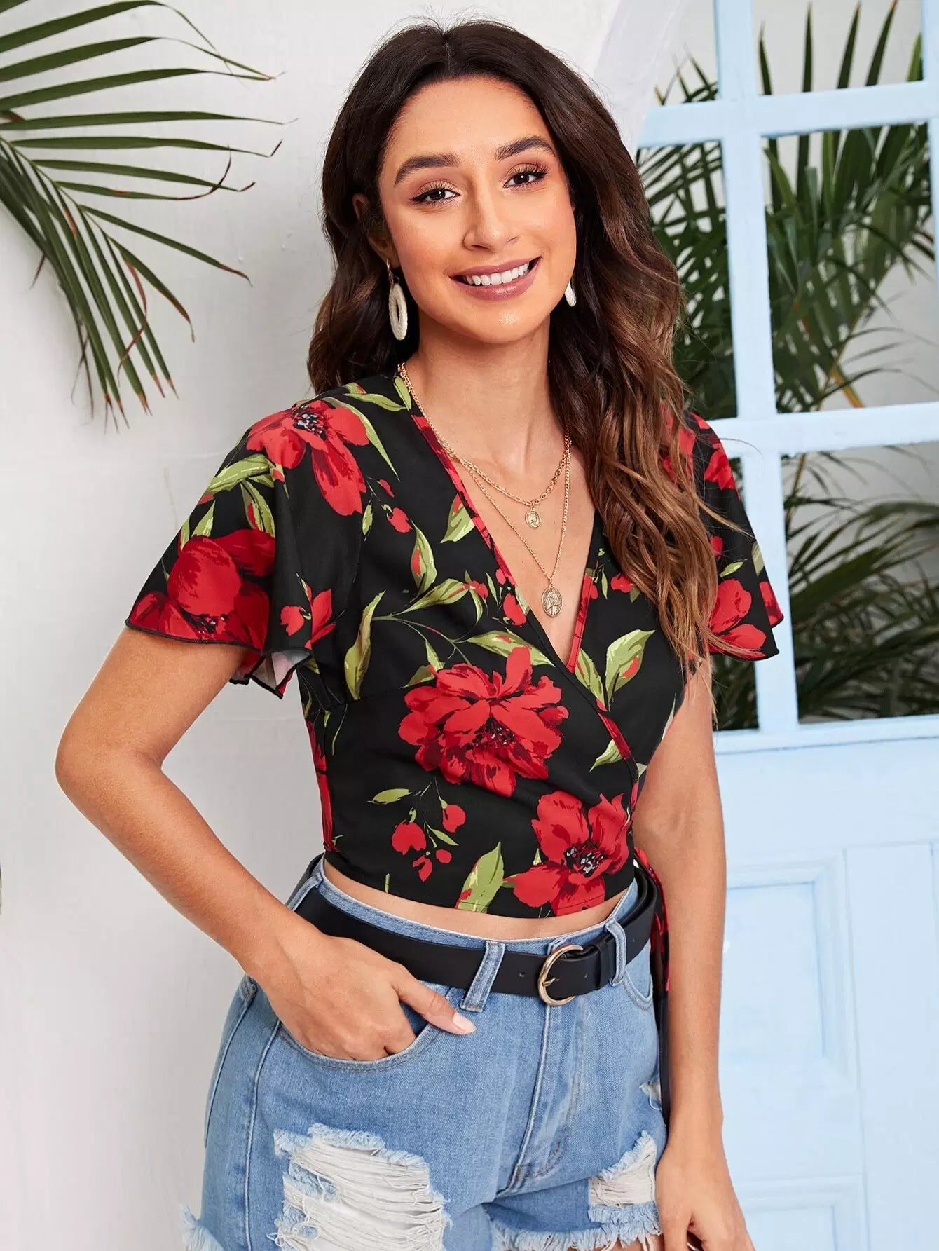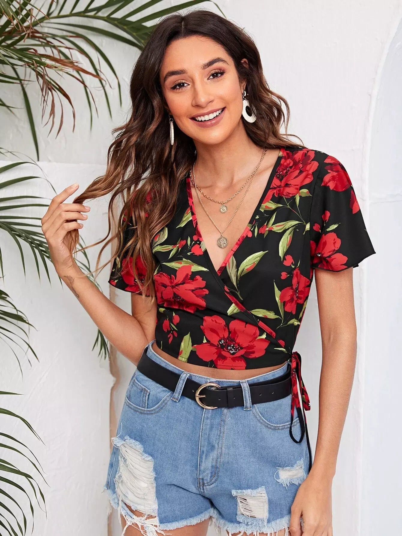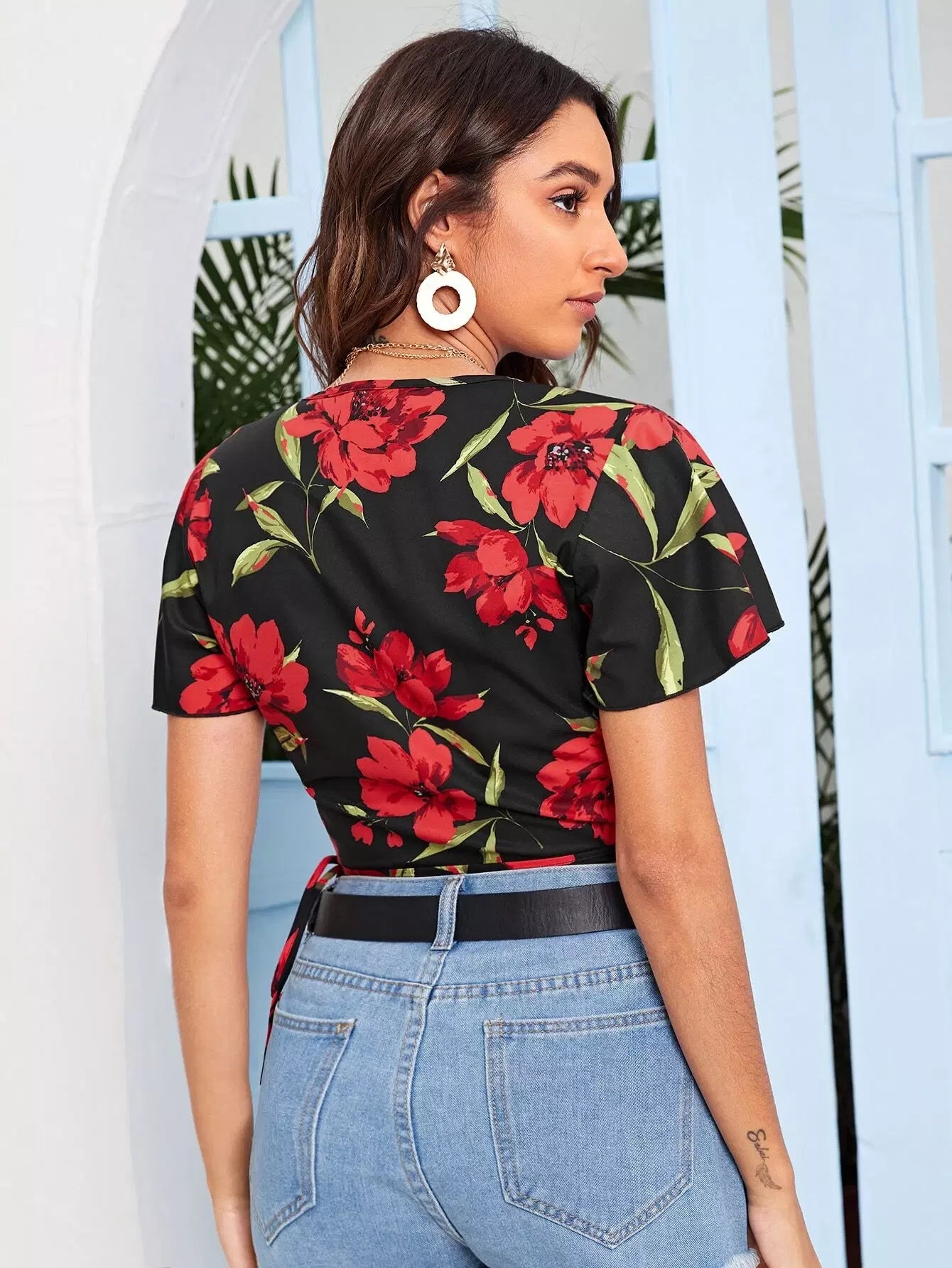 بلوزة سوربليس ملفوفة بعقدة جانبية مزخرفة بالزهور