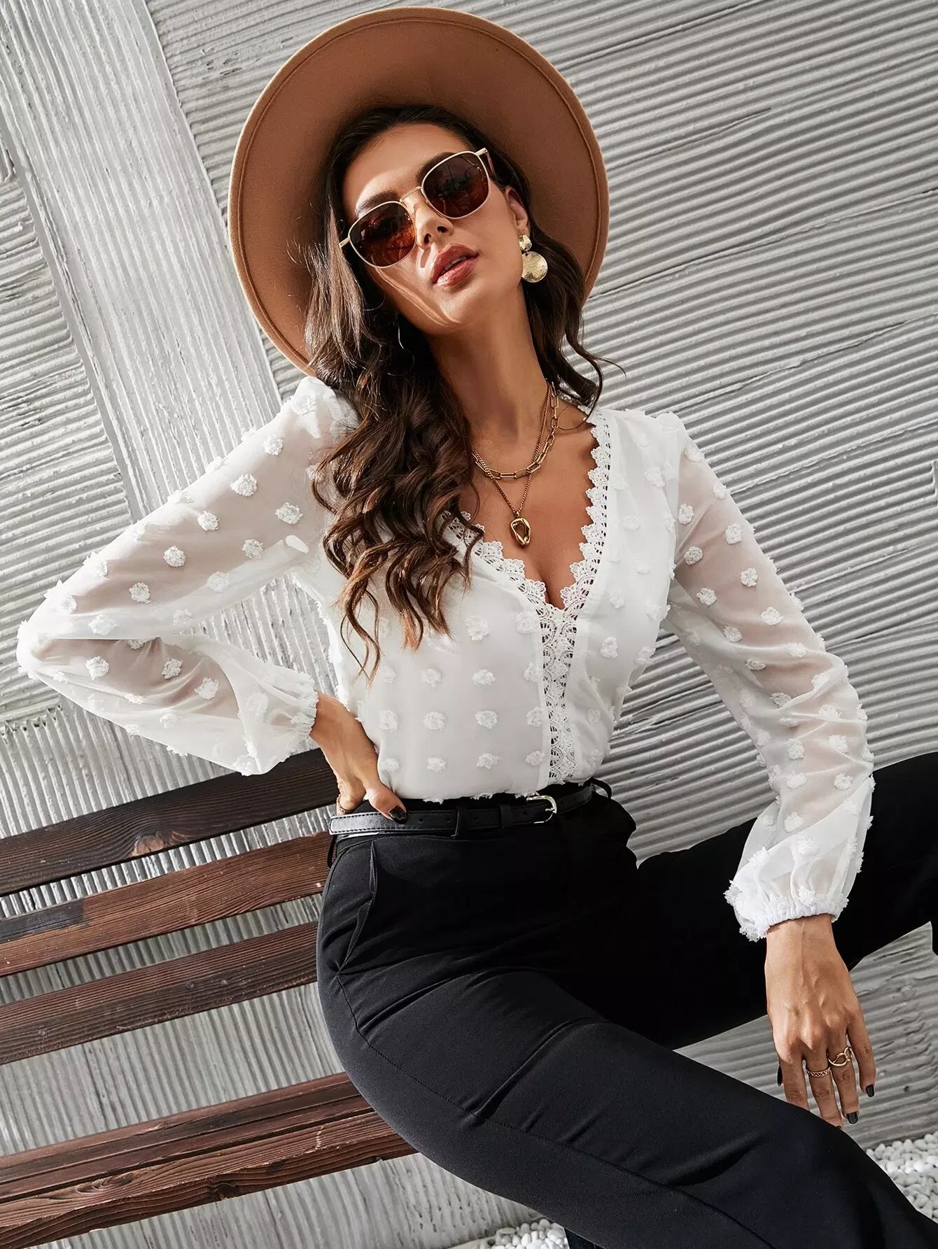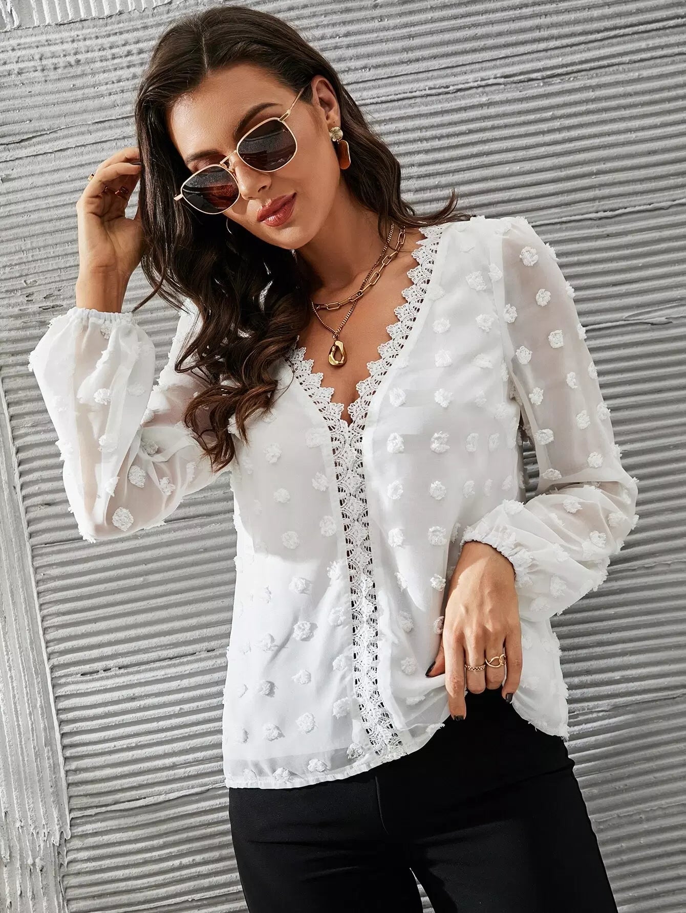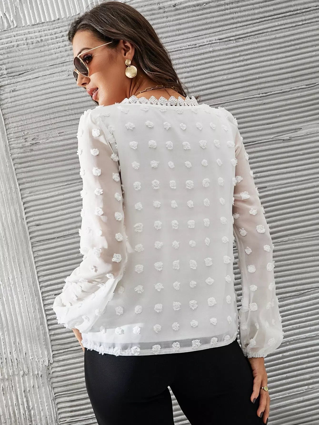 بلوزة بأكمام دانتيل من الدانتيل المخرم المنقط السويسري