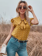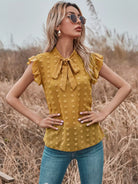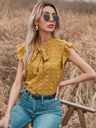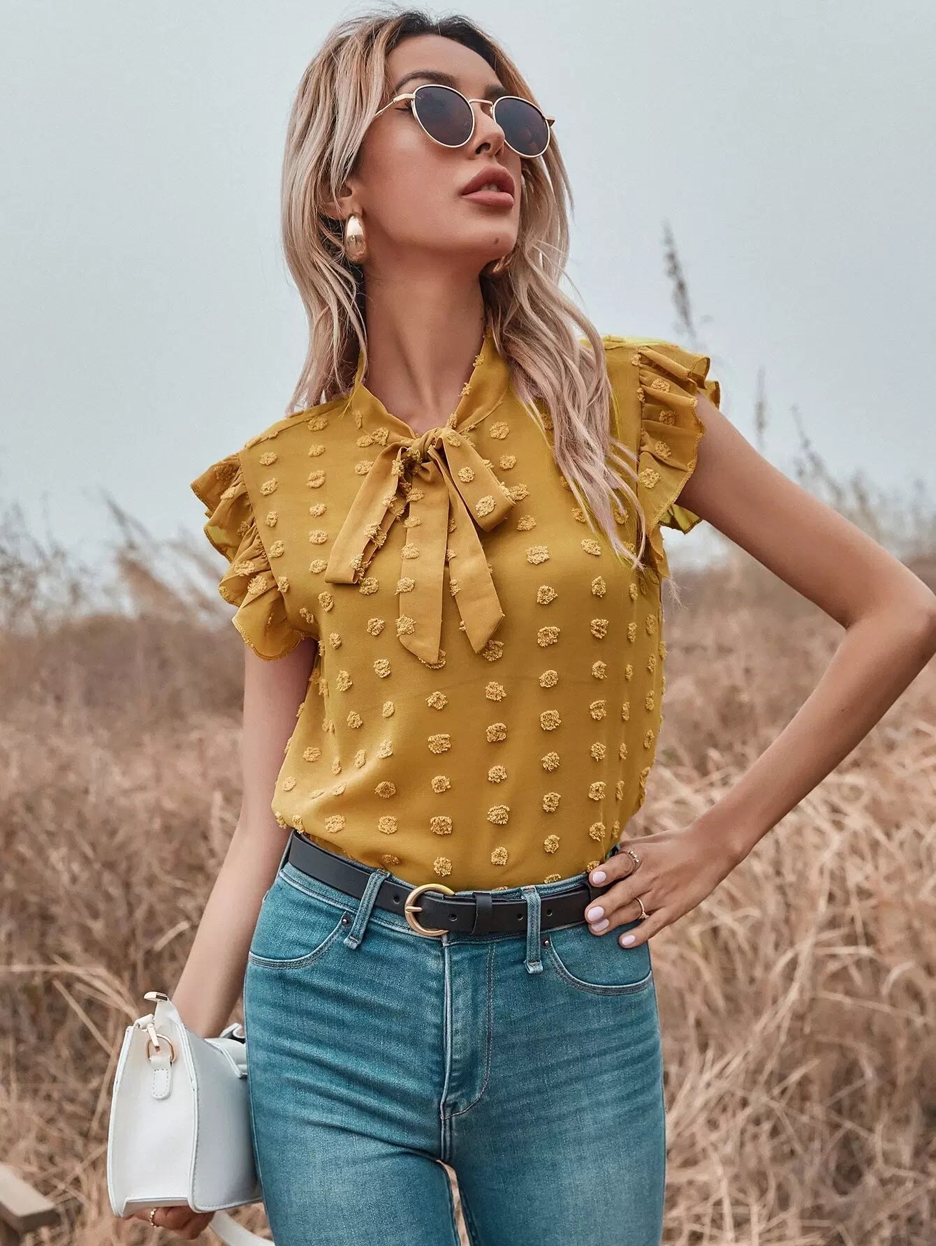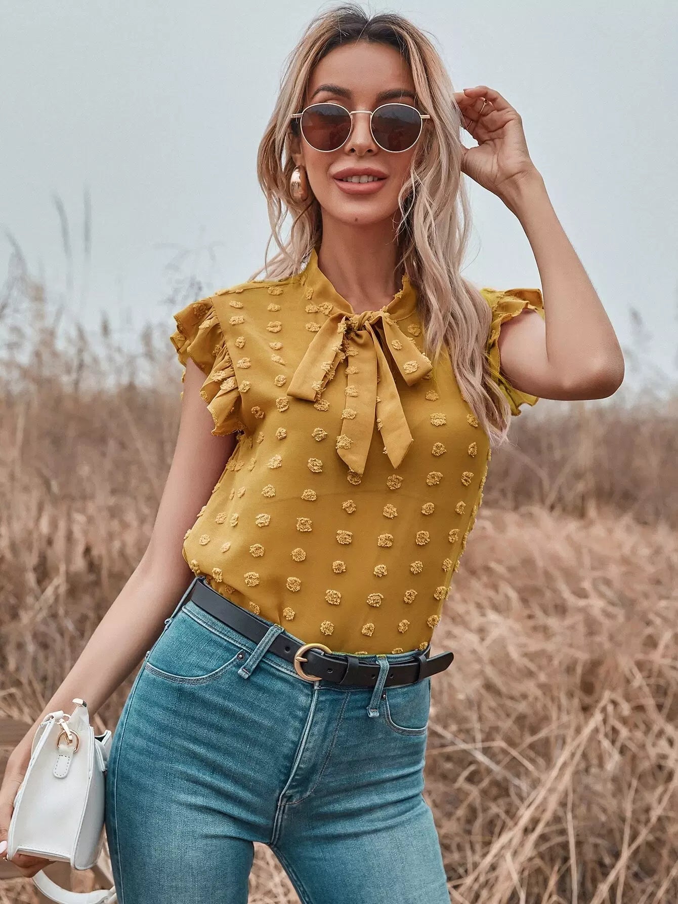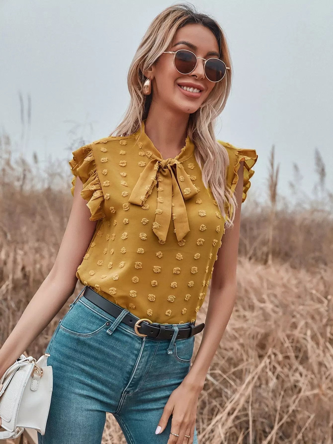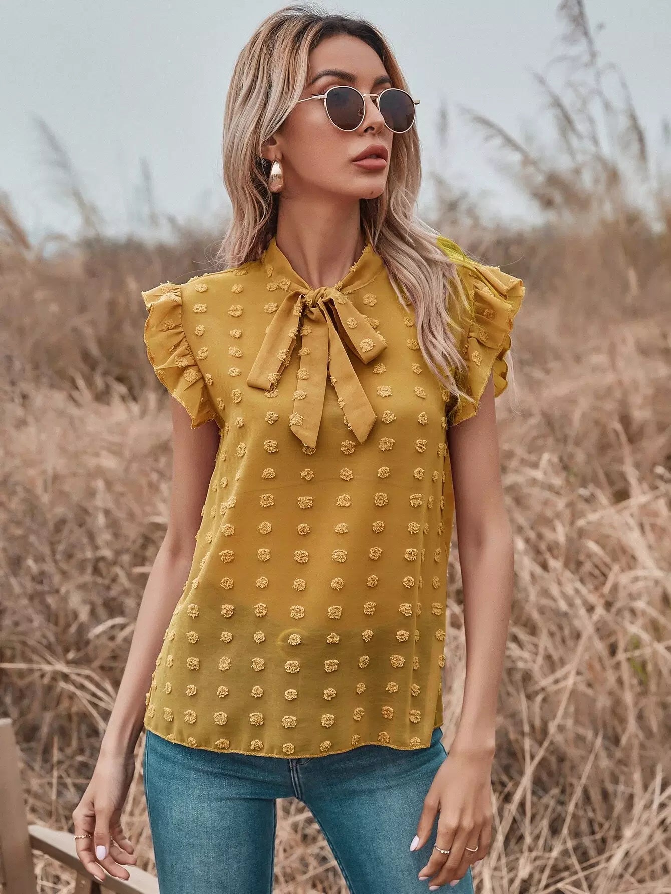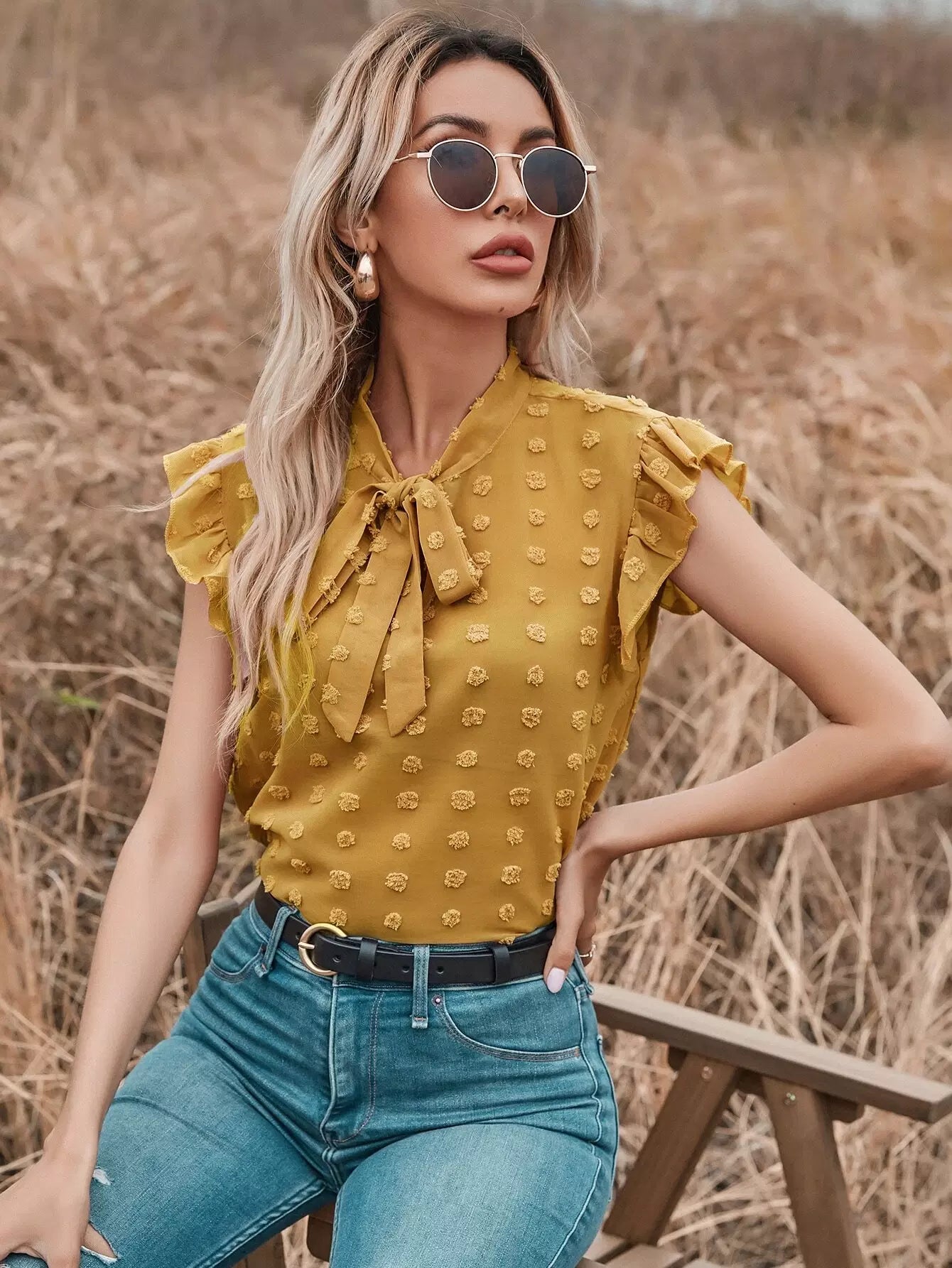 بلوزة سويسرية منقطة بربطة عنق من الشيفون الشفاف