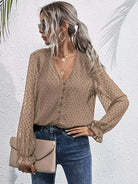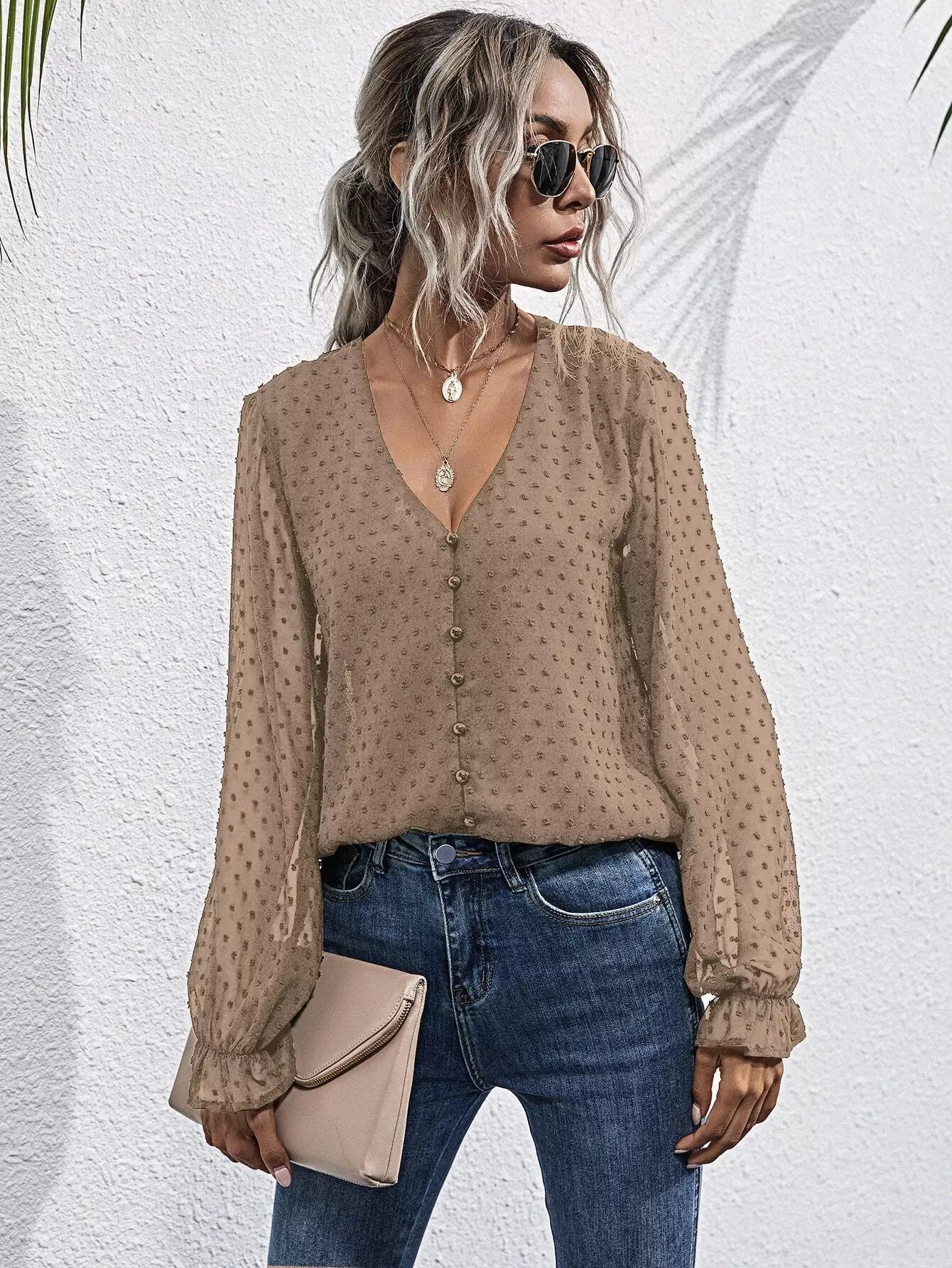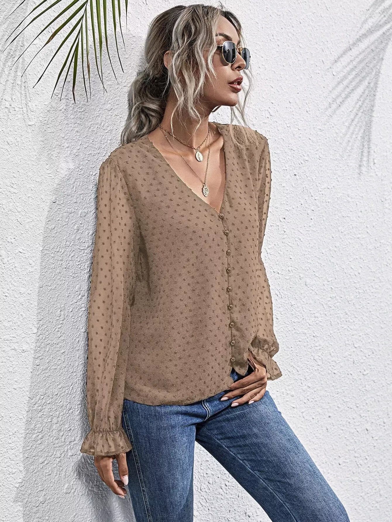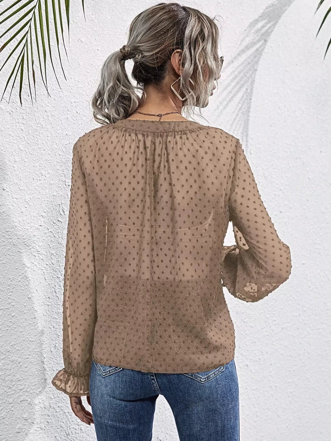 بلوزة شيفون منقطة سويسرية بفتحة رقبة على شكل حرف V وأكمام مكشكشة