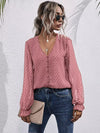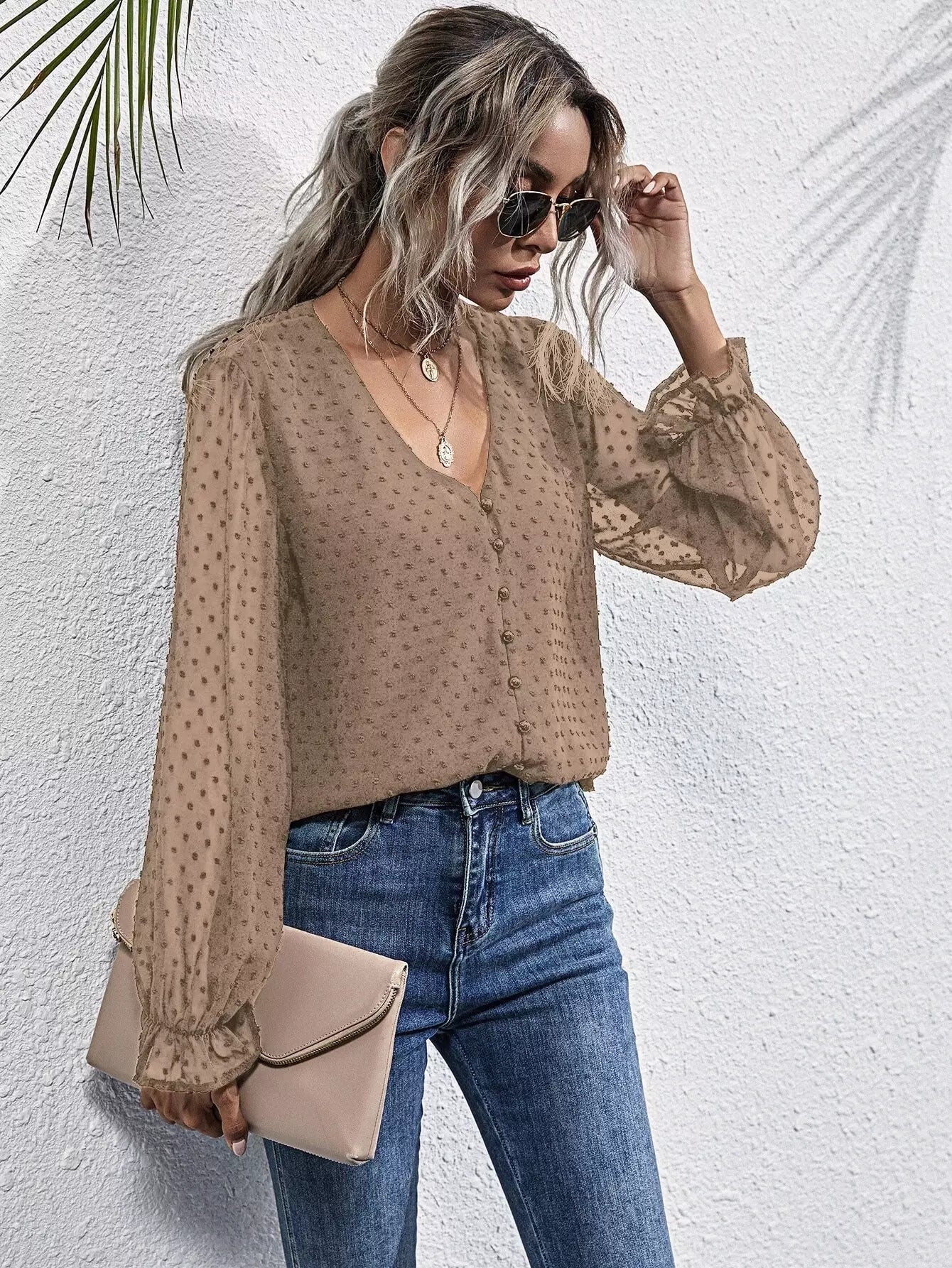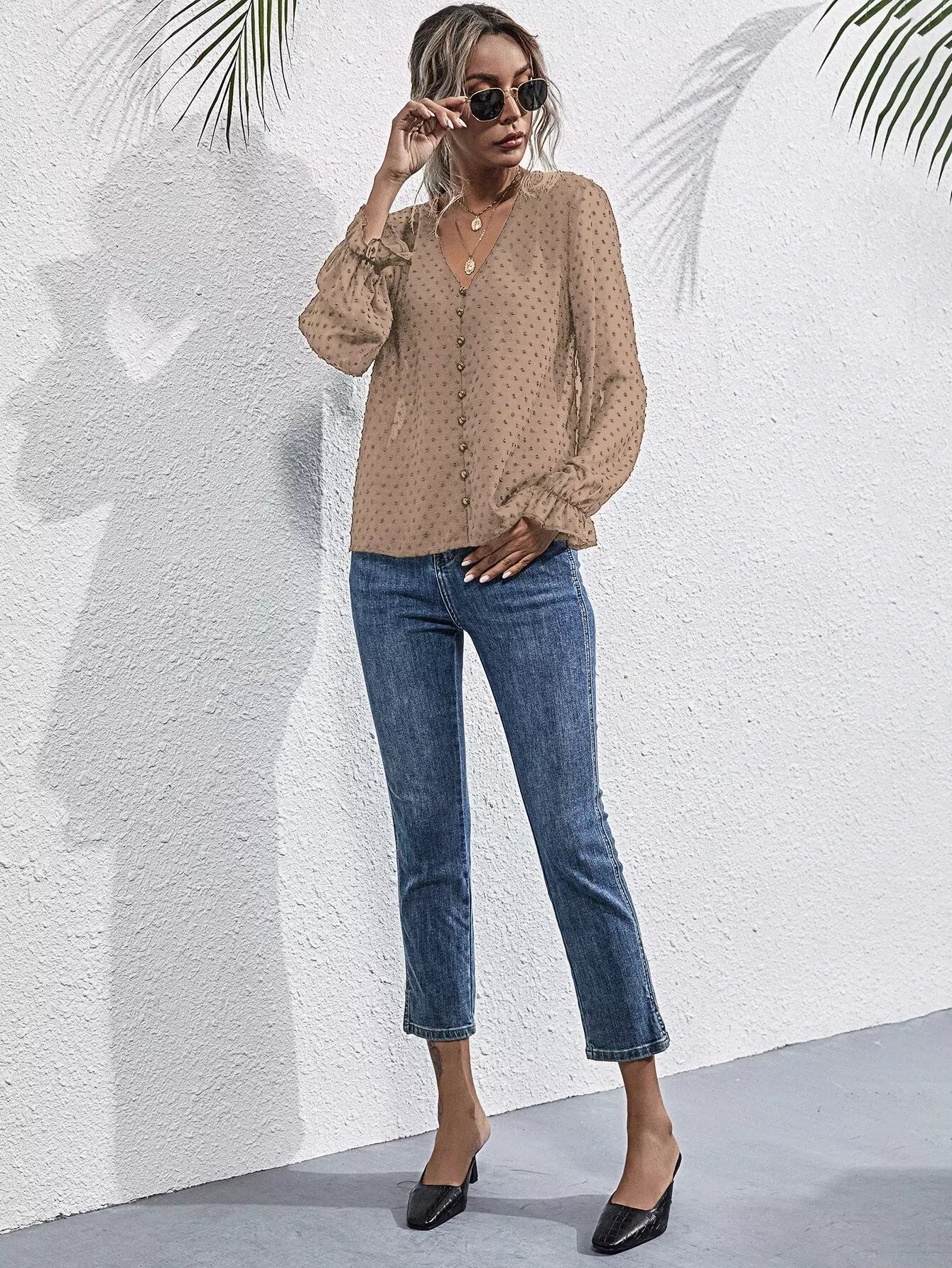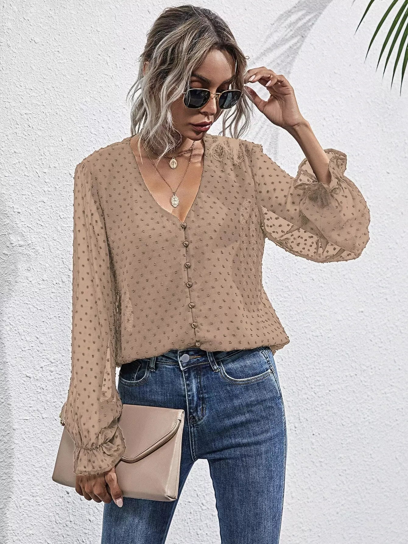 بلوزة شيفون منقطة سويسرية بفتحة رقبة على شكل حرف V وأكمام مكشكشة