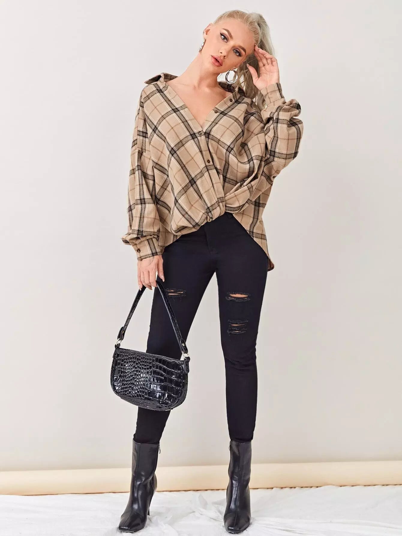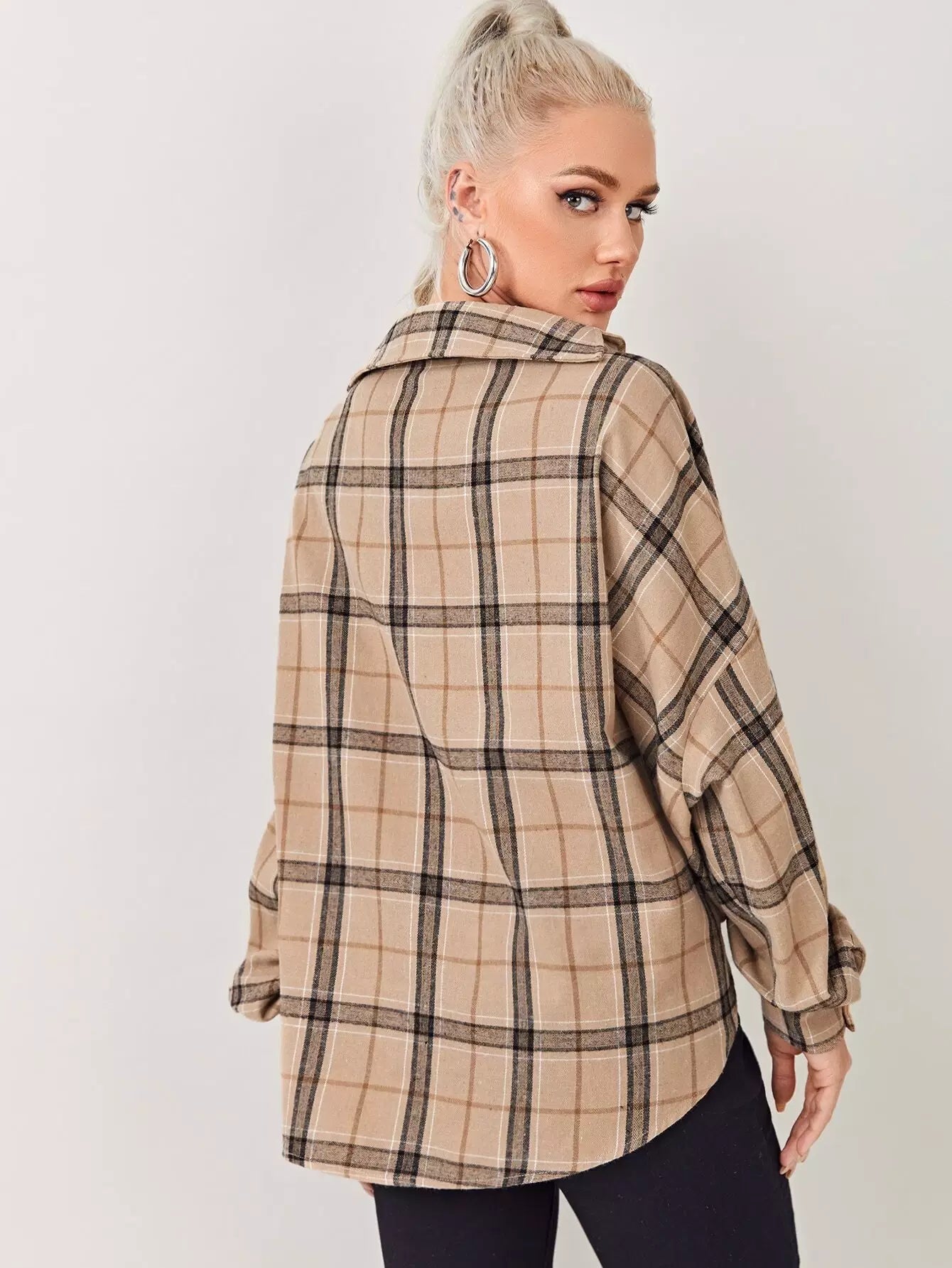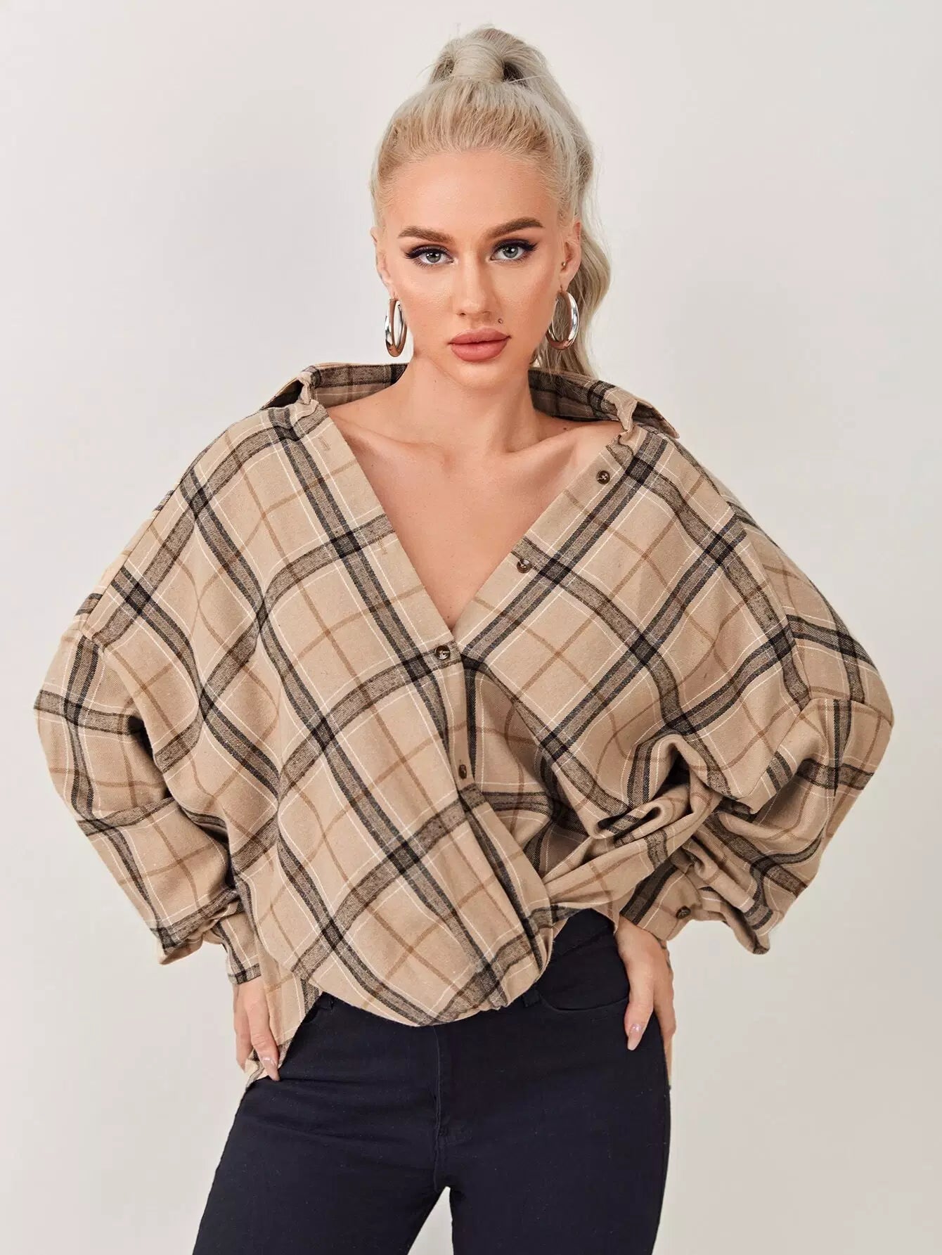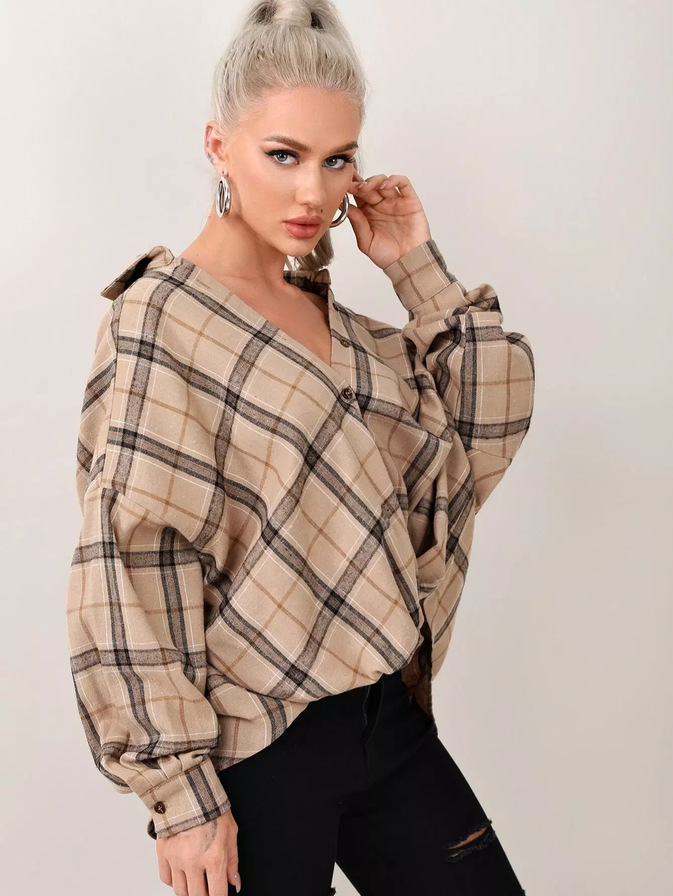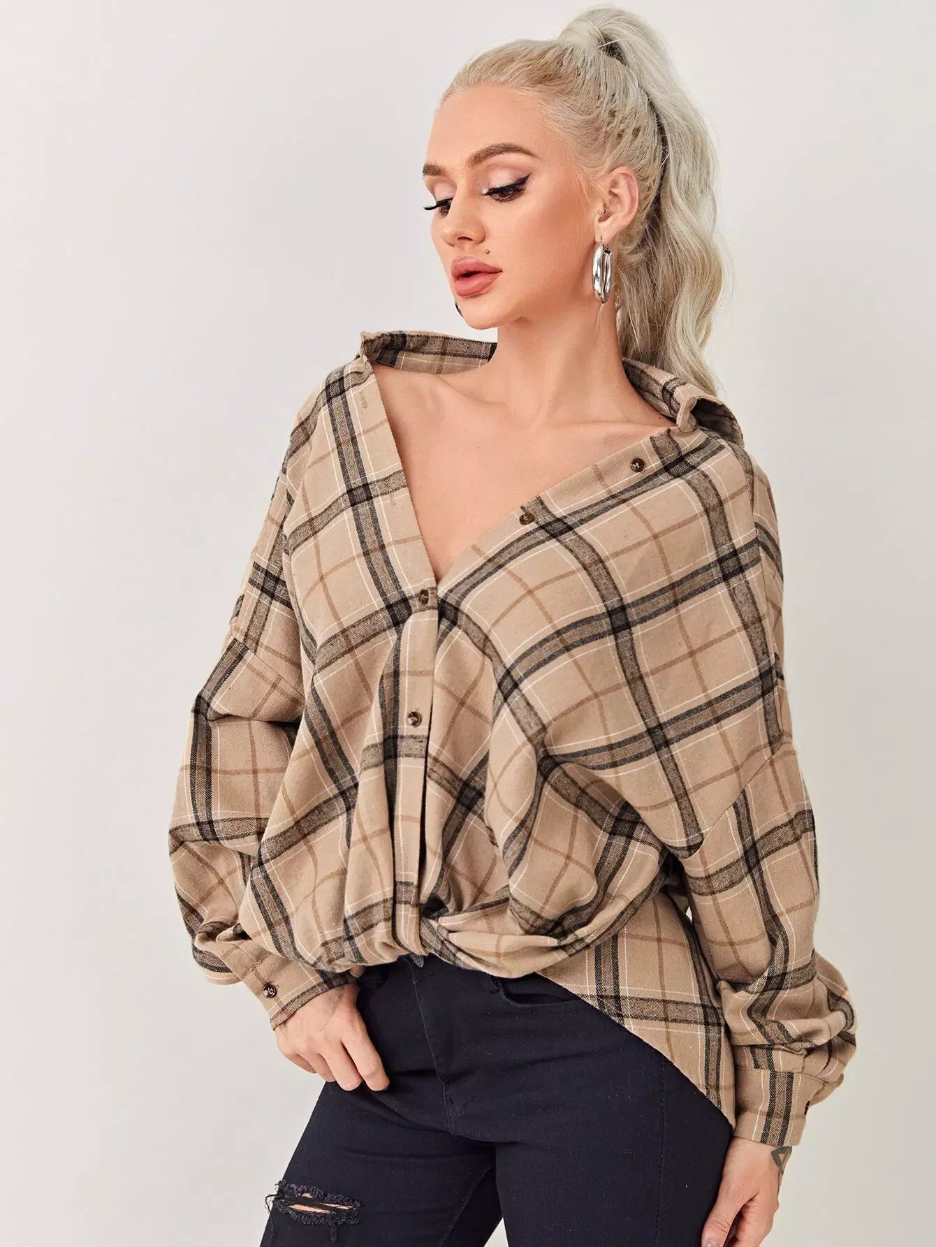 بلوزة تارتان بحاشية تويست عالية منخفضة ملتوية كبيرة الحجم
