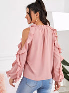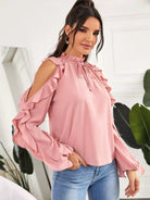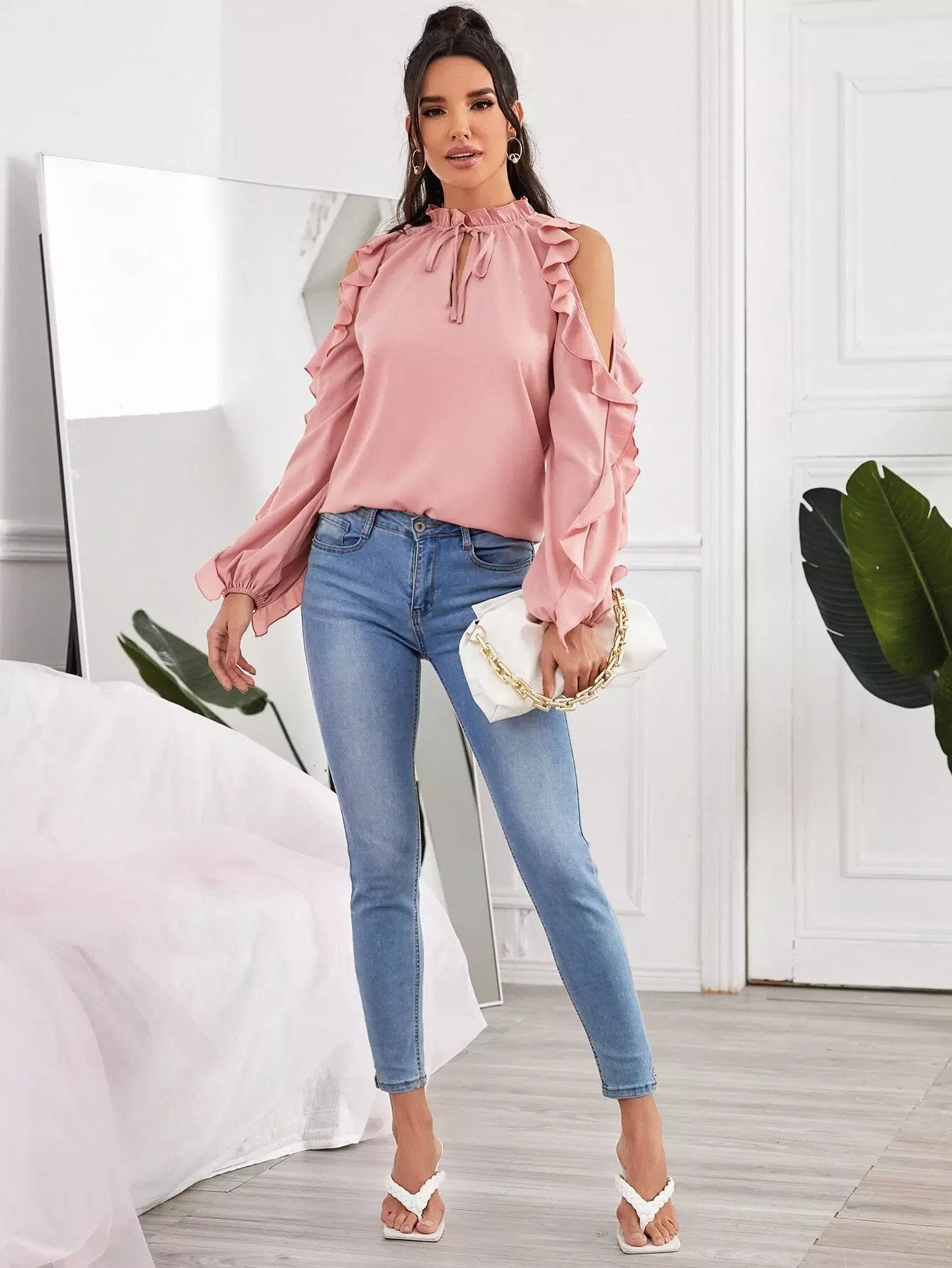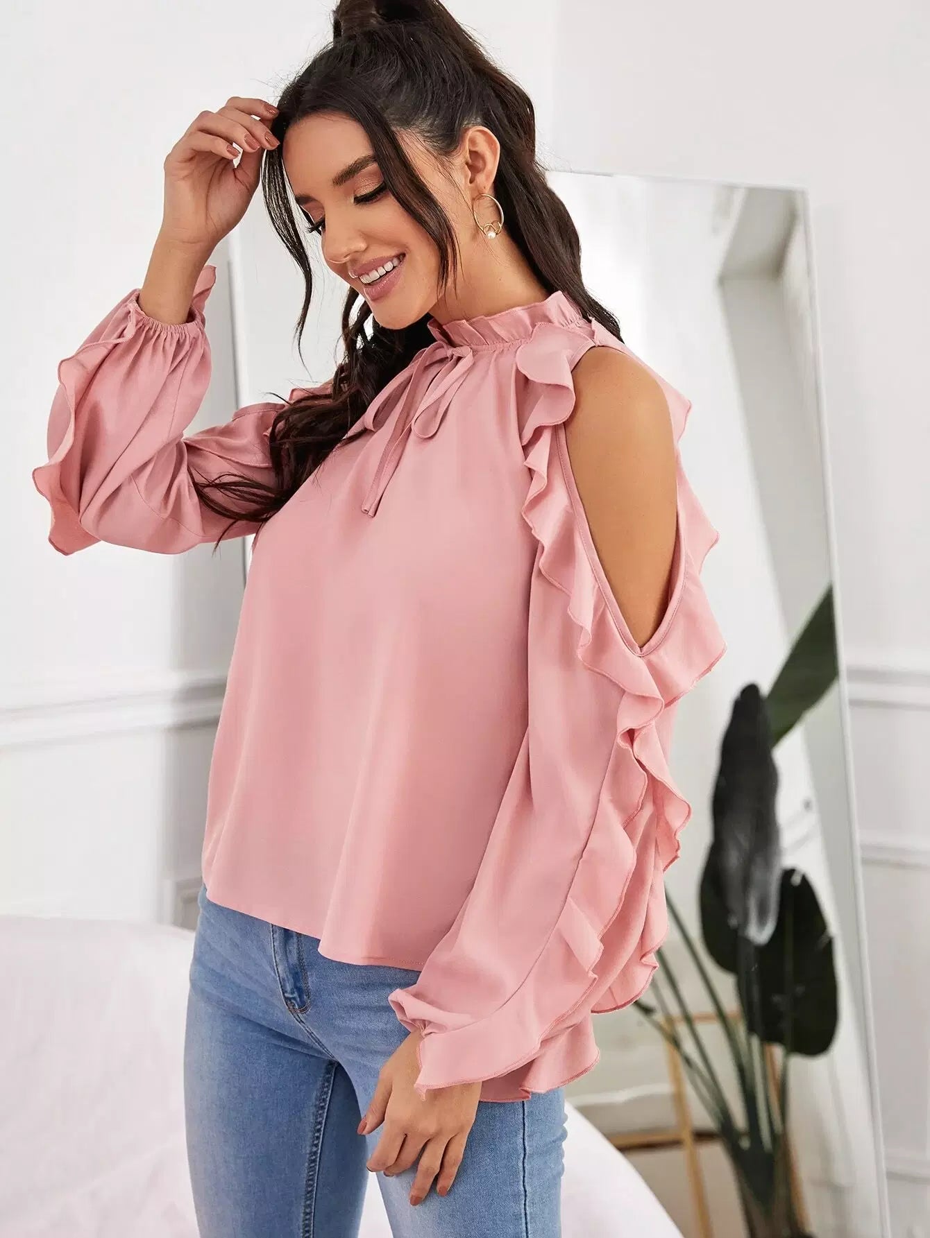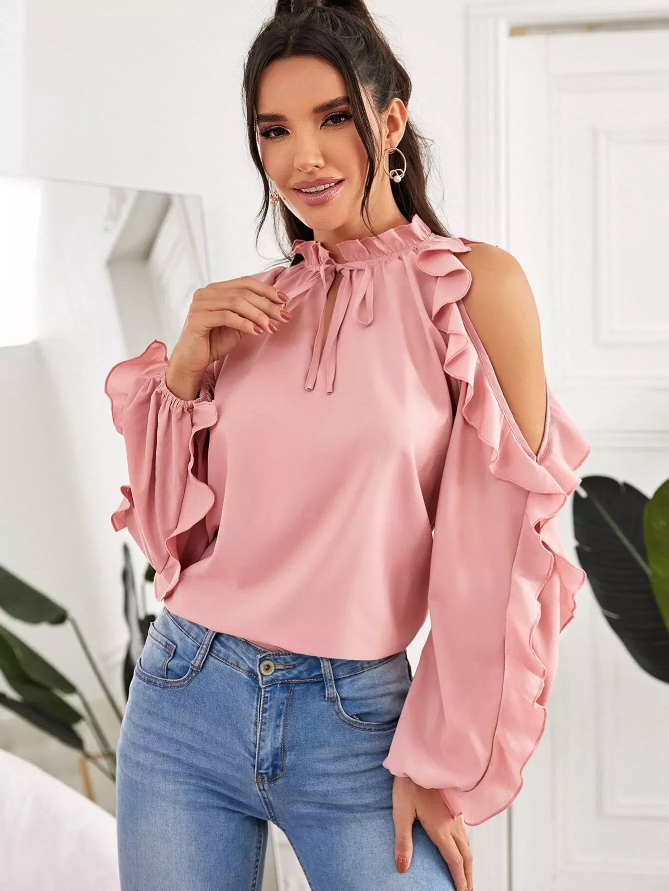 بلوزة مكشكشة برباط على الرقبة وأكتاف مفتوحة