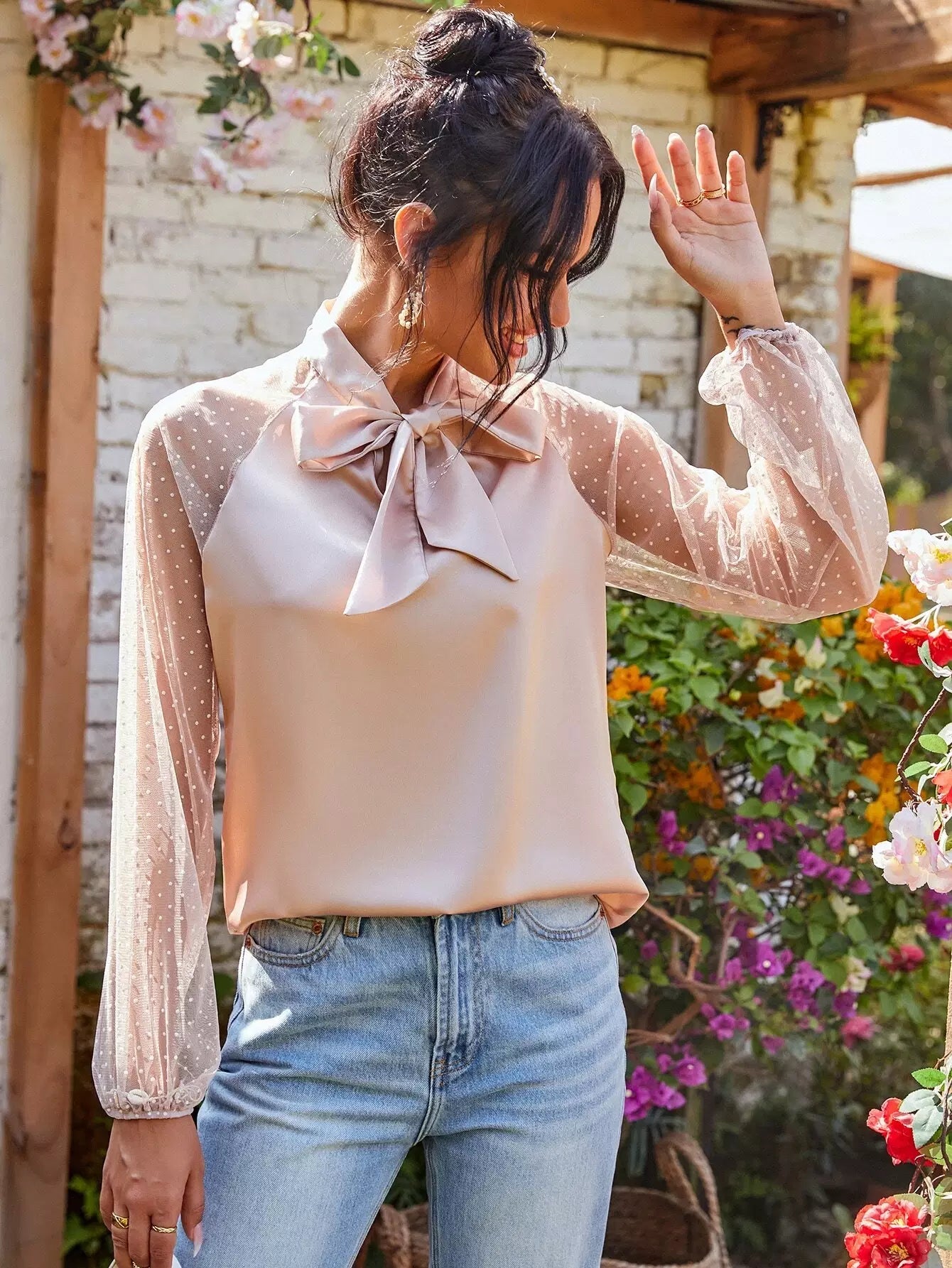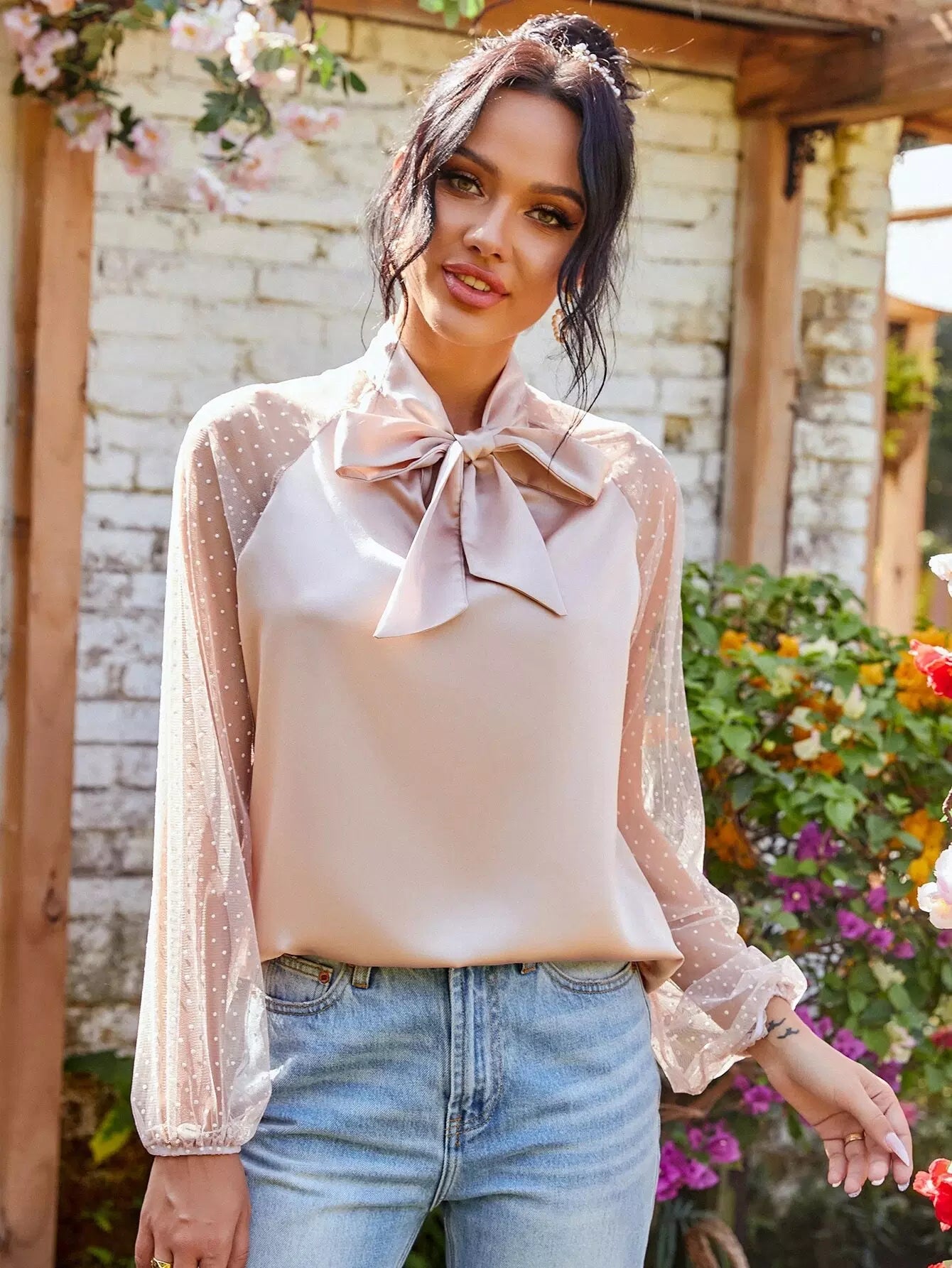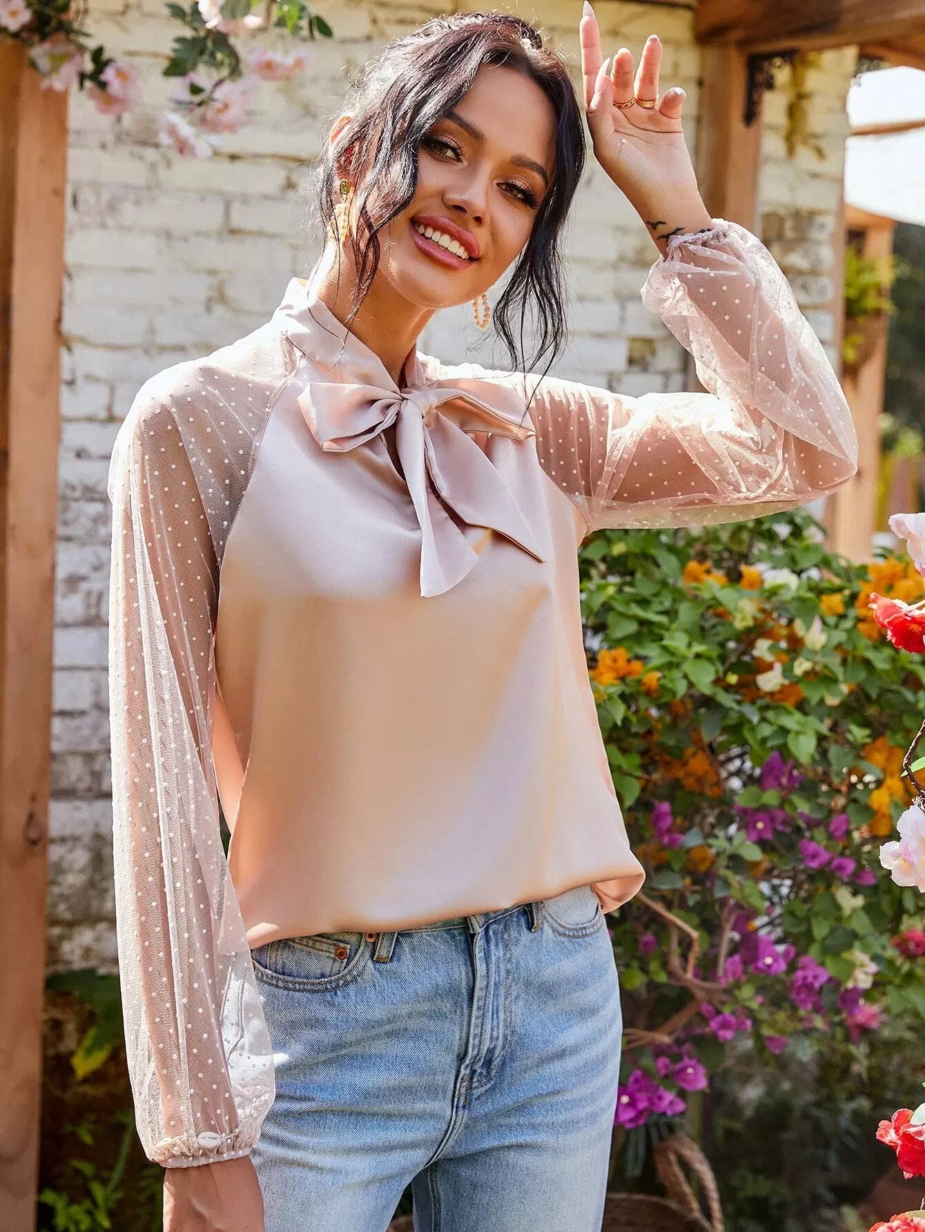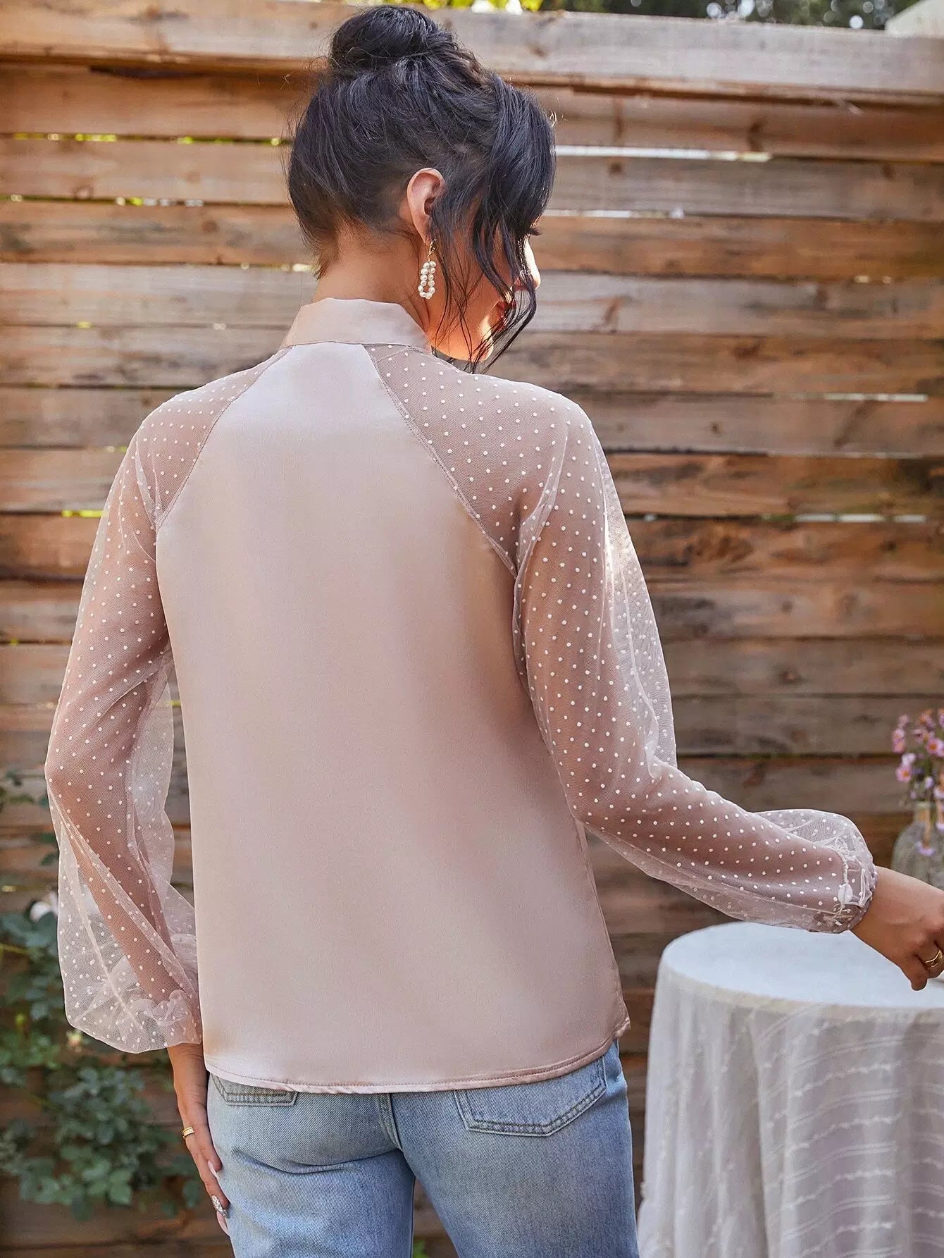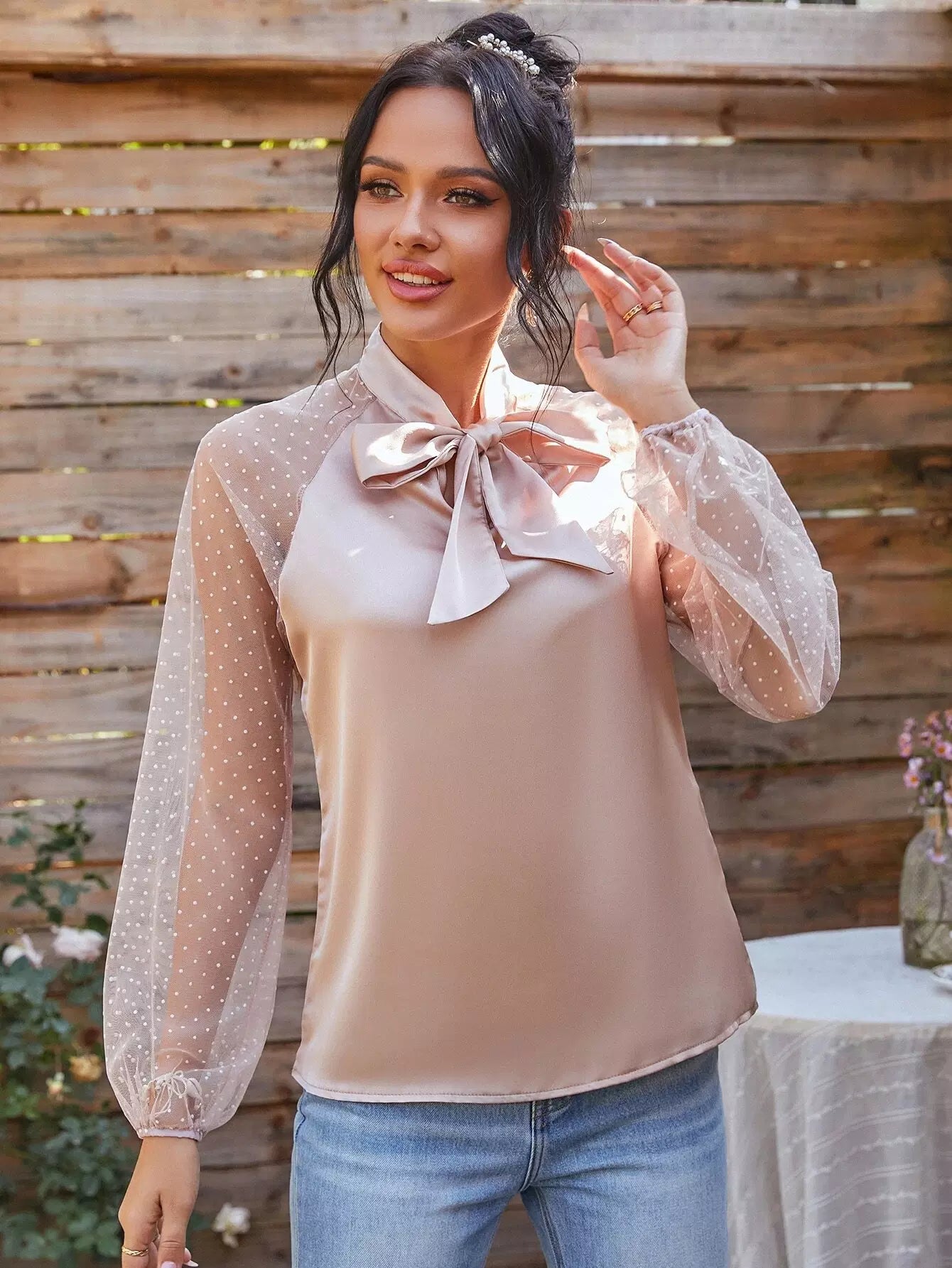البلوزات - بلوزة من الساتان بأكمام شبكية وياقة مربوطة