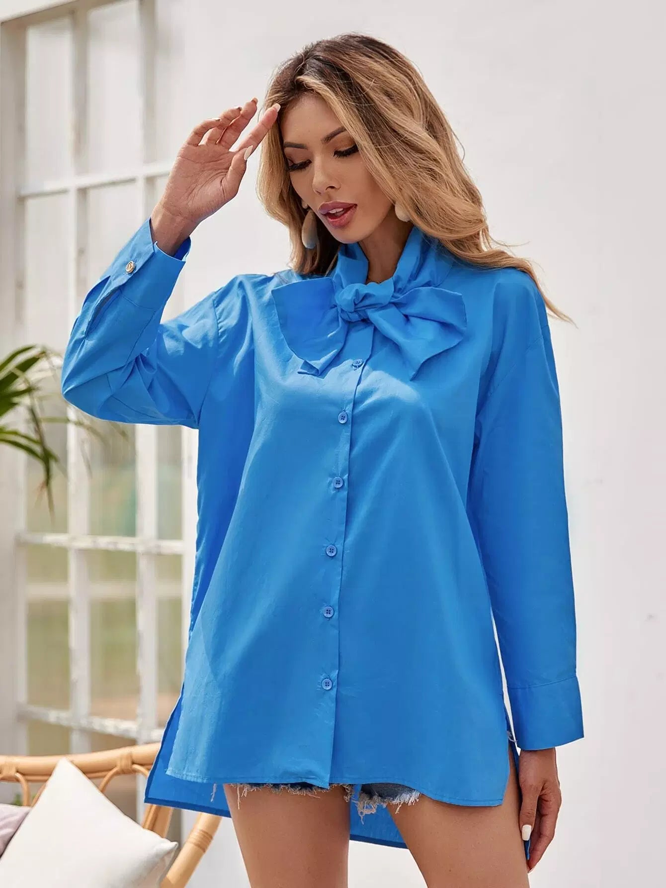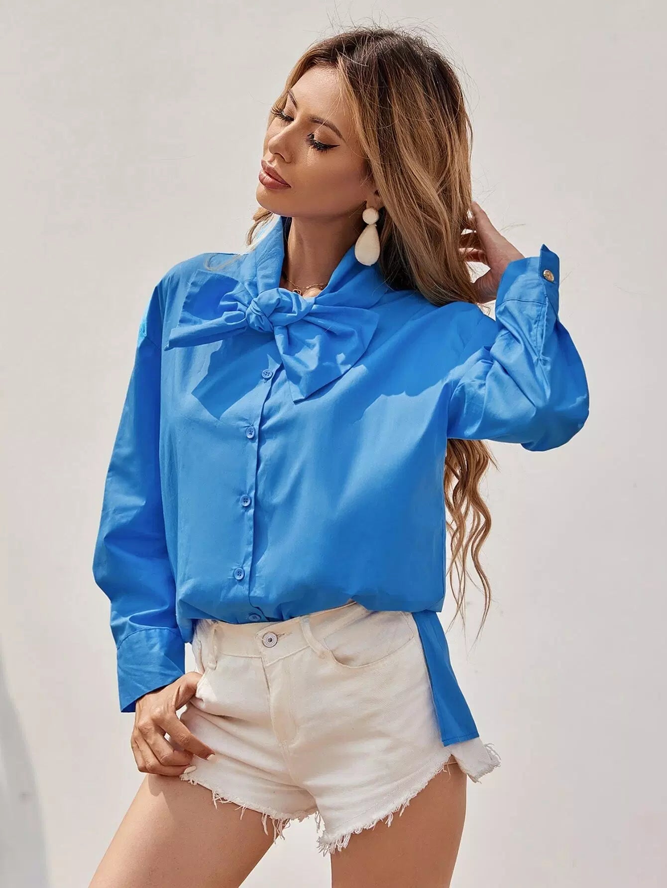 النساء - بلوزة بأكتاف منسدلة وياقة مربوطة