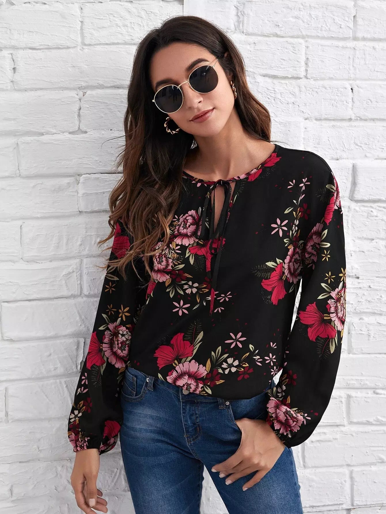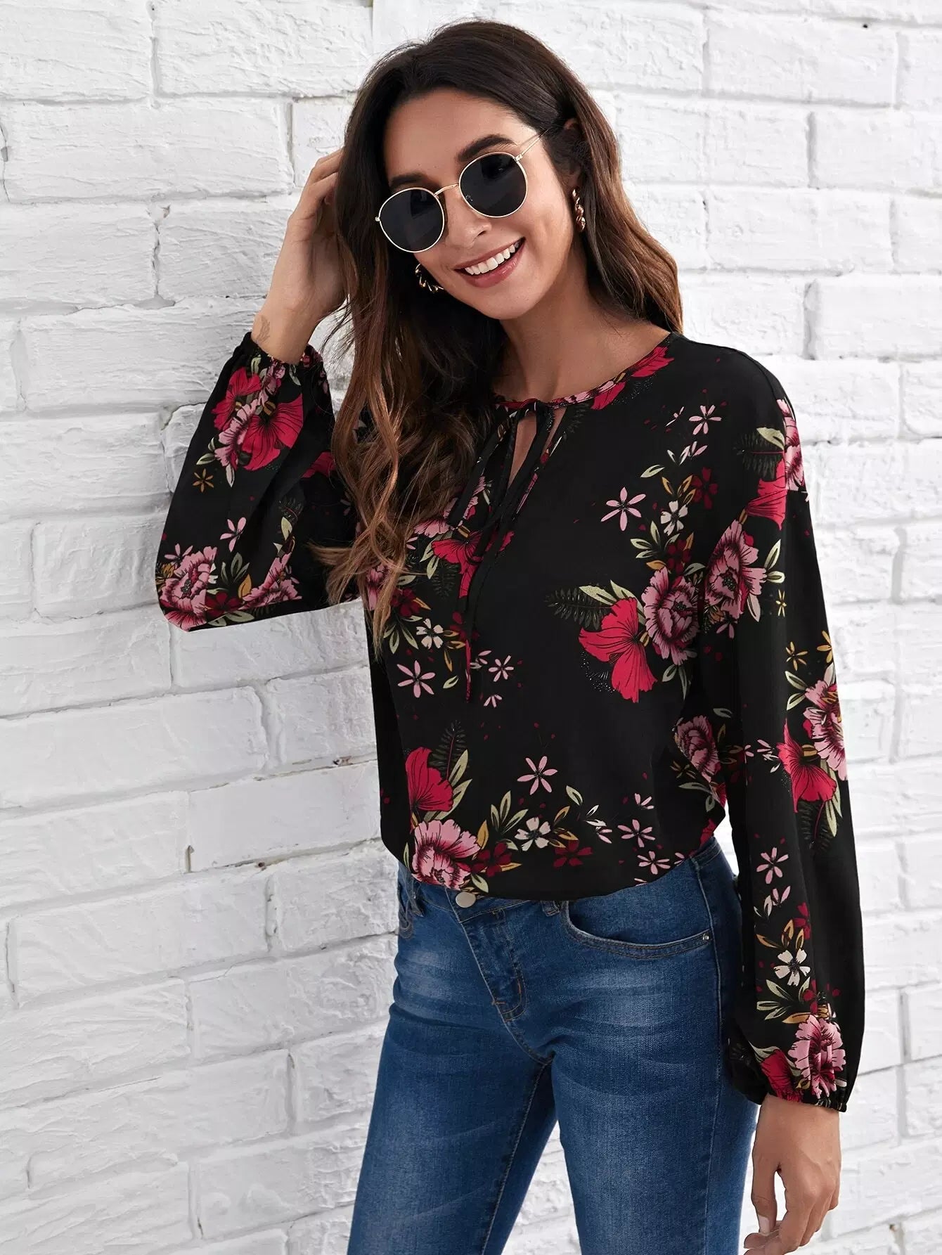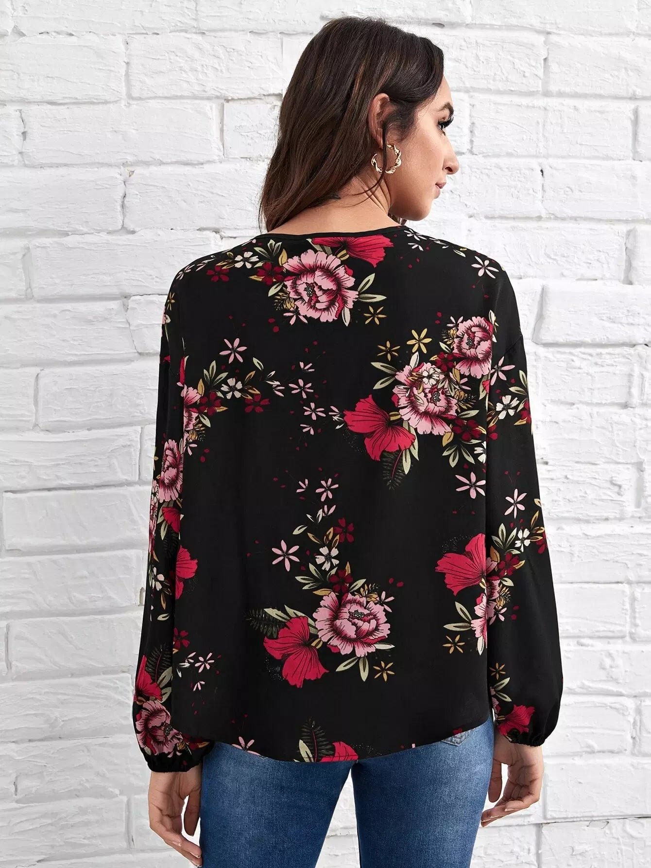 بلوزة زهرية بأكمام فانوس ورقبة على شكل ربطة عنق