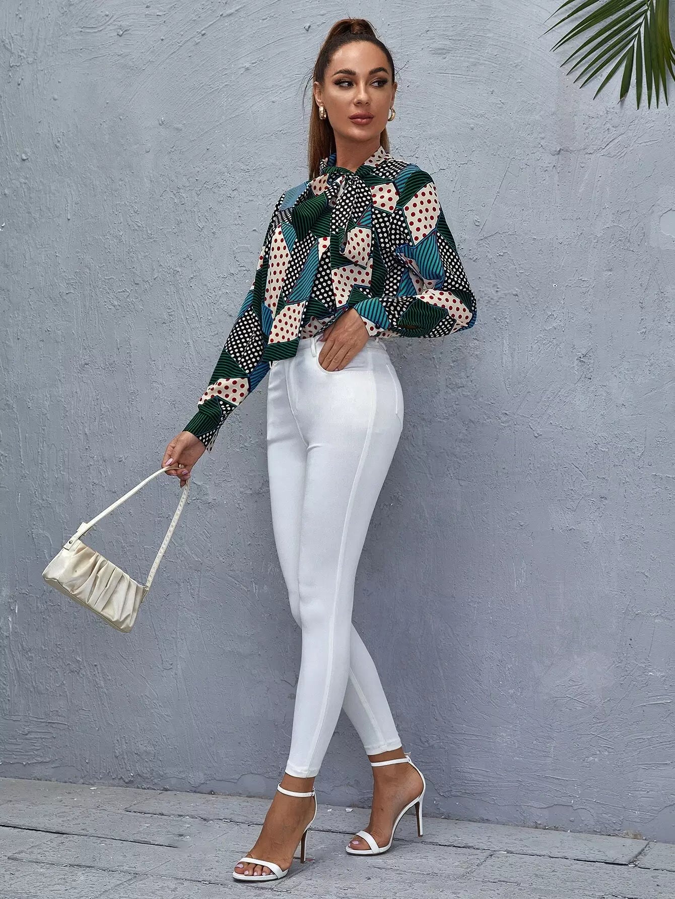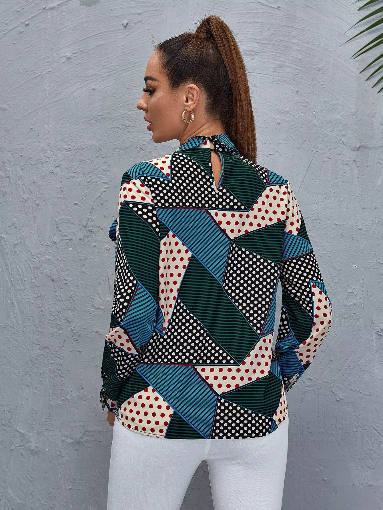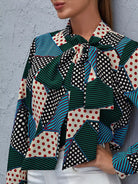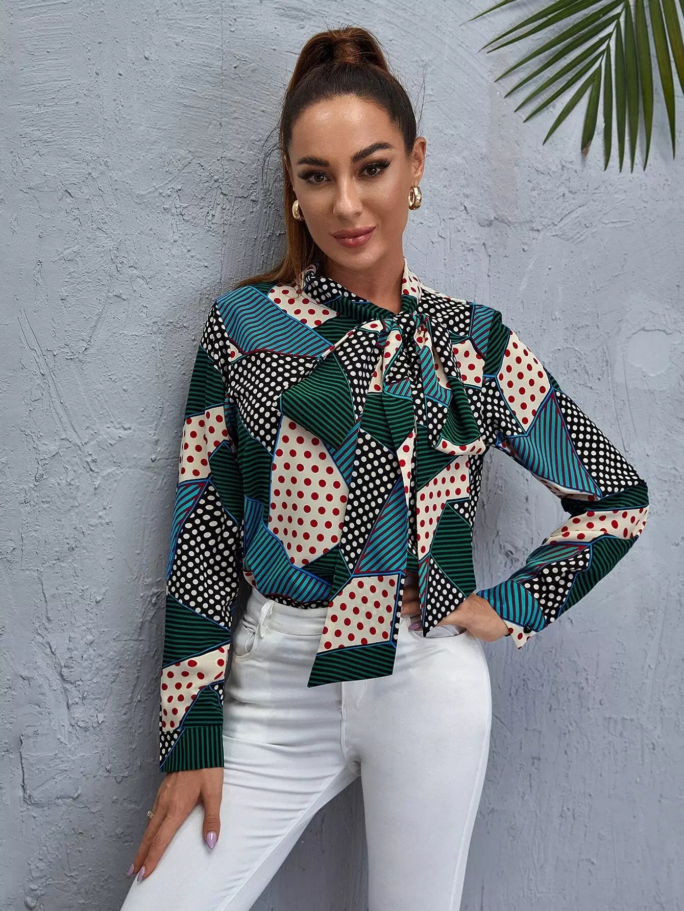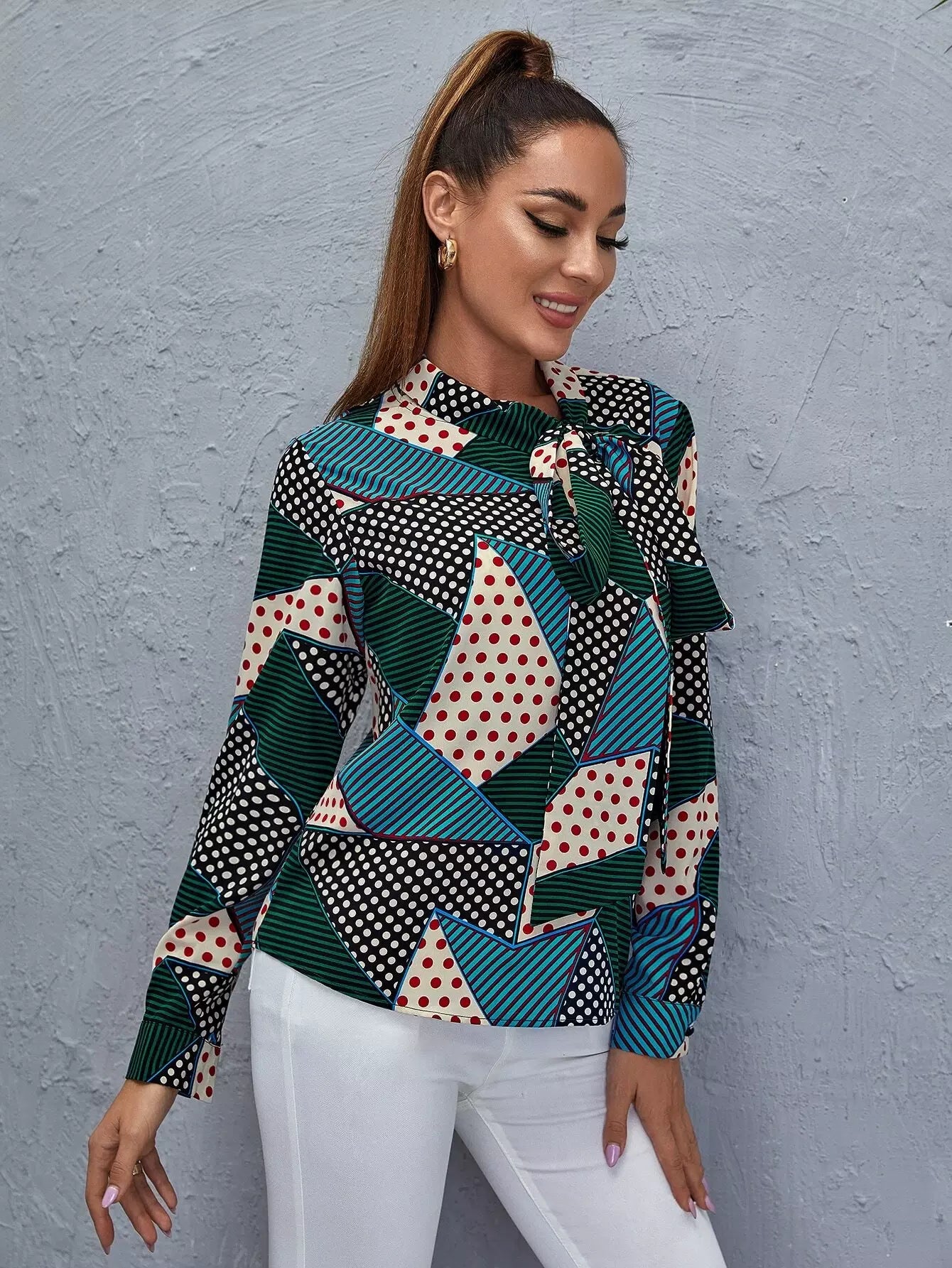 بلوزة مخططة بربطة عنق وربطة عنق منقطة