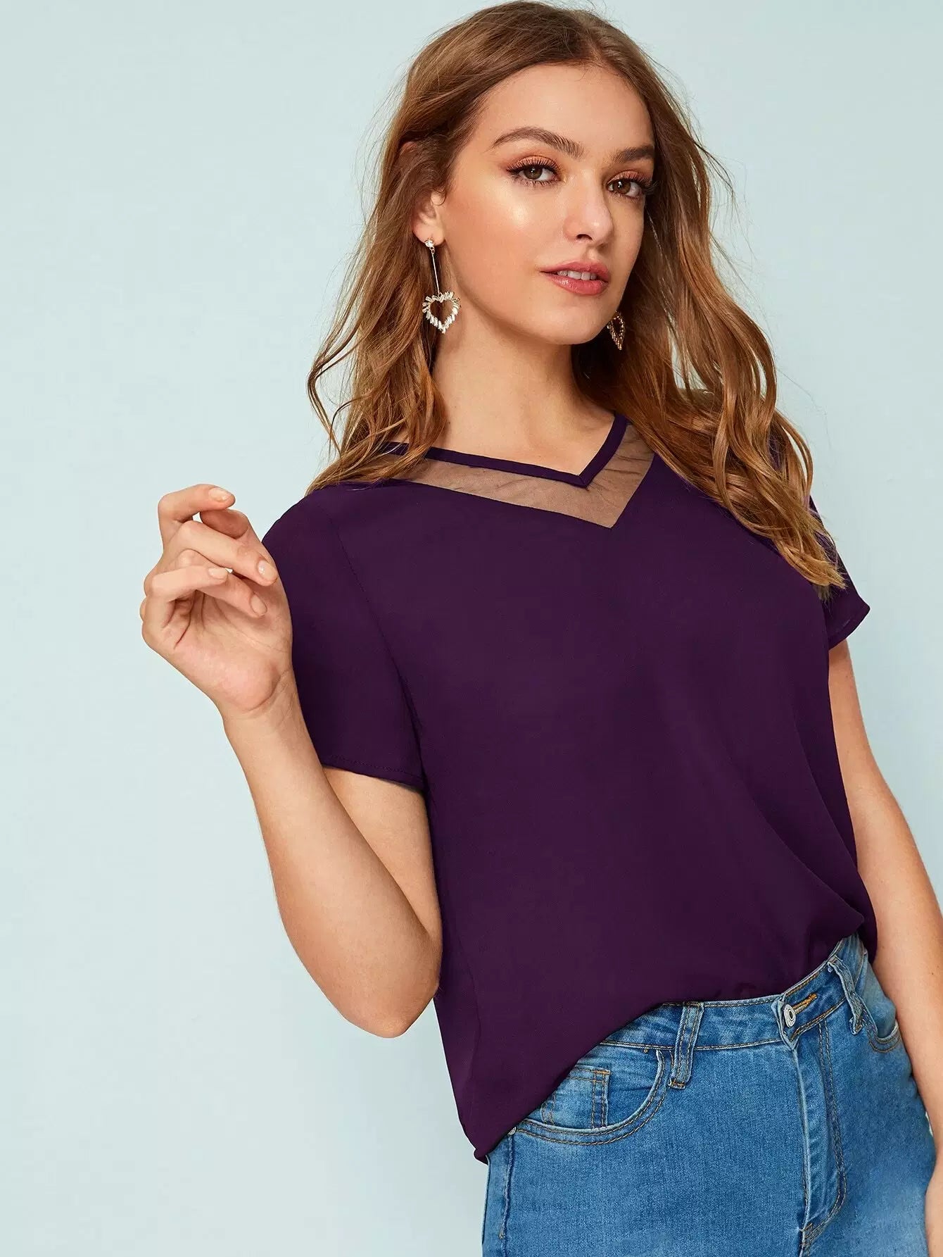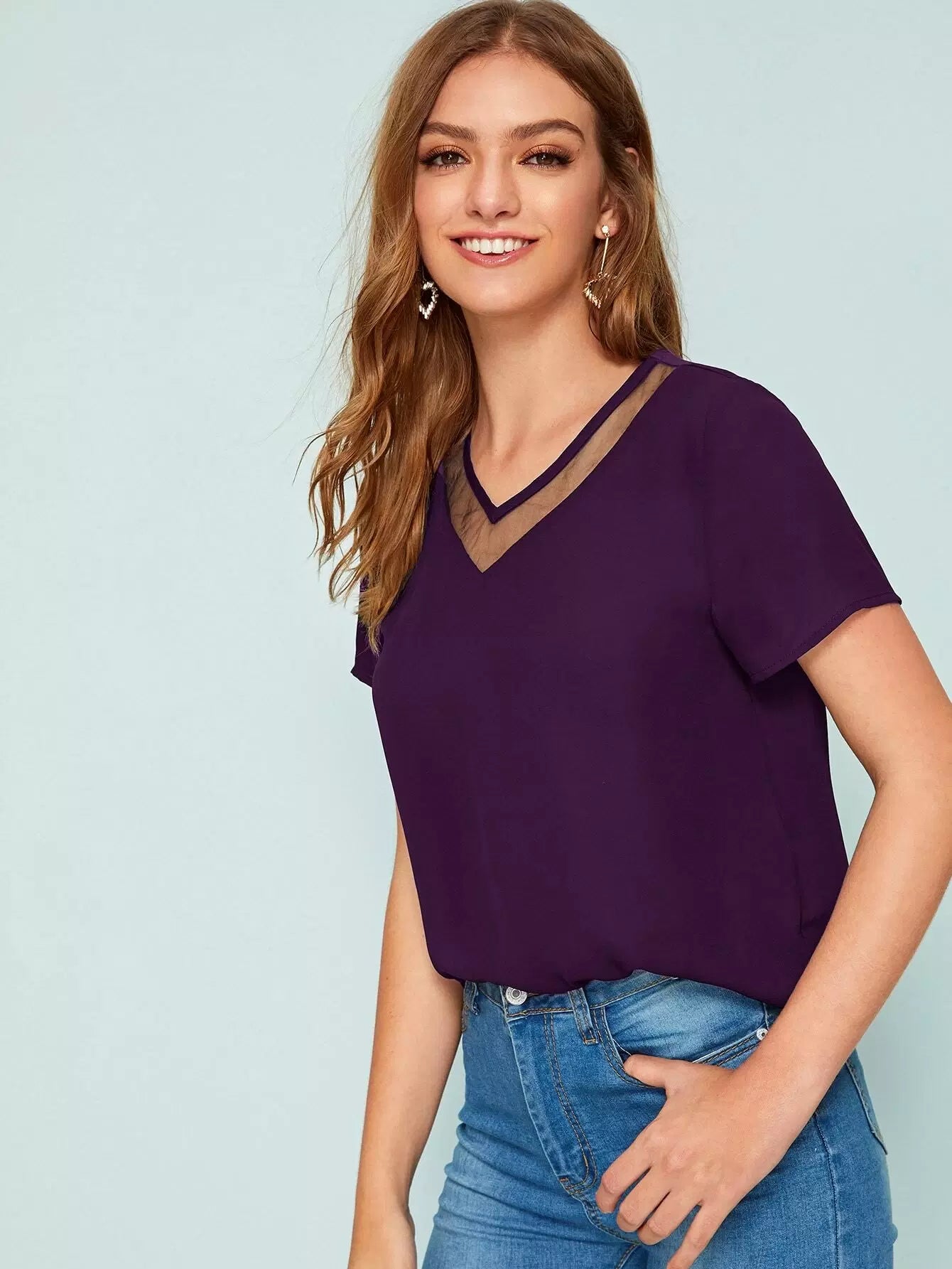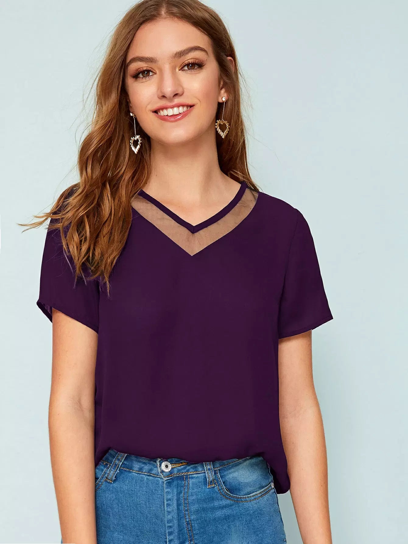 النساء - بلوزة شبكية بفتحة رقبة على شكل حرف V