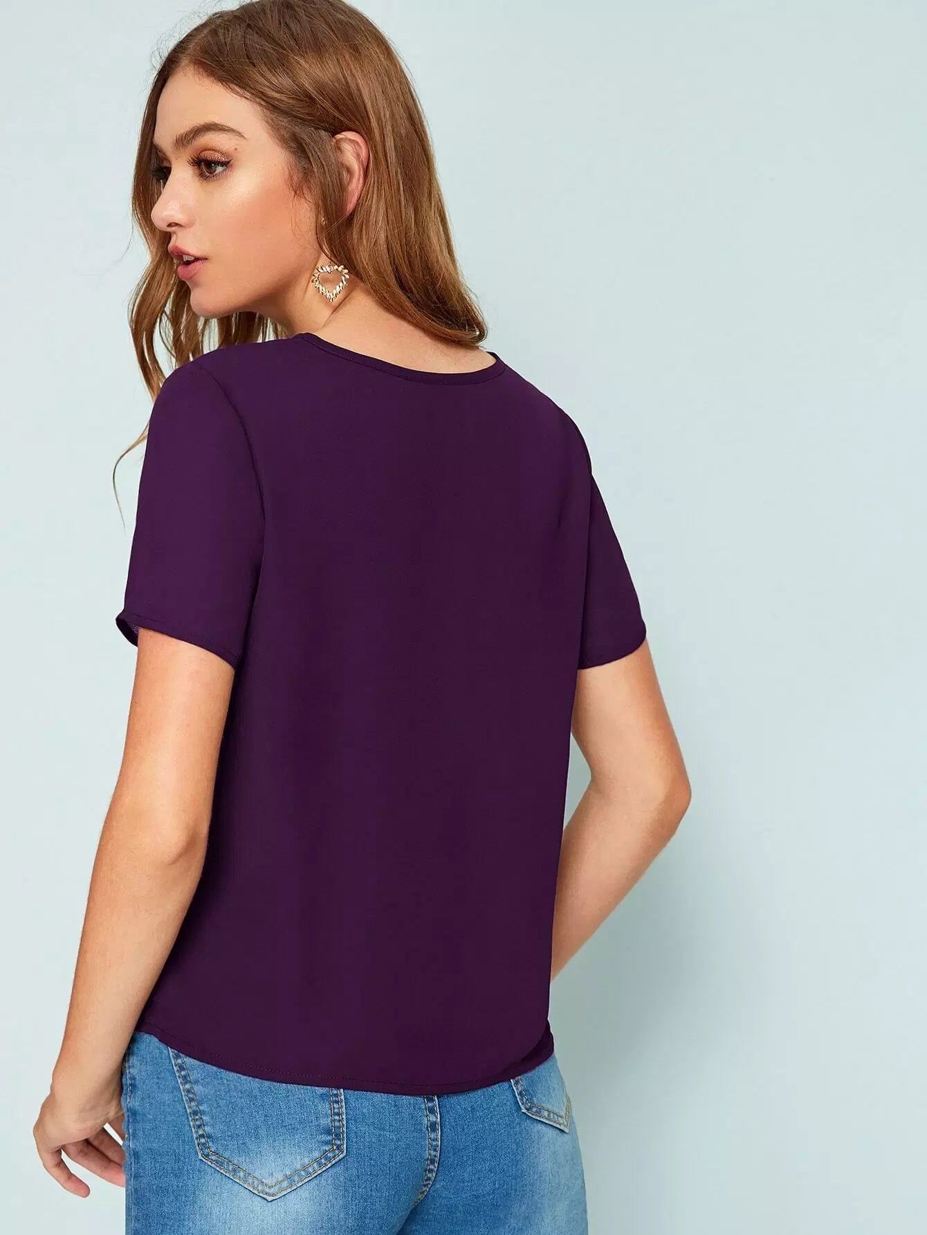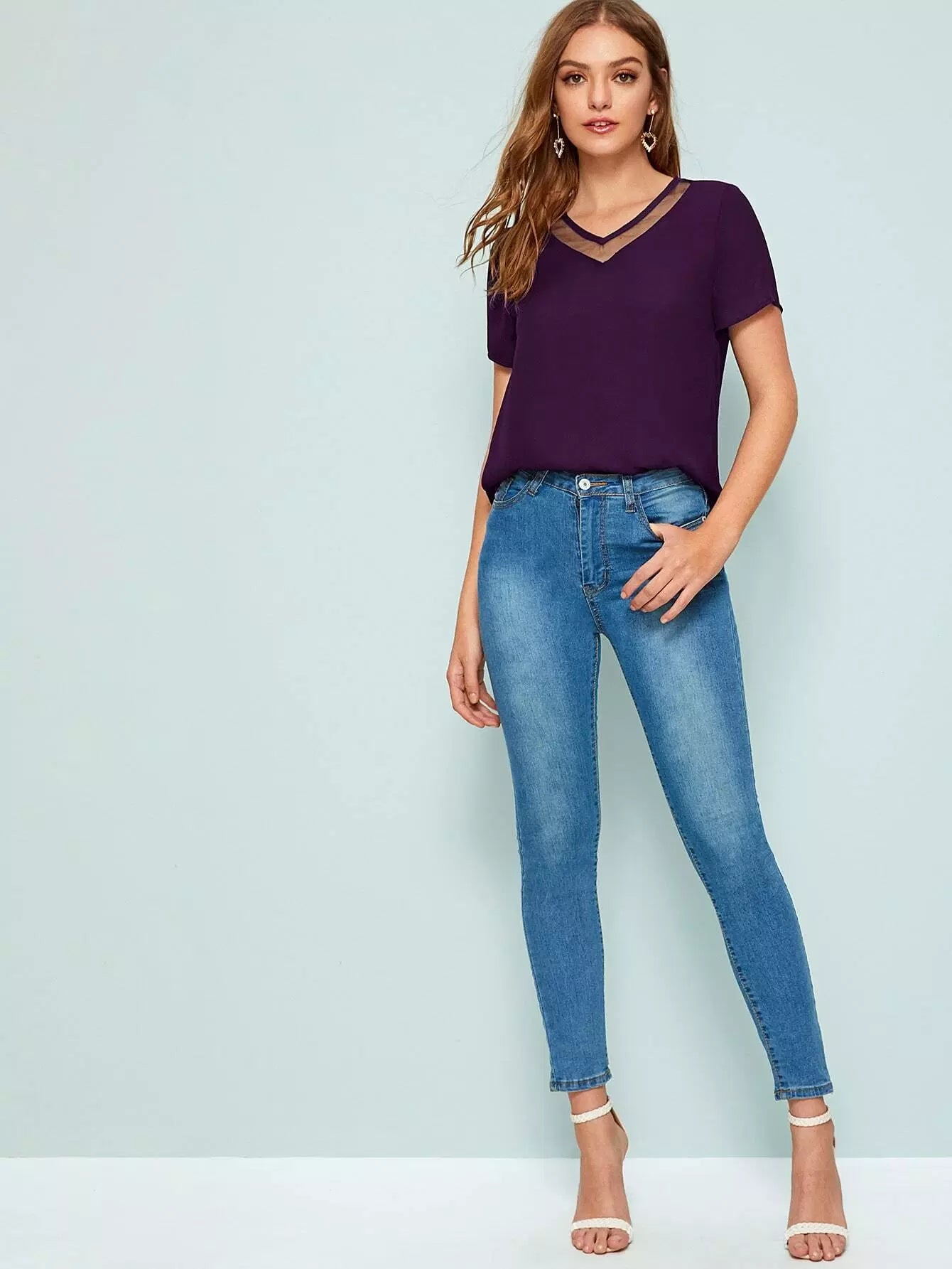 بلوزة بياقة على شكل V برقبة على شكل شبكة