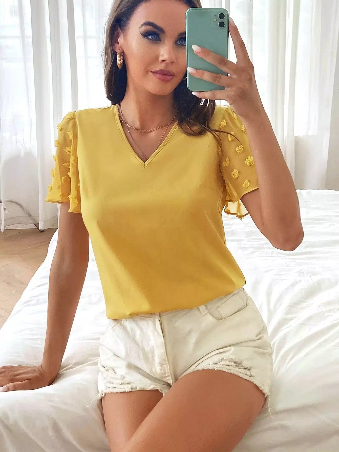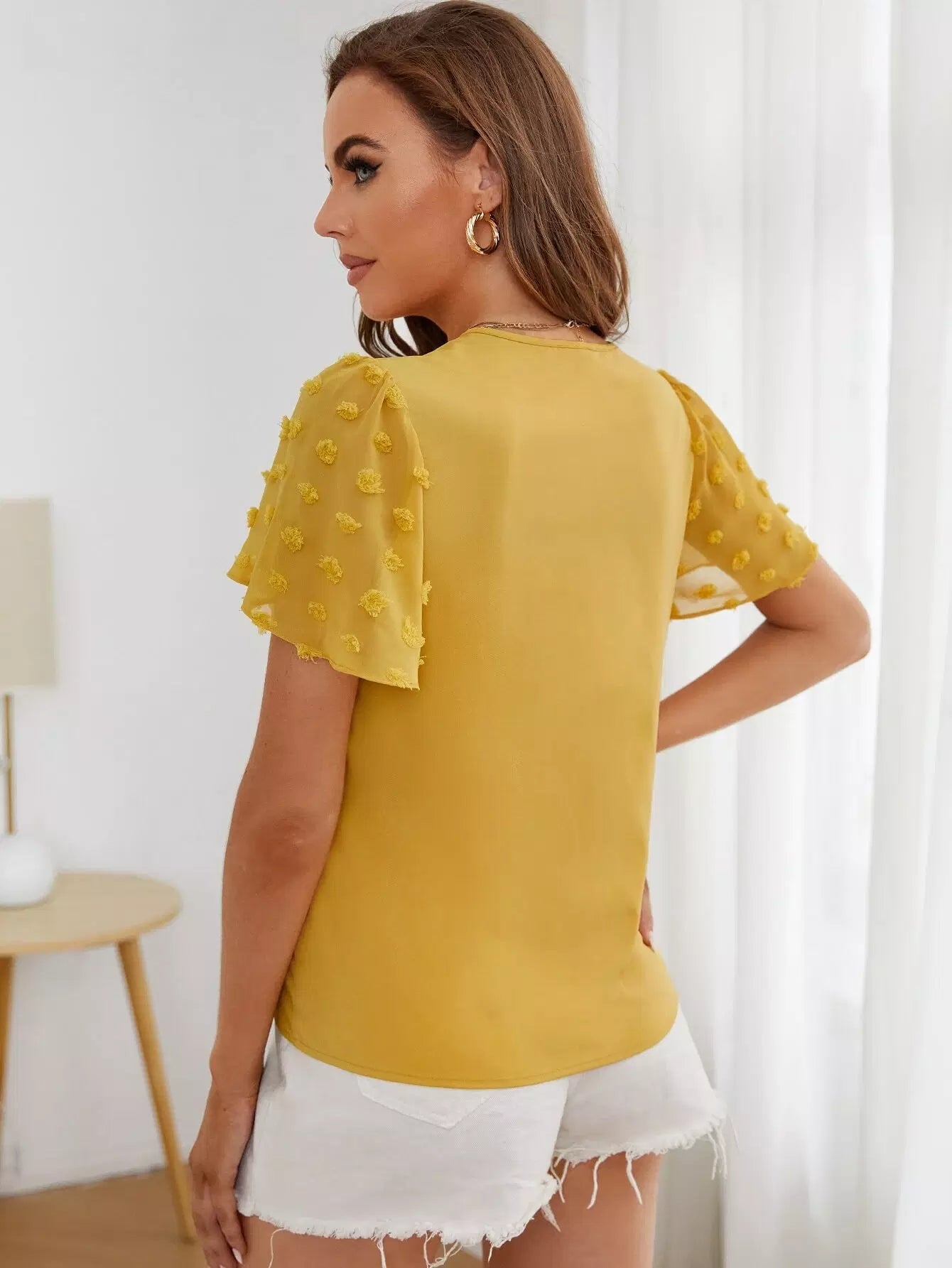 بلوزة ذات أكمام منقطة على شكل V بياقة على شكل V