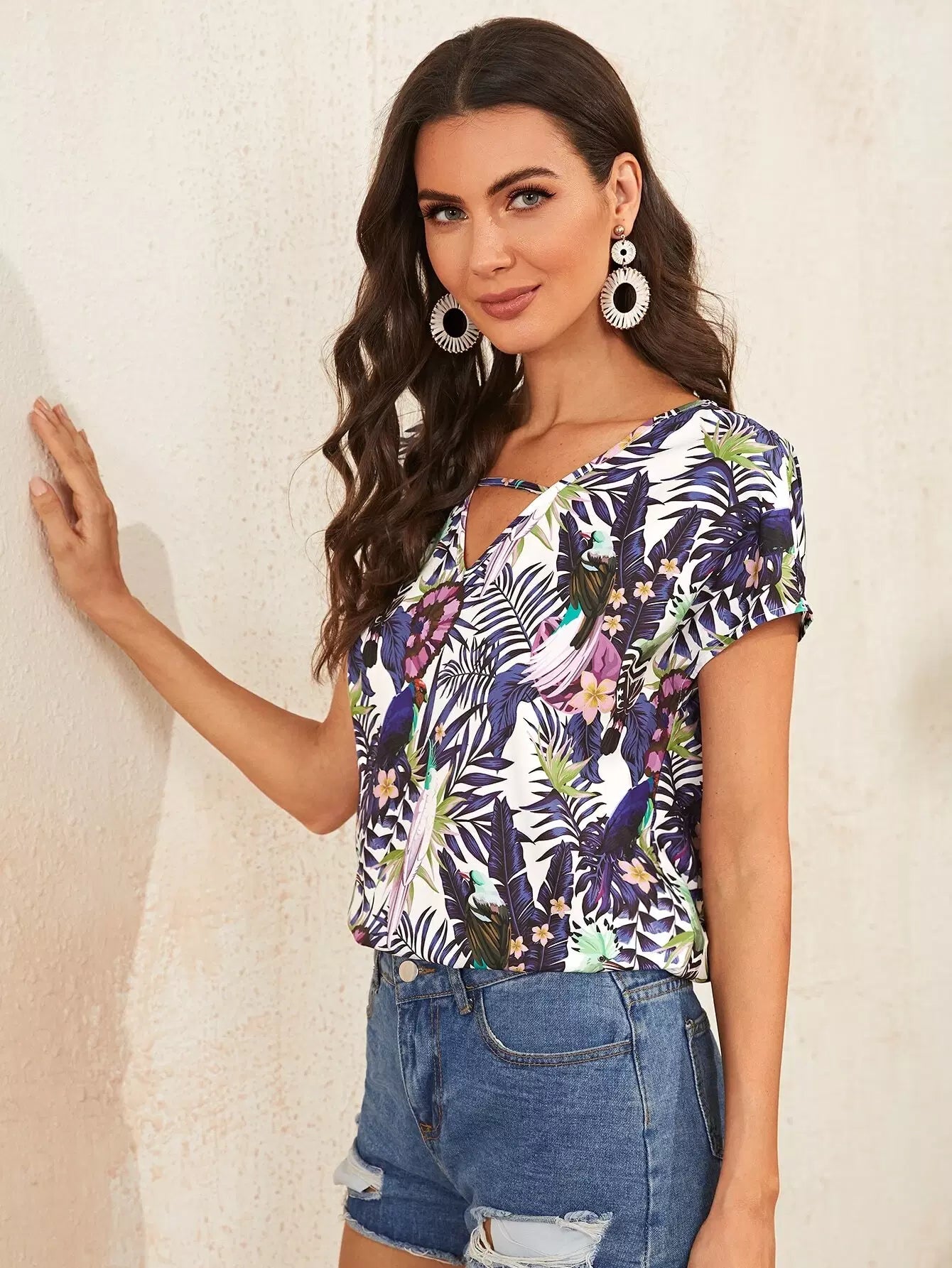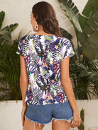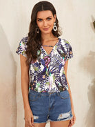 بلوزة بطبعة استوائية وفتحة رقبة على شكل حرف V