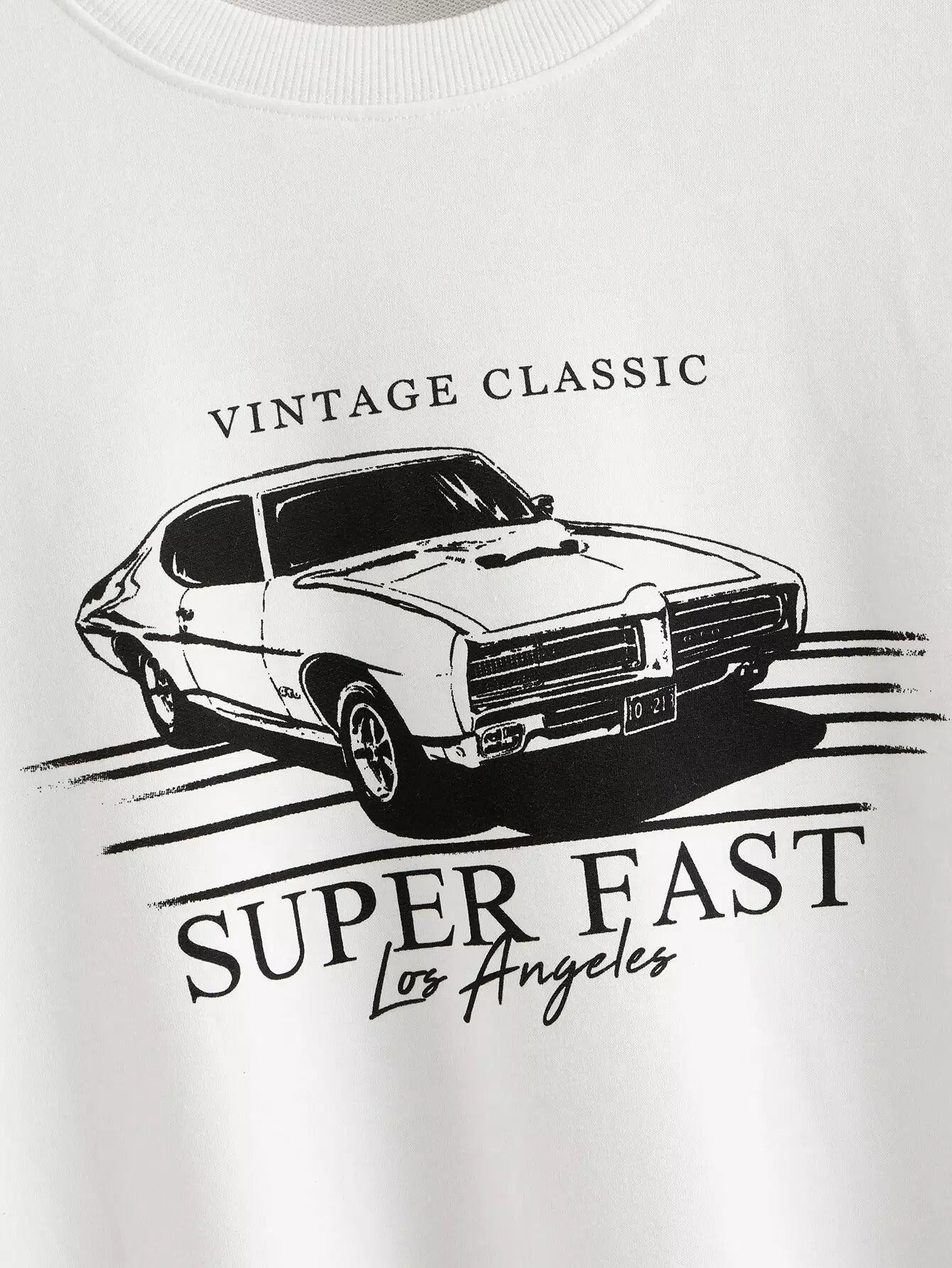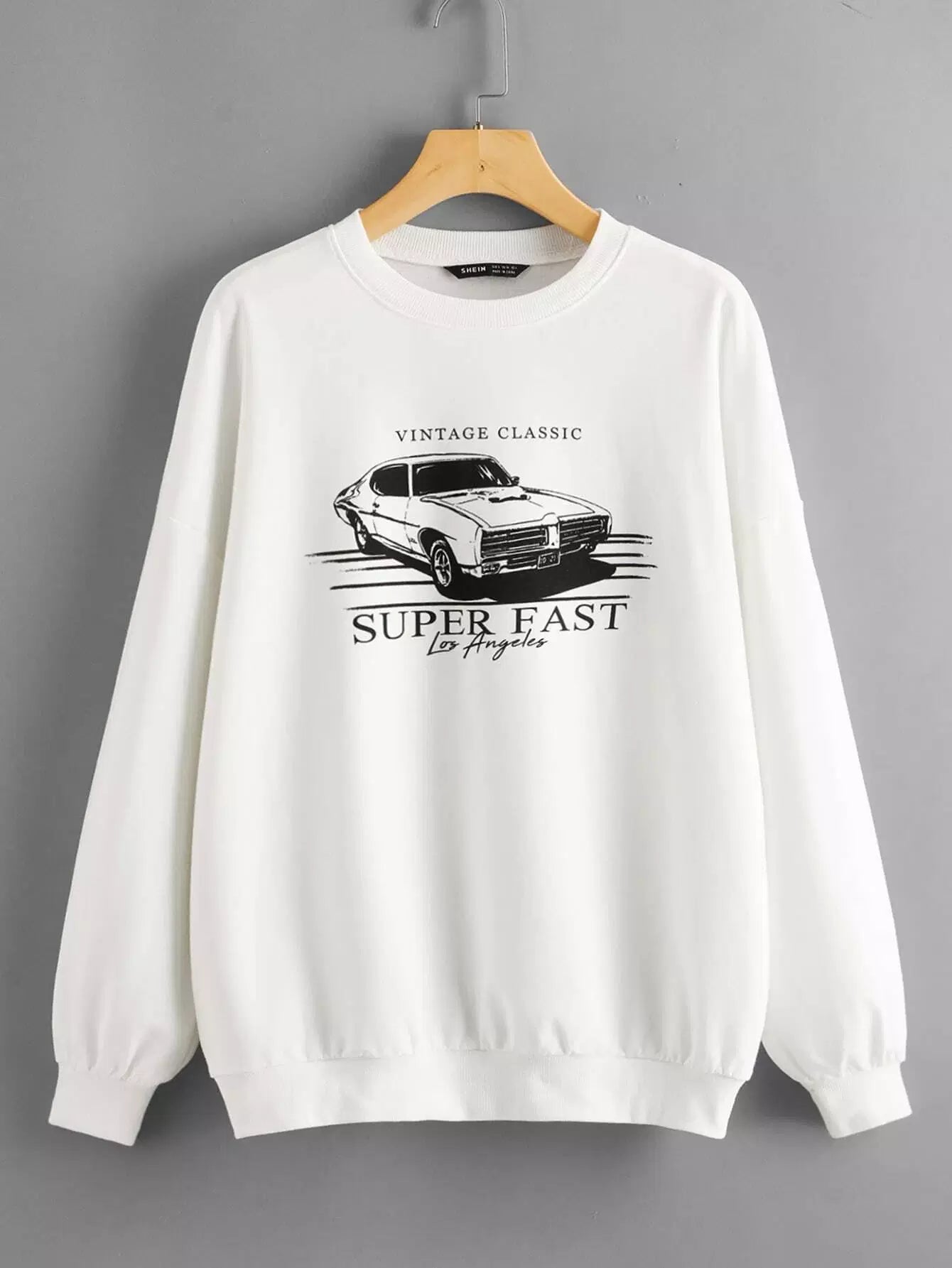 كنزة صوفية كبيرة الحجم مزينة برسومات سيارات وحروف