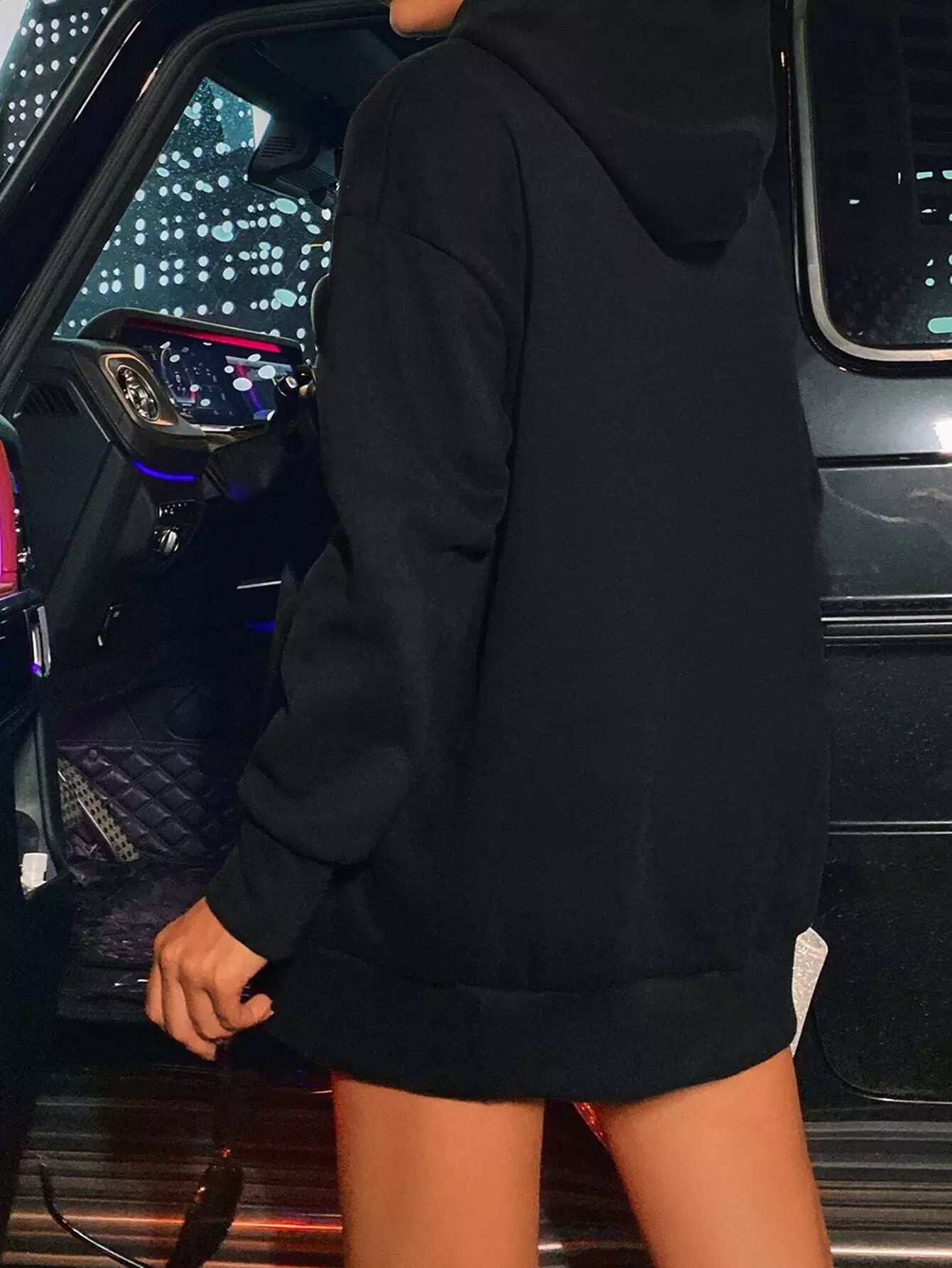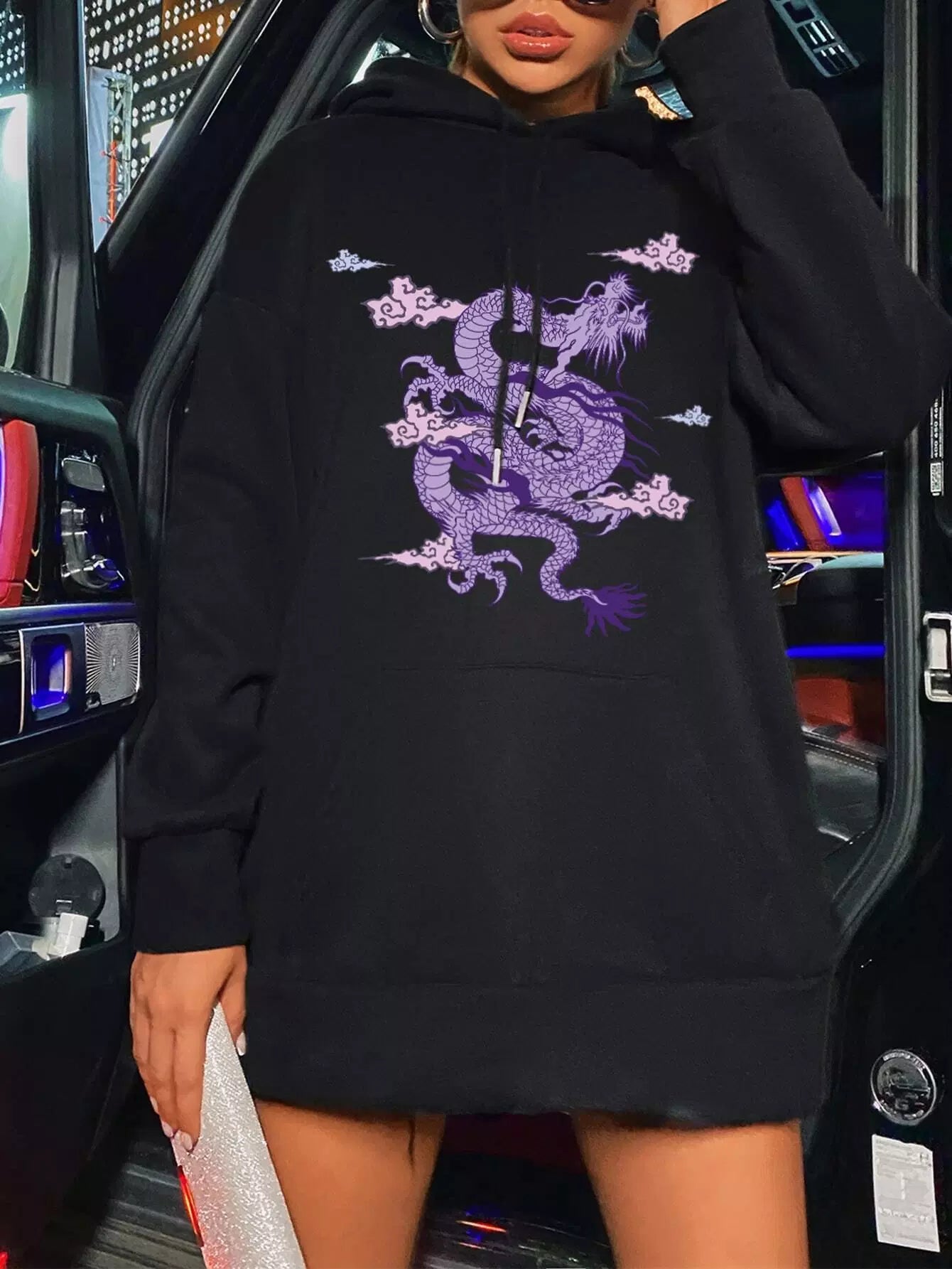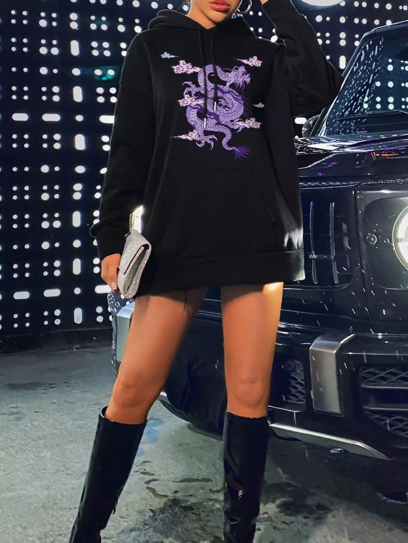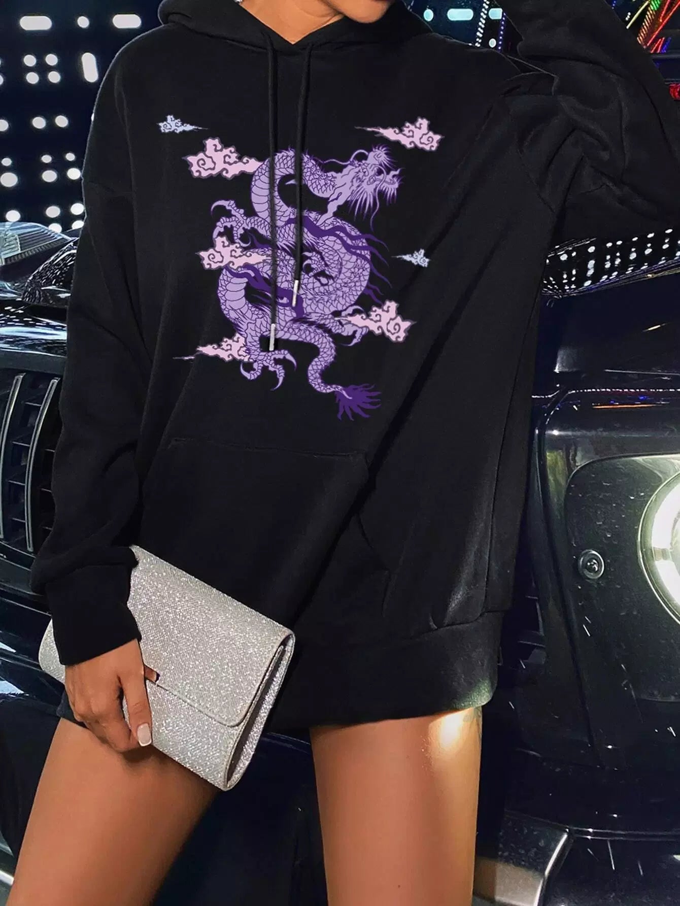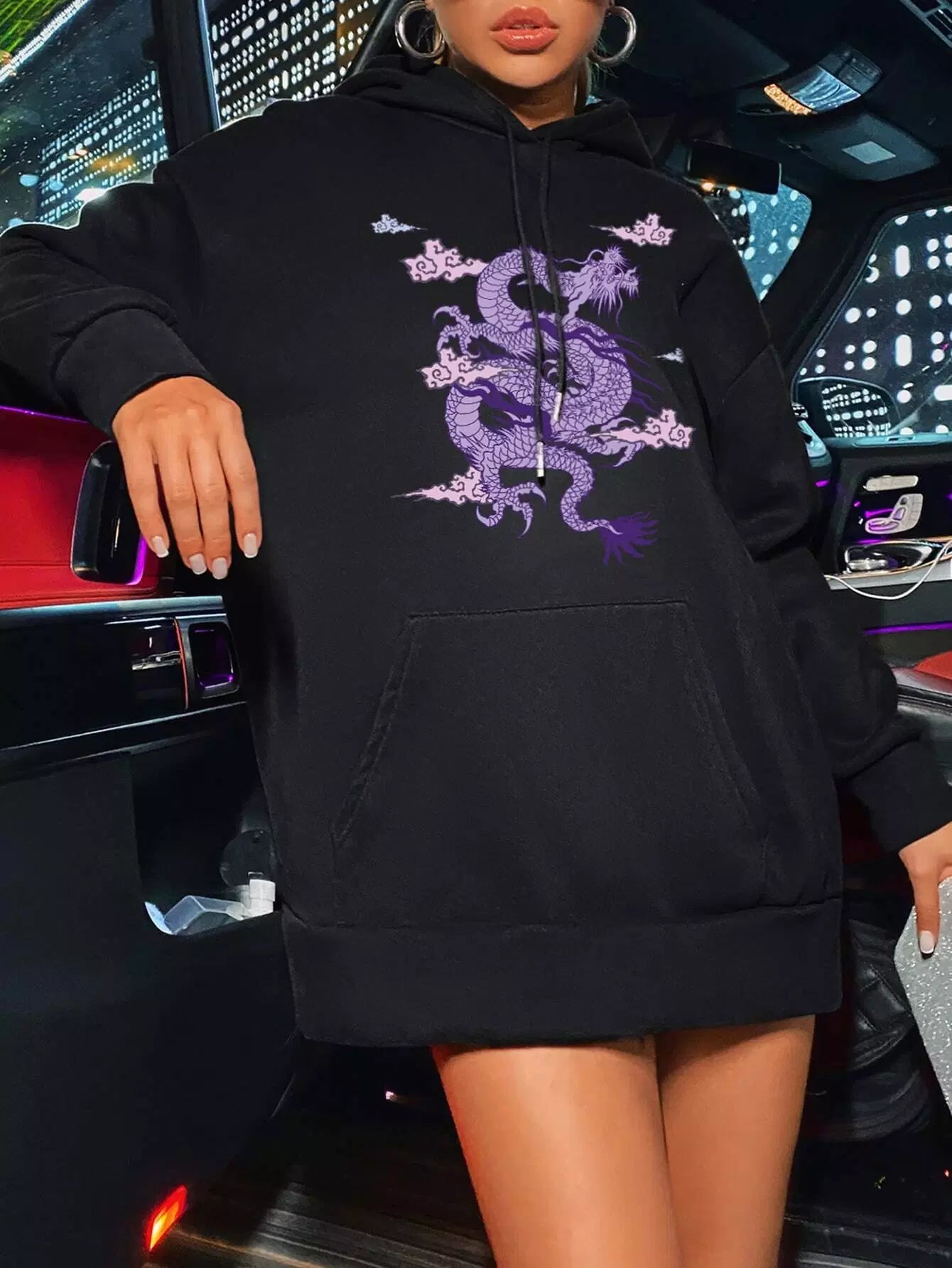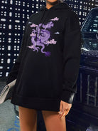 للنساء - سترة بقلنسوة كبيرة الحجم برباط وطبعة تنين صيني