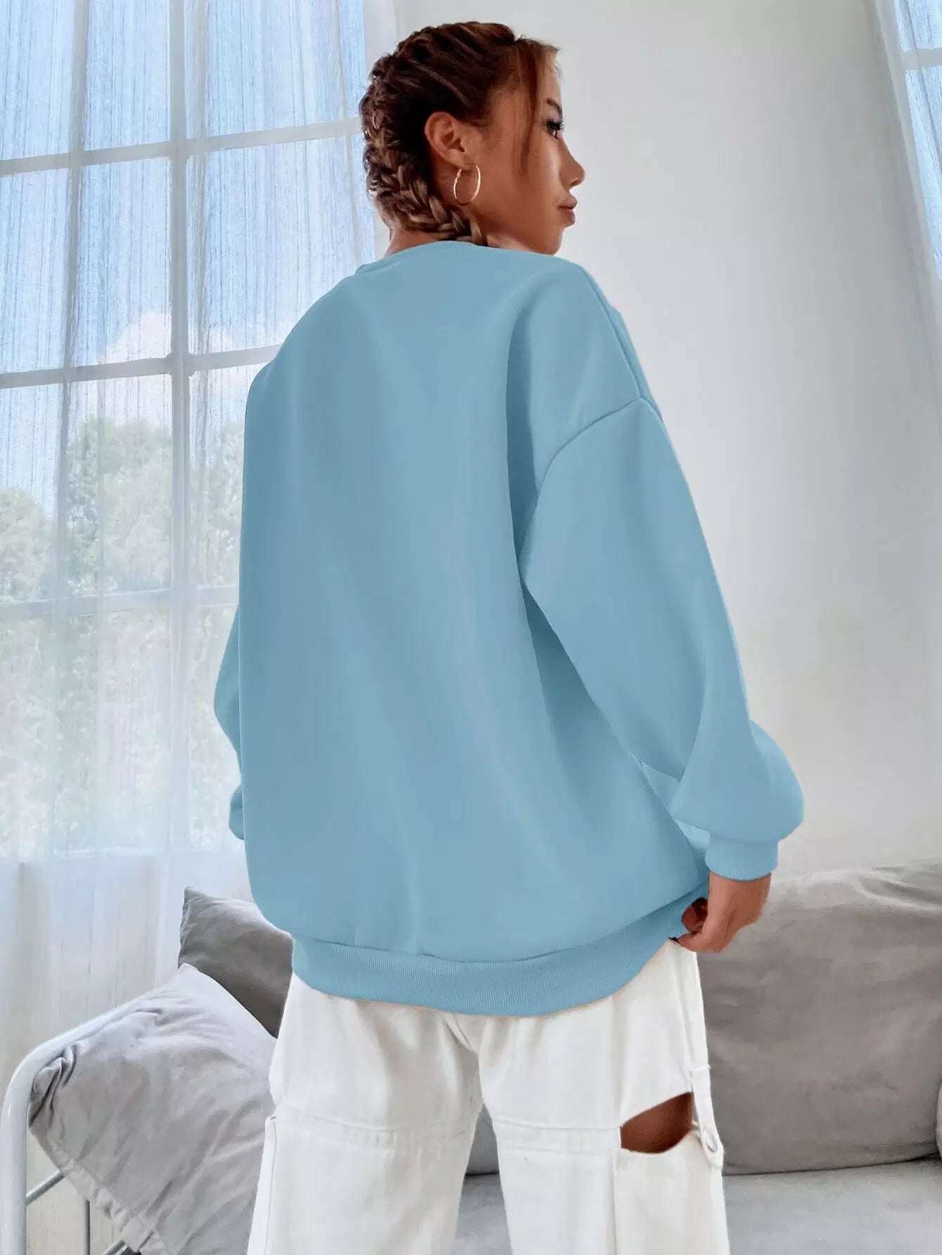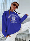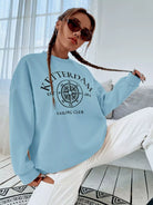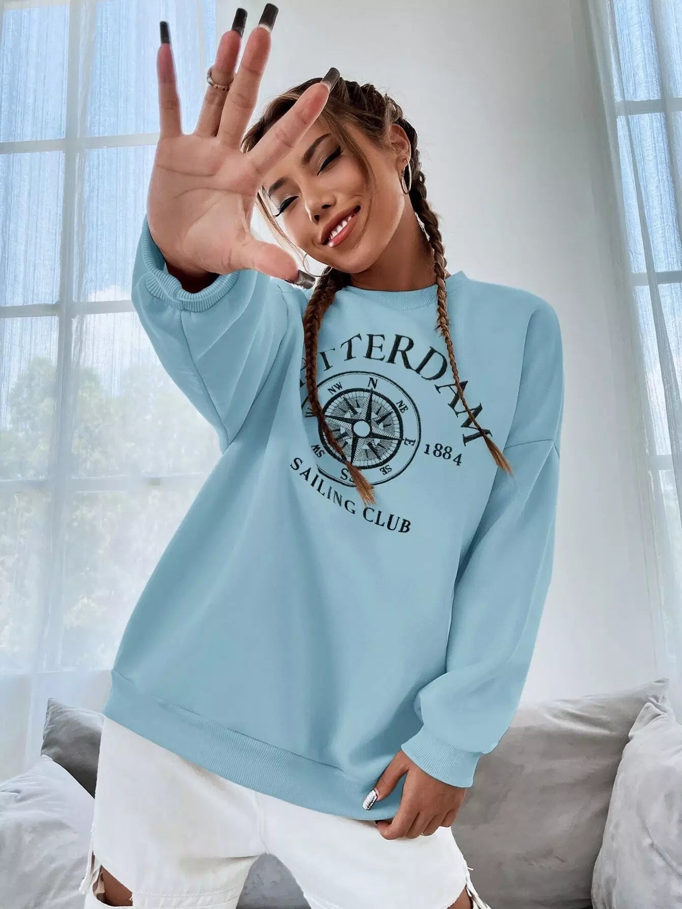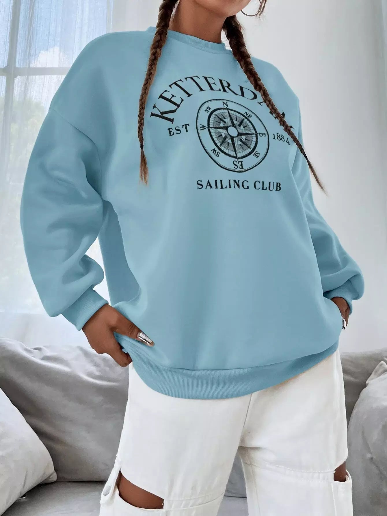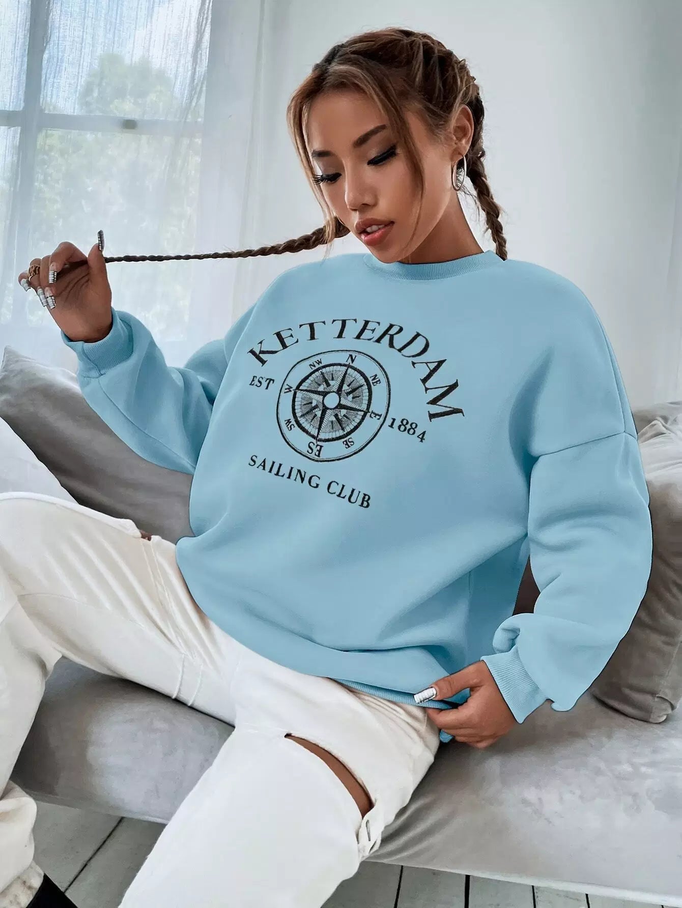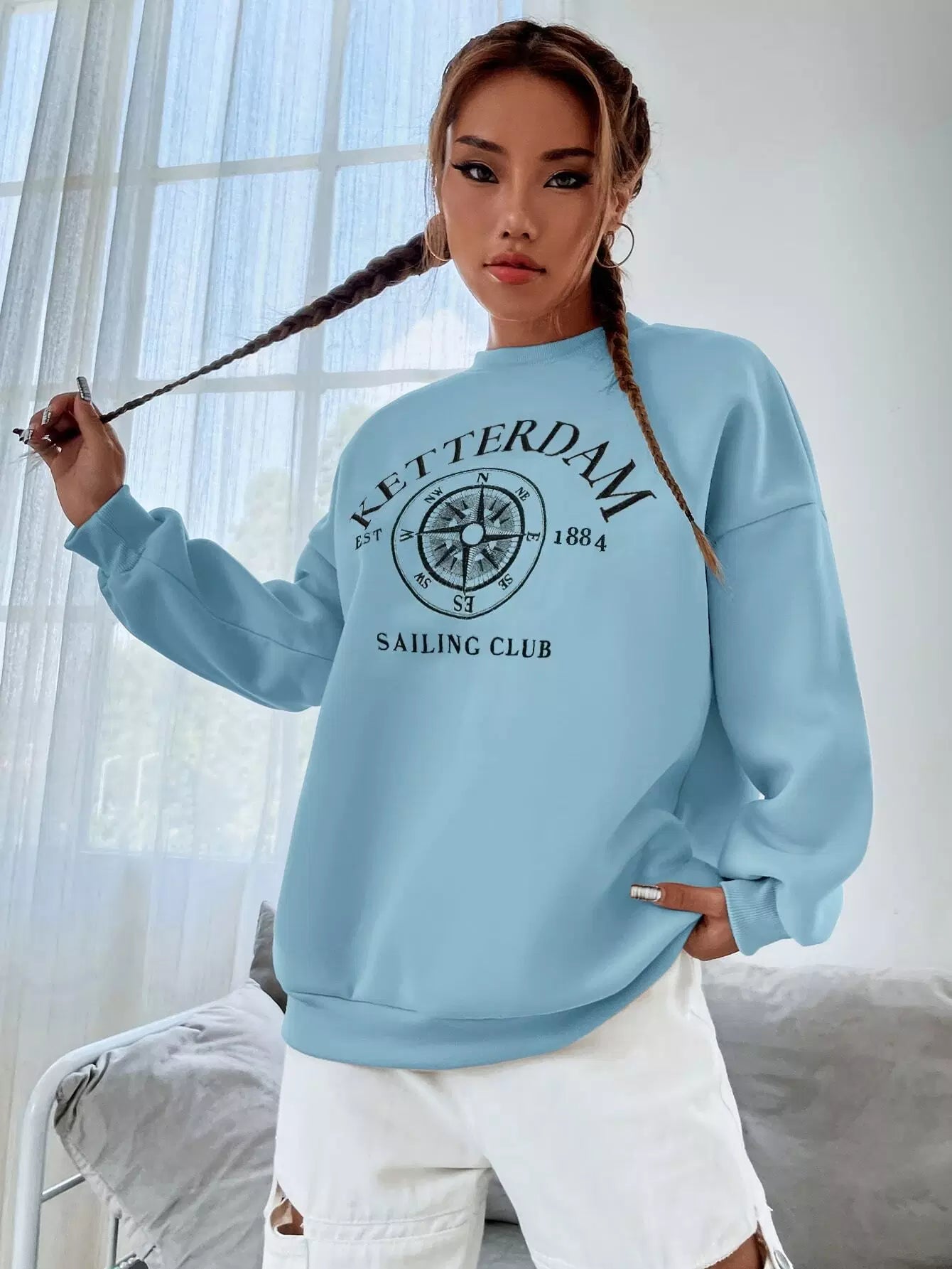 سويت شيرت منسدل الكتف مطرز بتطريز البوصلة والحروف