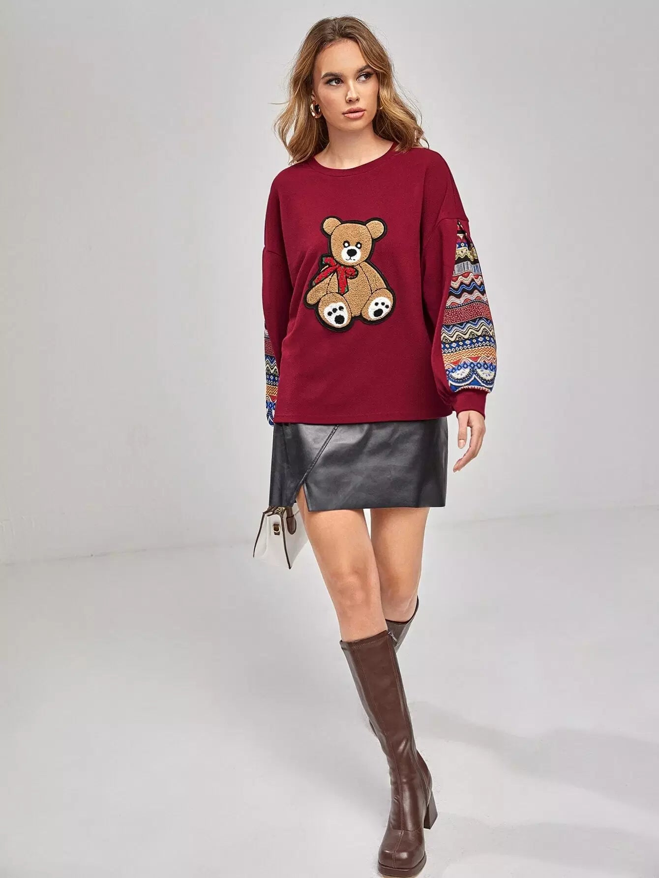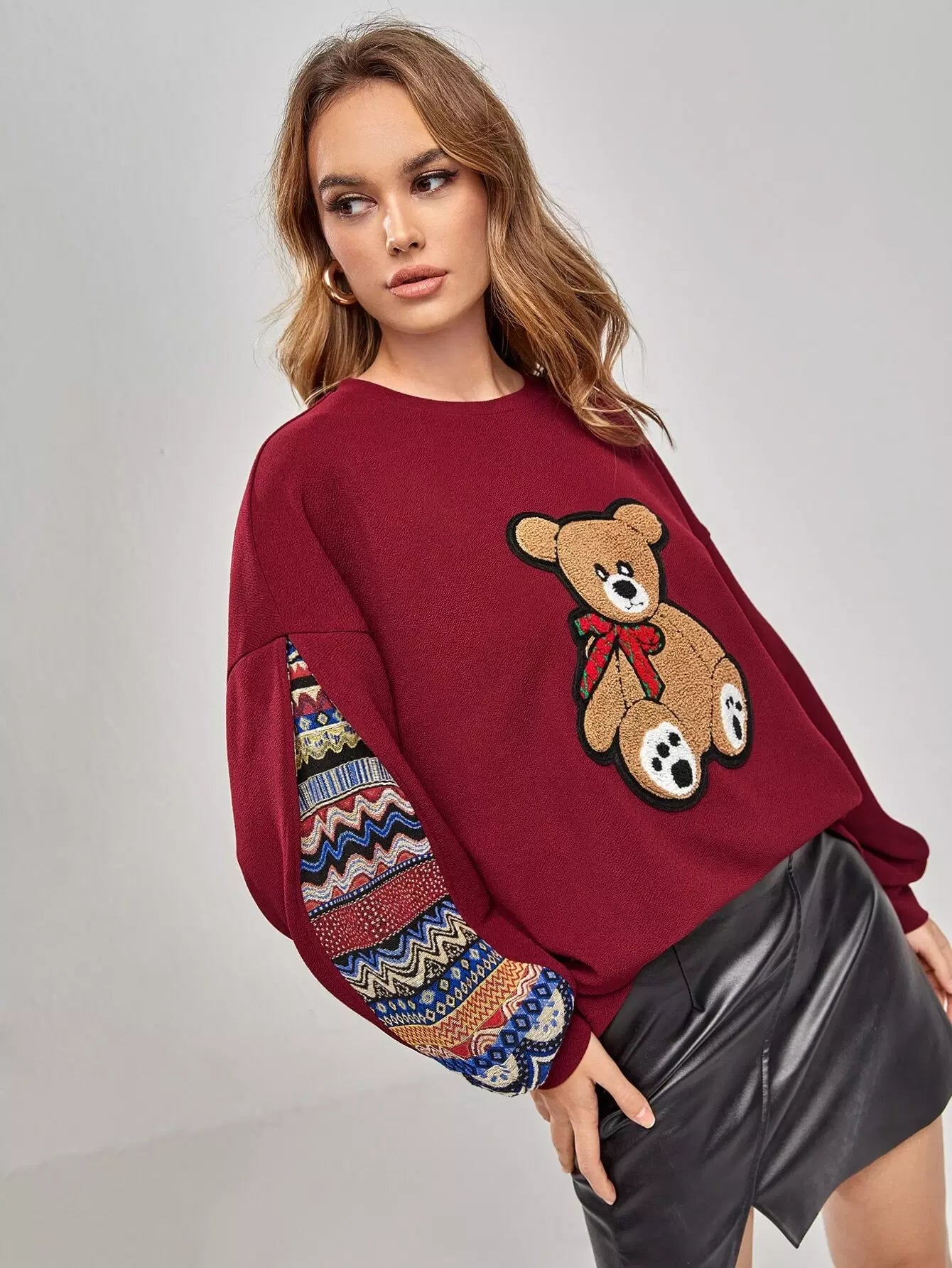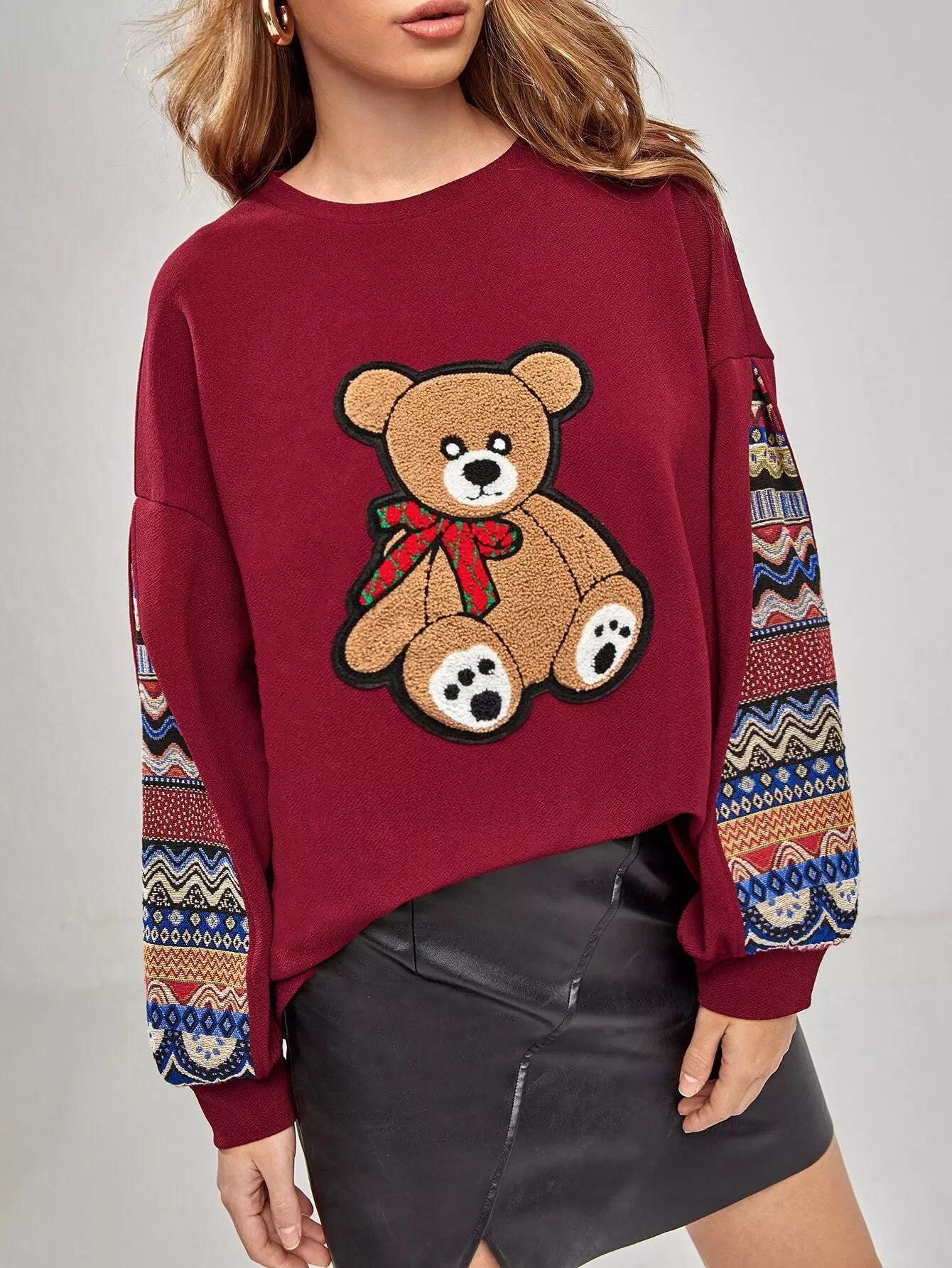 كنزة صوفية منسدلة الكتفين بنقشة جيو مرقعة على شكل دب