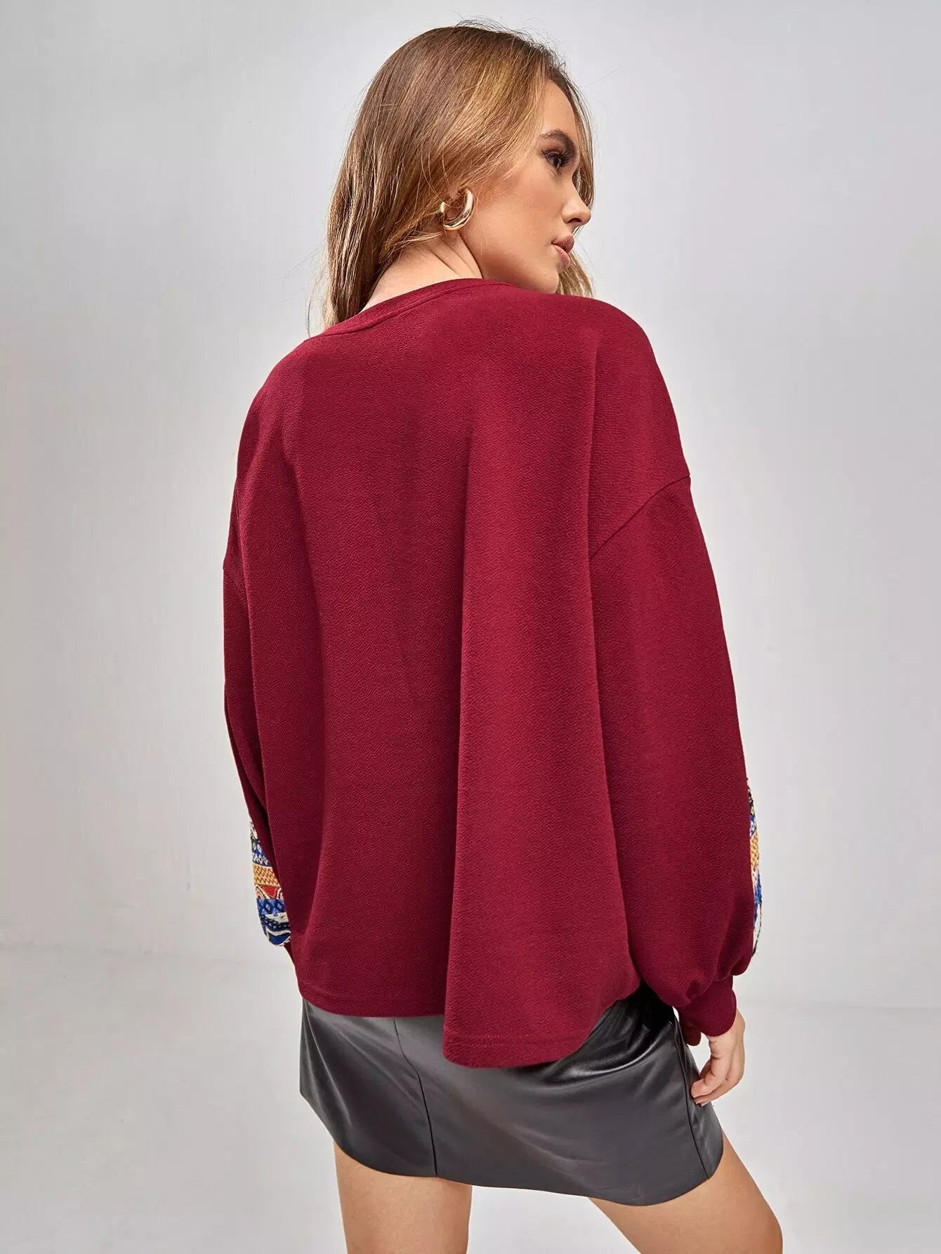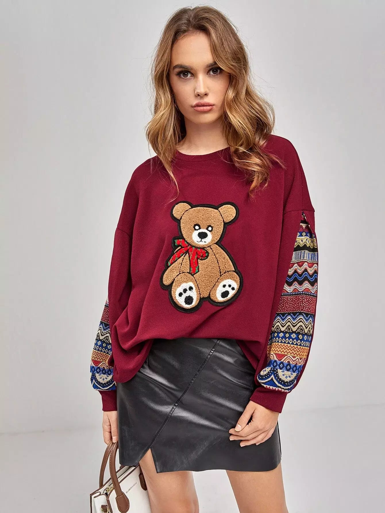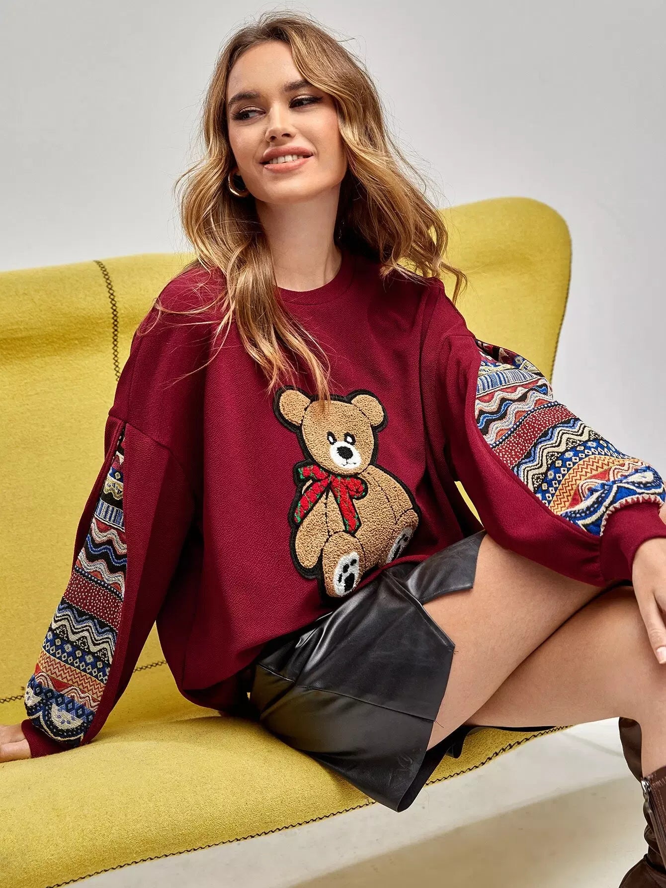 كنزة صوفية منسدلة الكتفين بنقشة جيو مرقعة على شكل دب