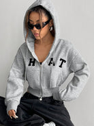 Flirla Women's Front Zipper Long Sleeve Hooded Sweatshirt With Pocket And Letter Pattern Pullover Fall