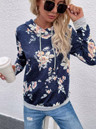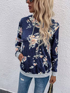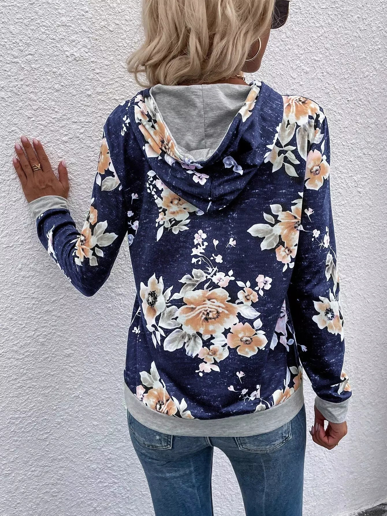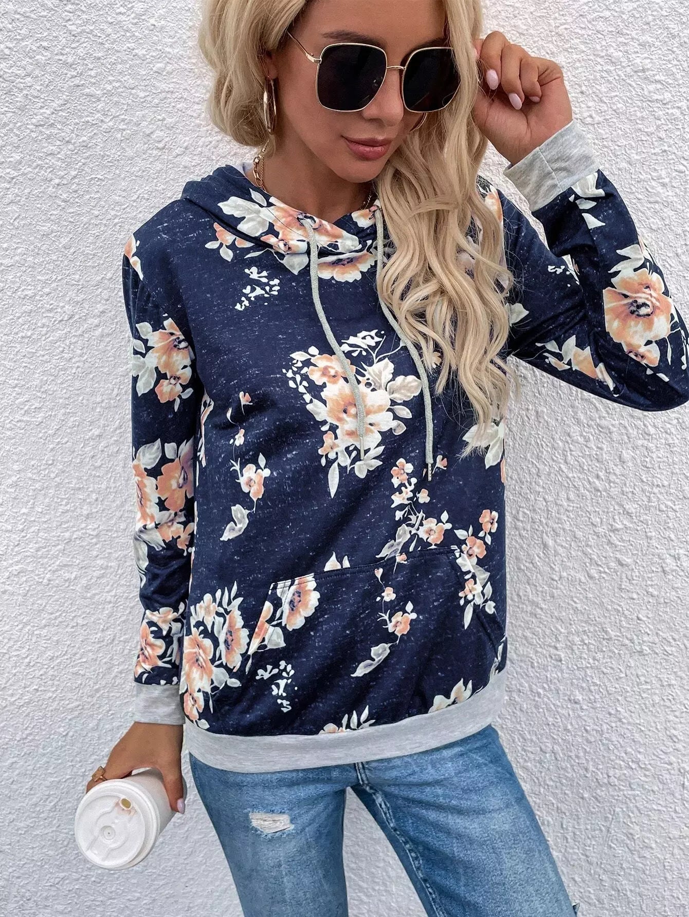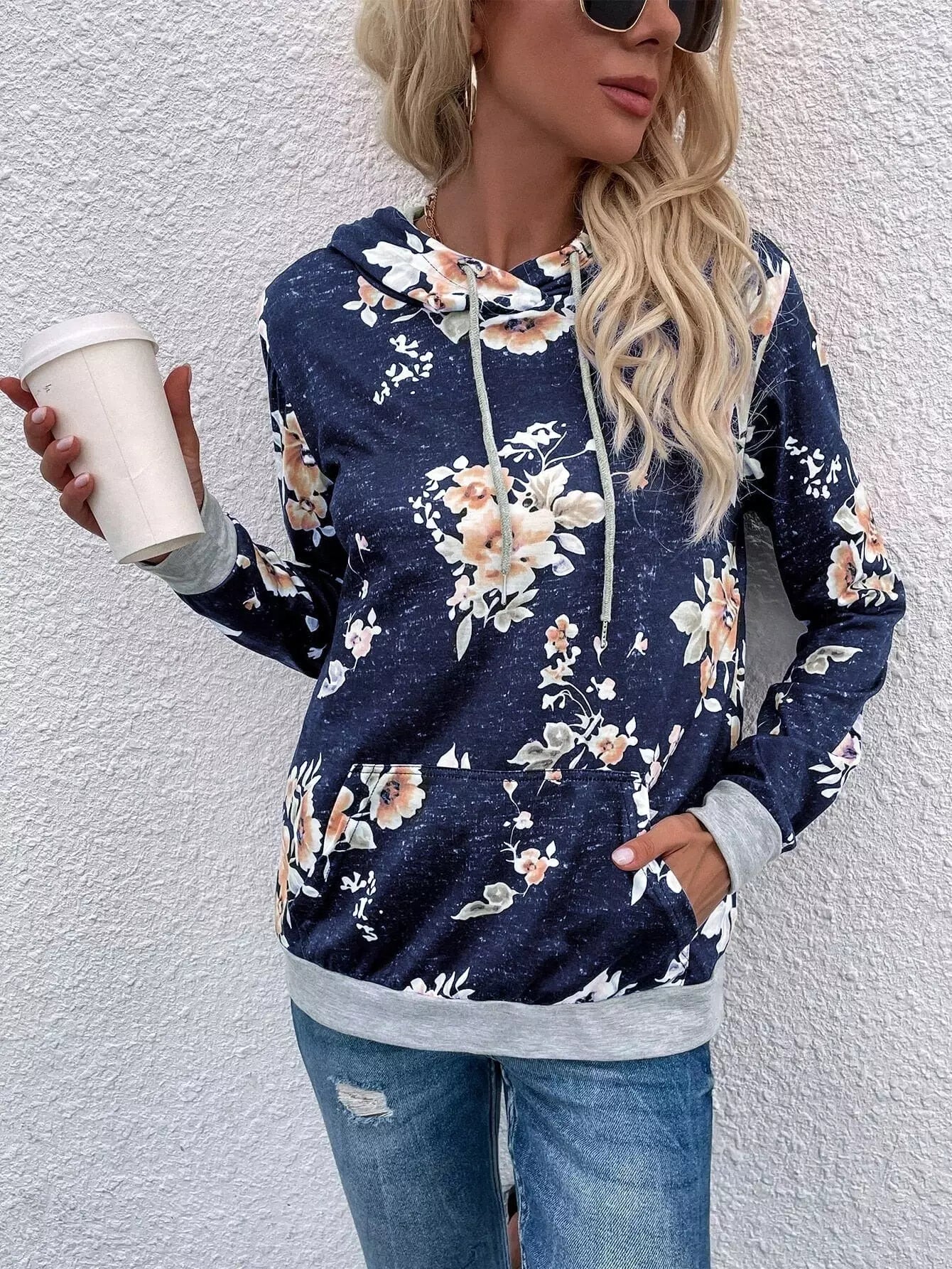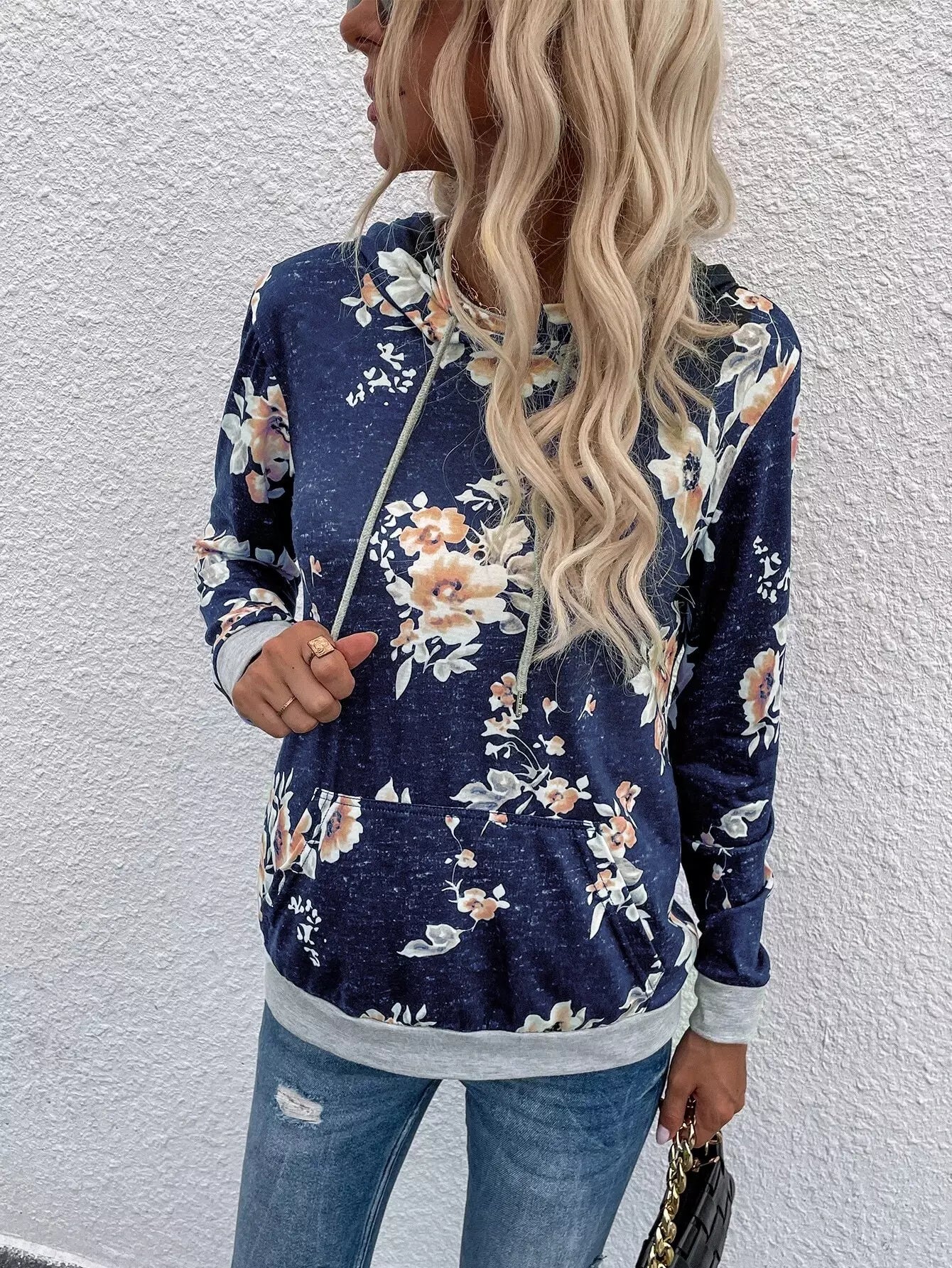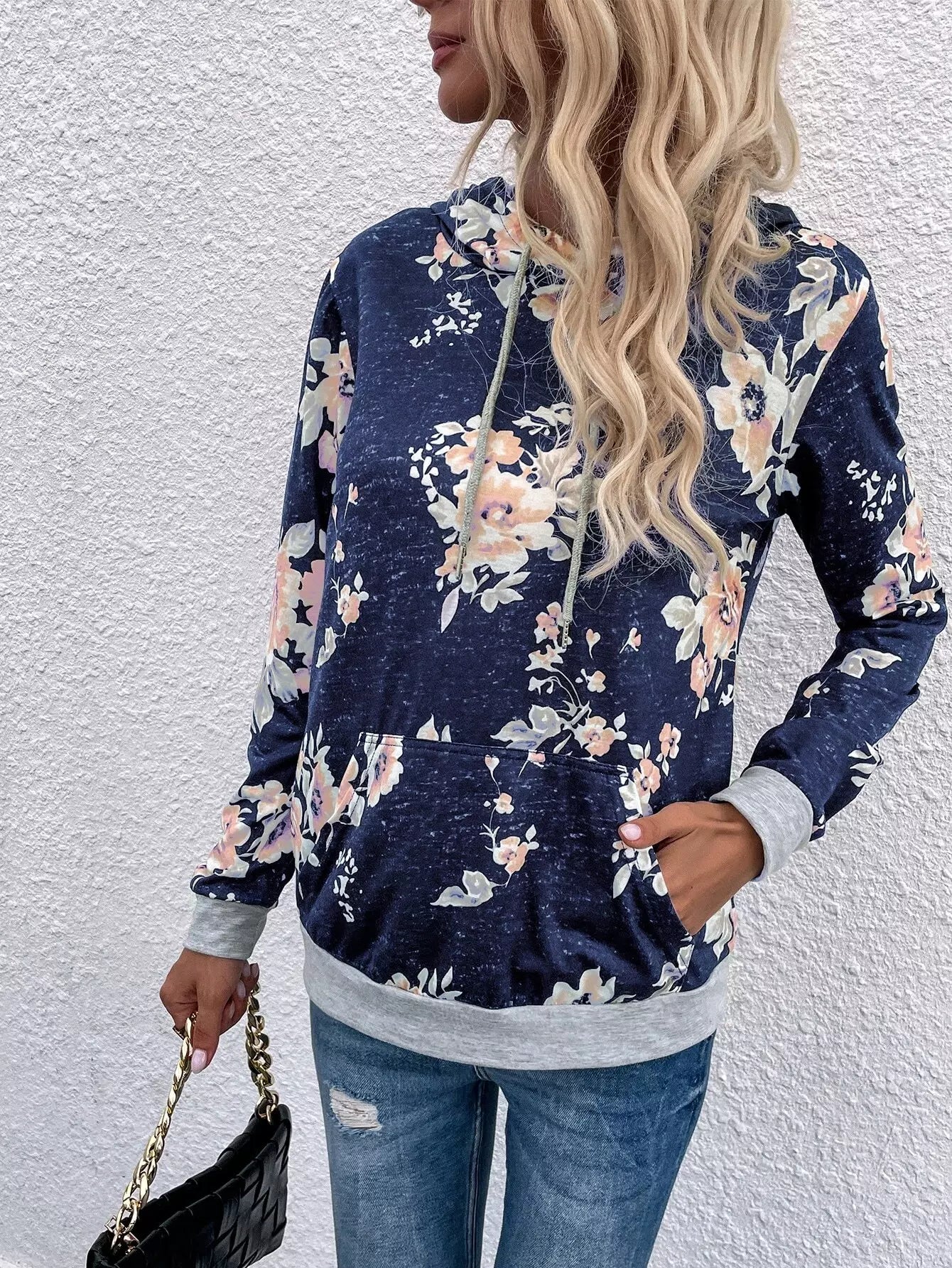 كنزة بقلنسوة بجيب كنغر مطبوع عليها زهور وأربطة