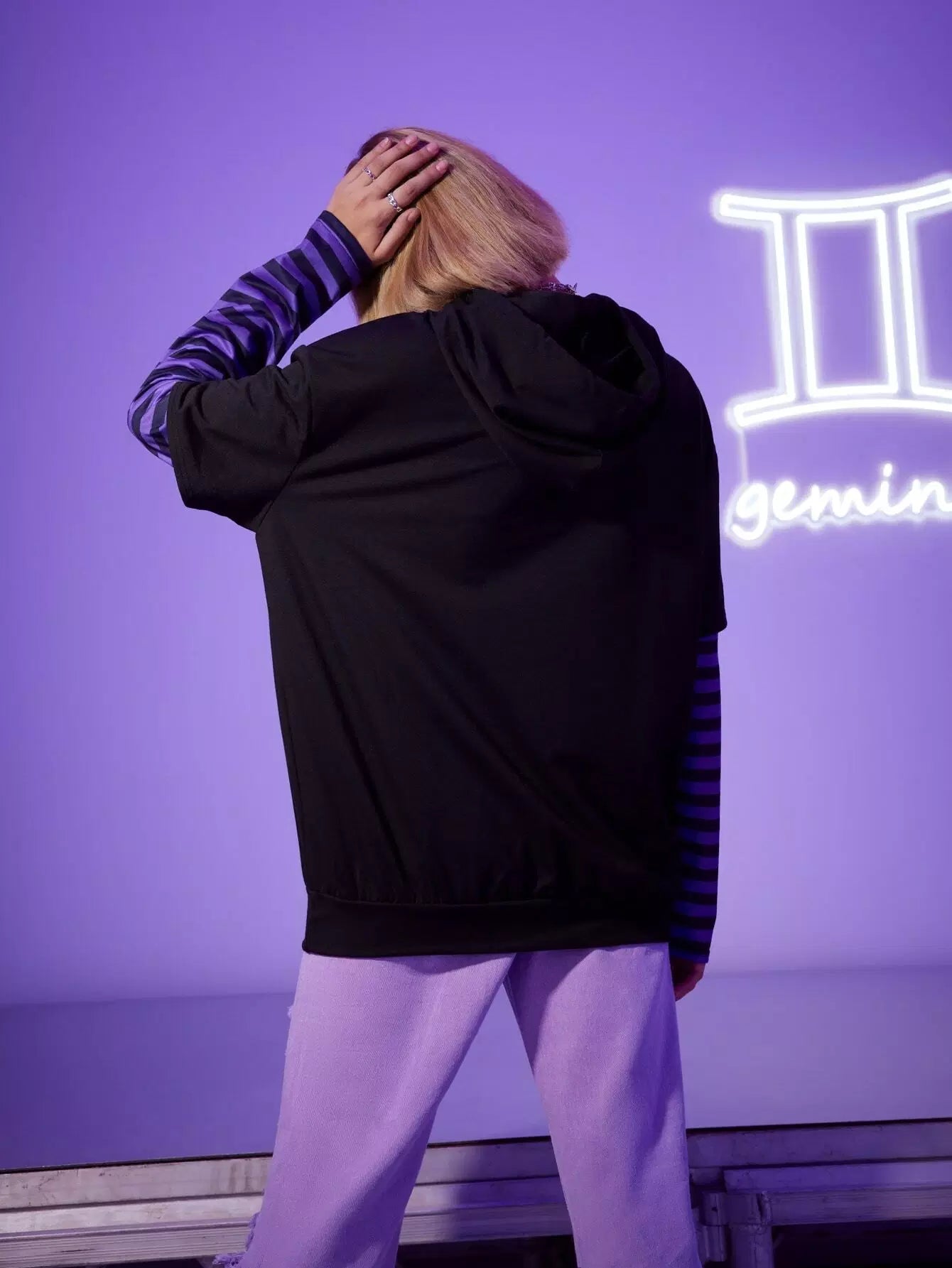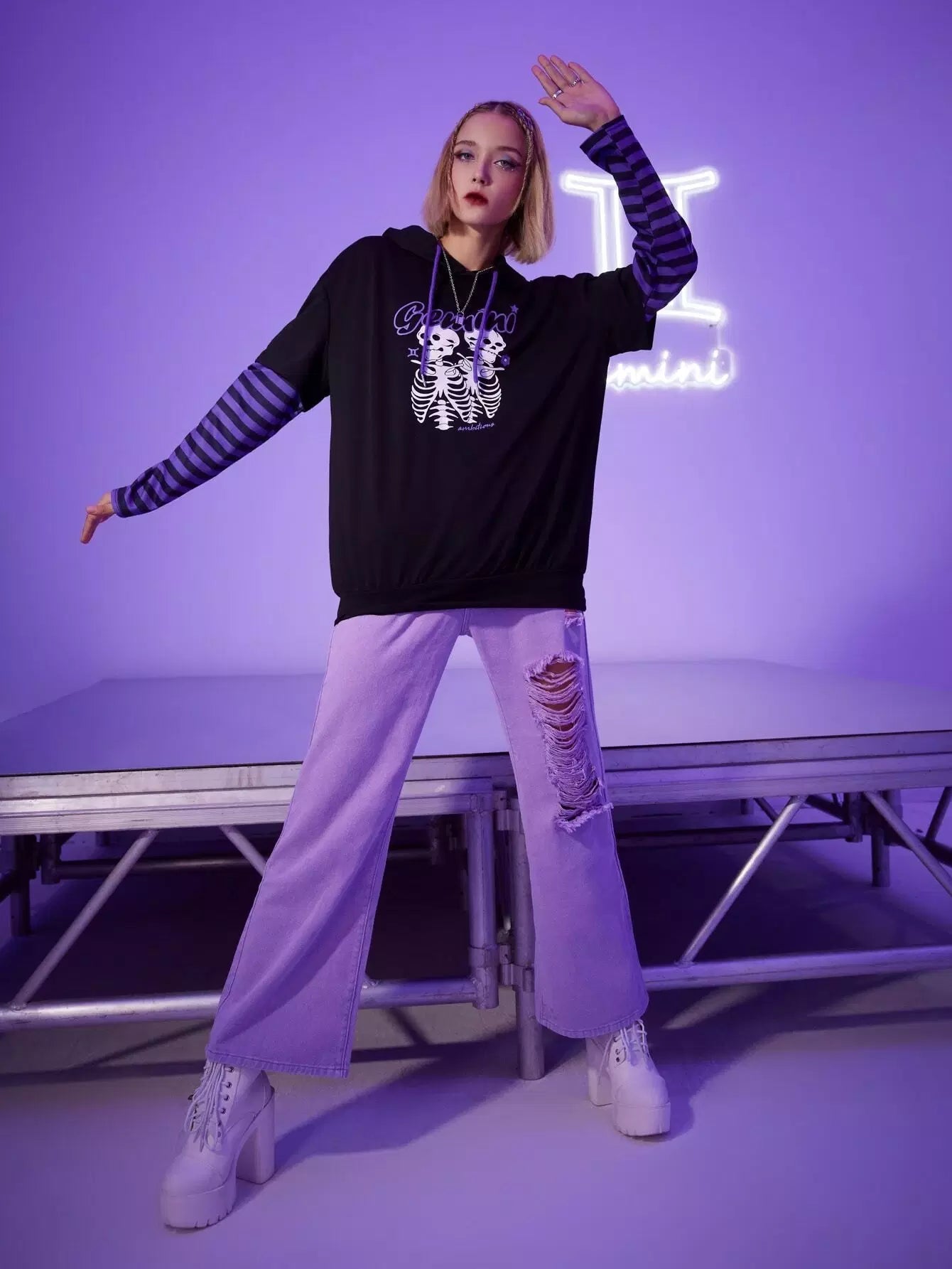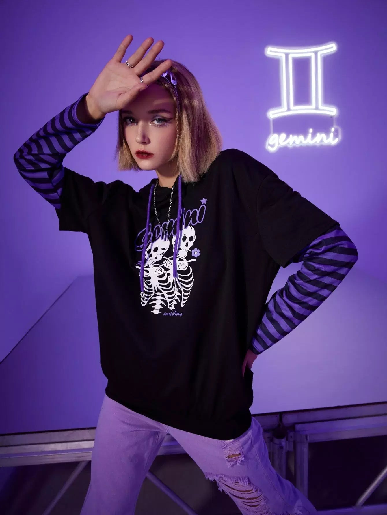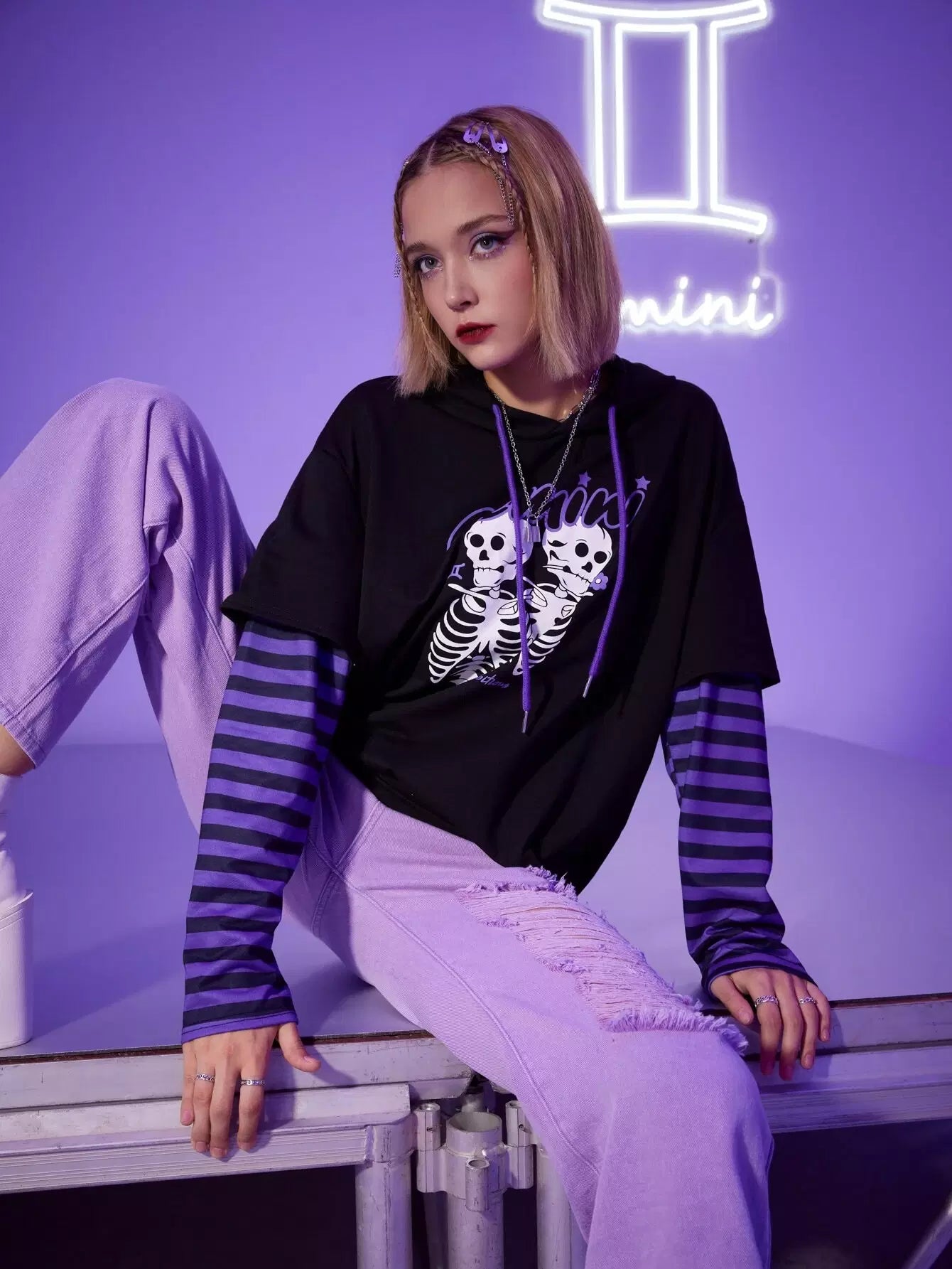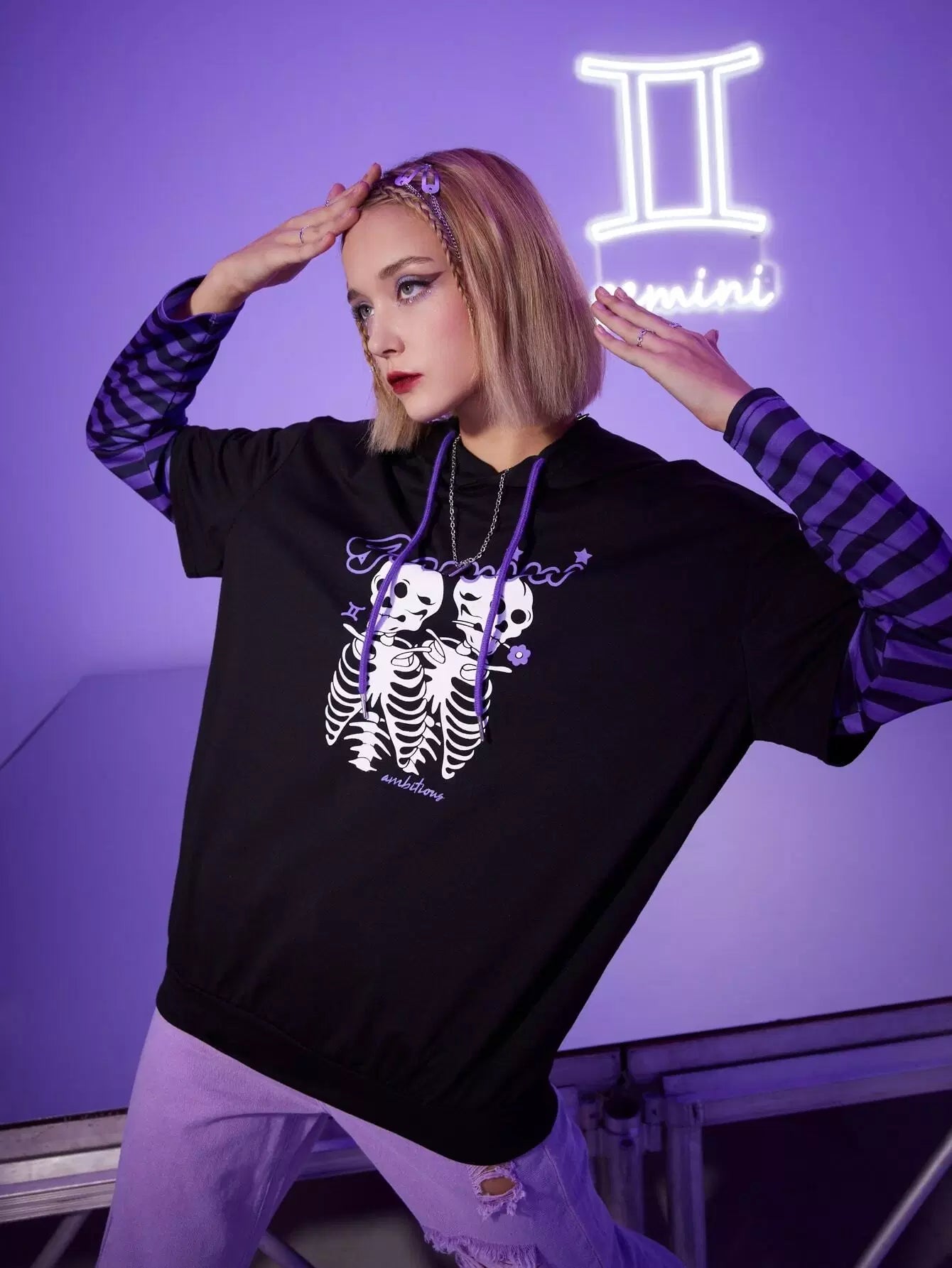 النساء - هودي جيميني 2 في 1 بأكمام مخططة ورسوم هيكل عظمي برباط