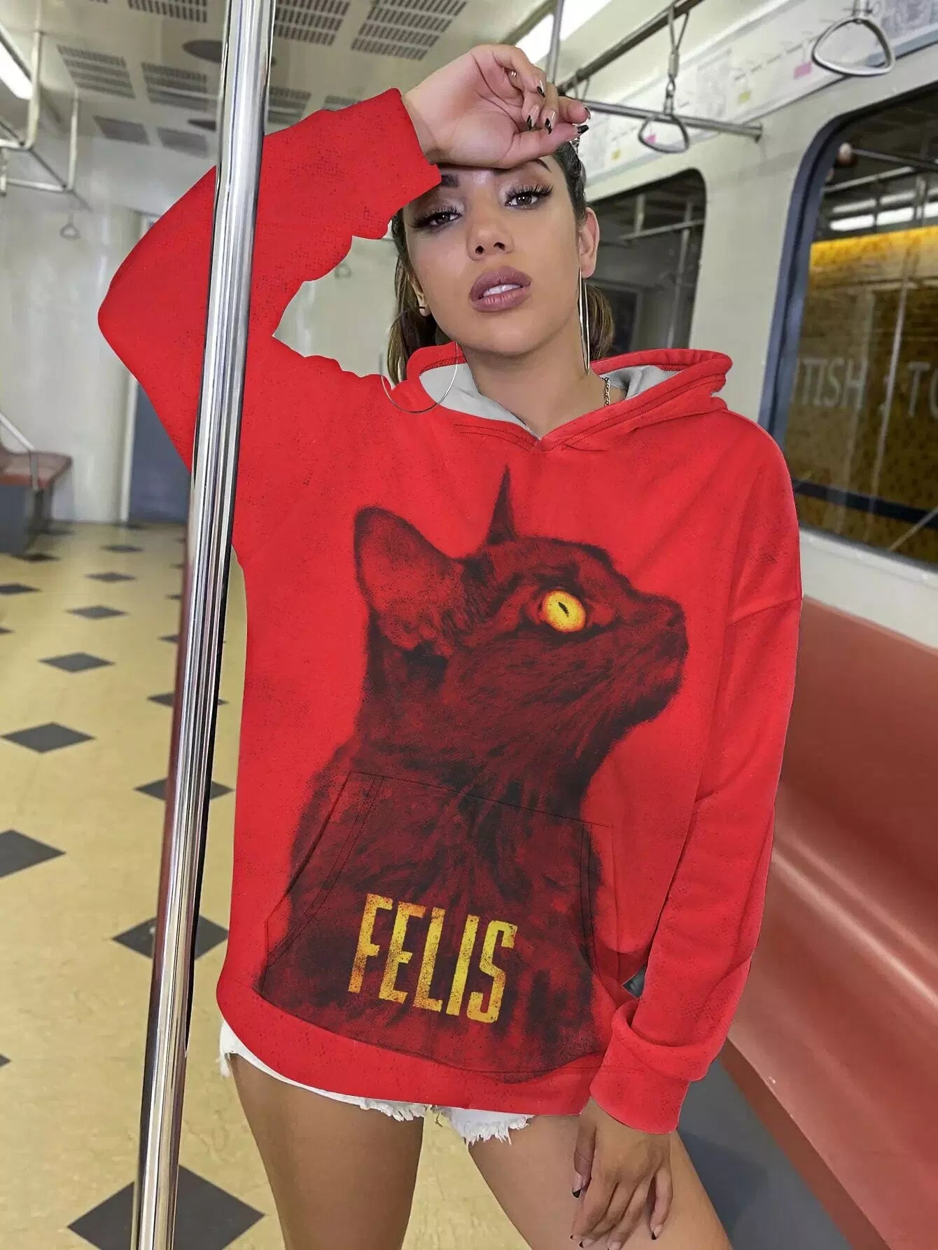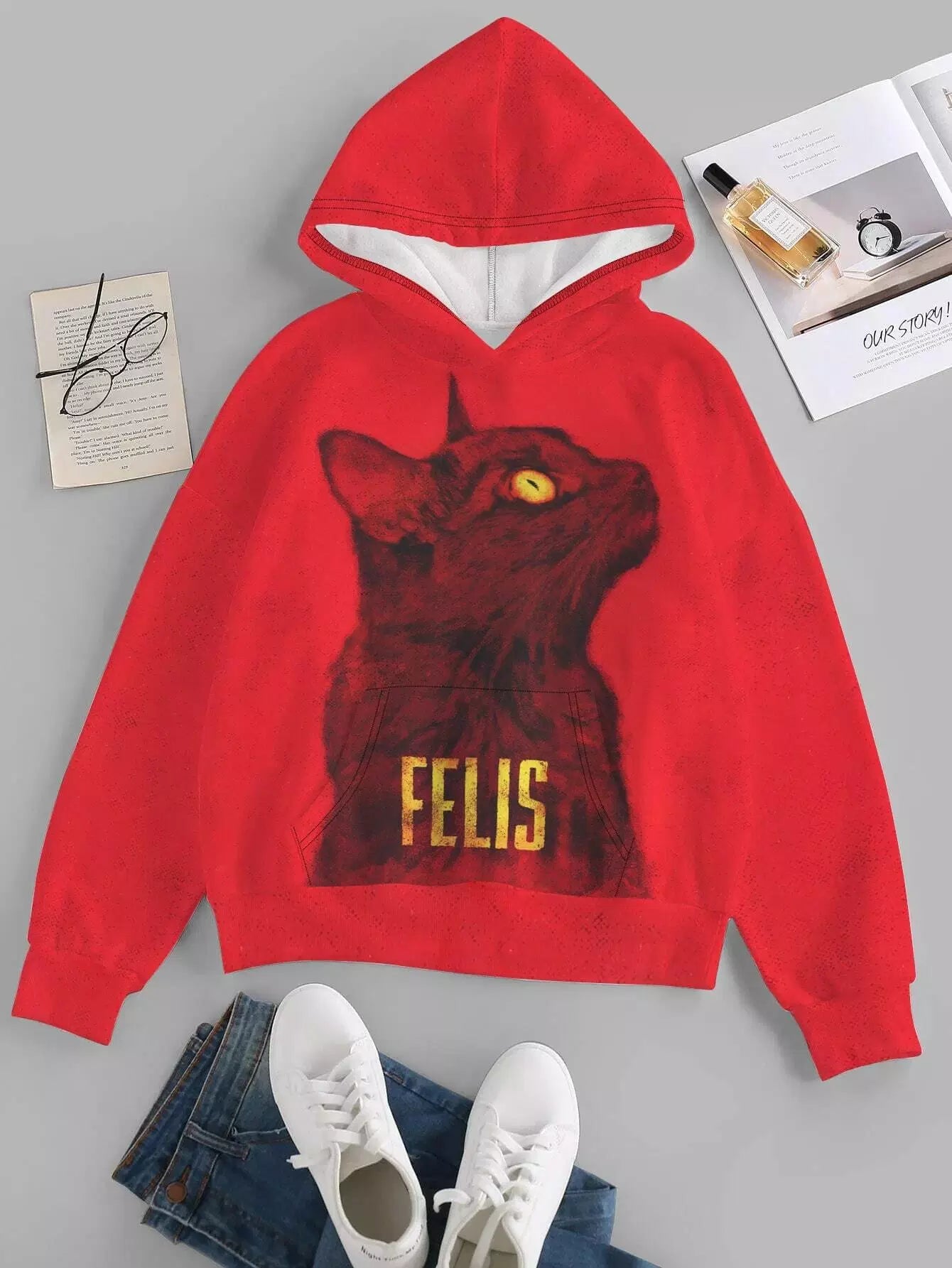 هودي بغطاء رأس منسدل بجيب الكنغر وطبعة قطة ثلاثية الأبعاد وحرف