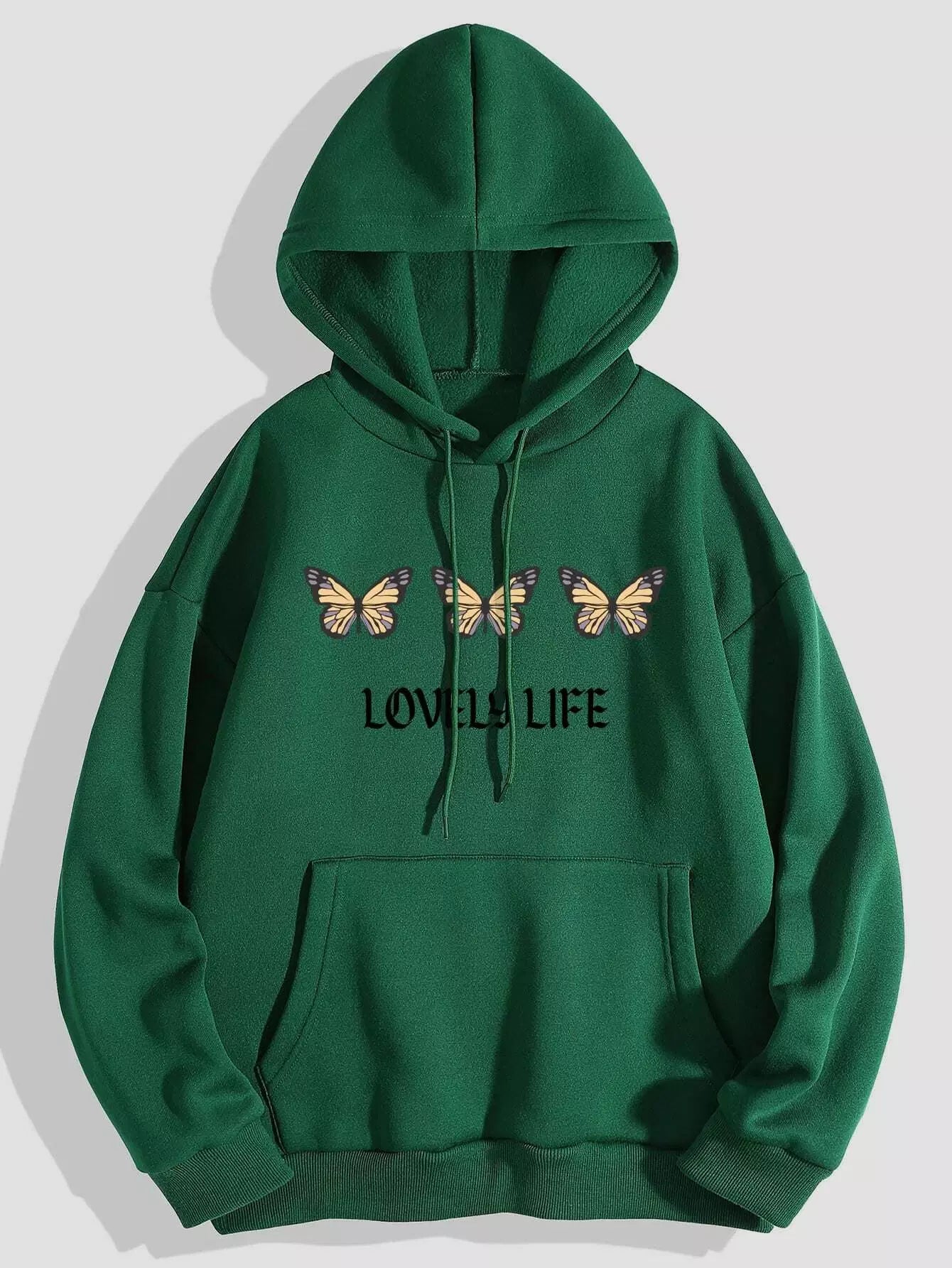 هودي حراري مطبوع عليه حروف وفراشات بجيب كنغرو برباط حراري