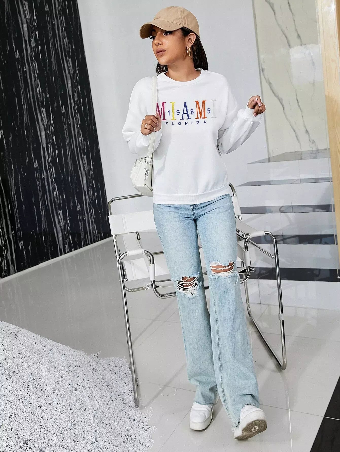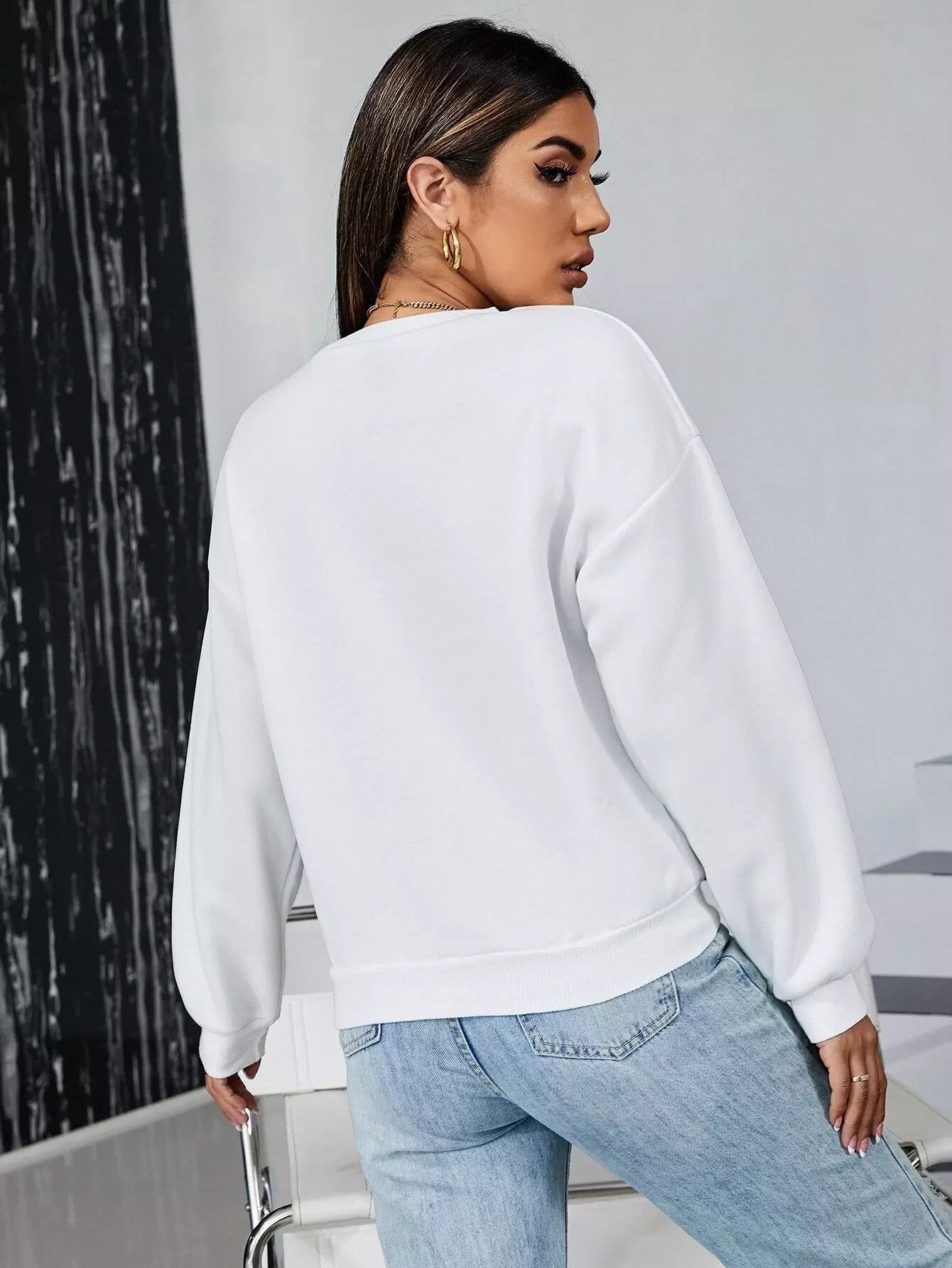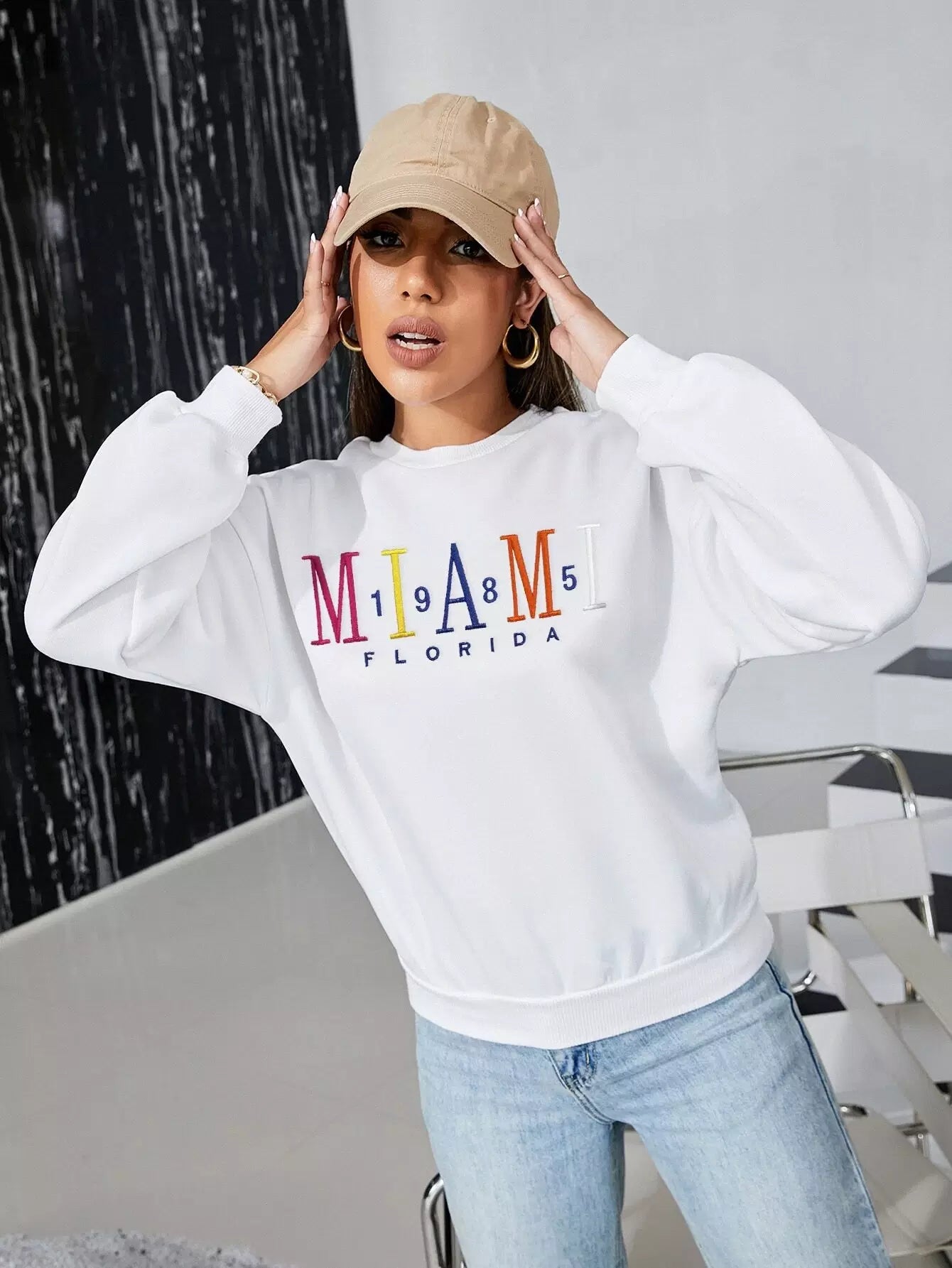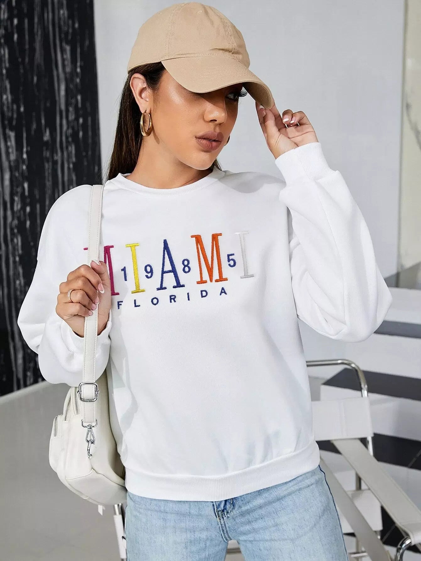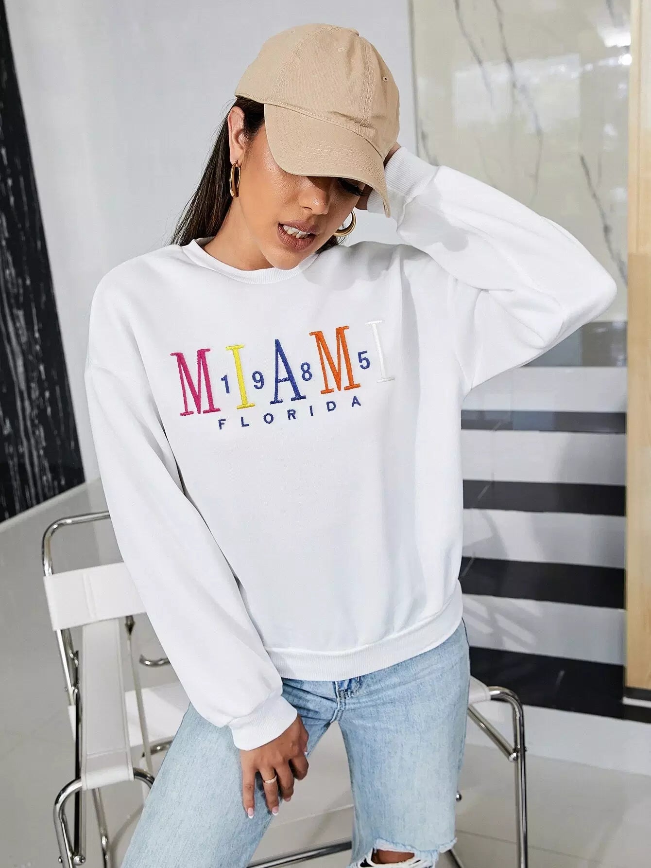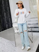 كنزة صوفية منسدلة الكتف مطرزة بتطريز حروف مطرزة بحروف منسدلة