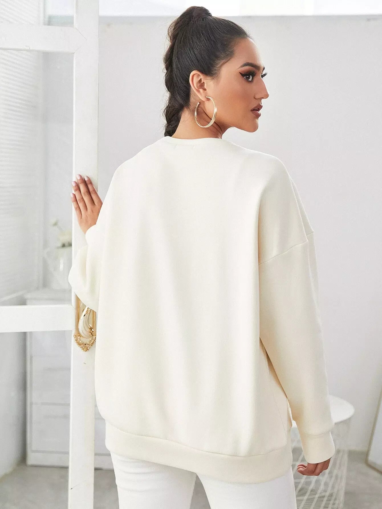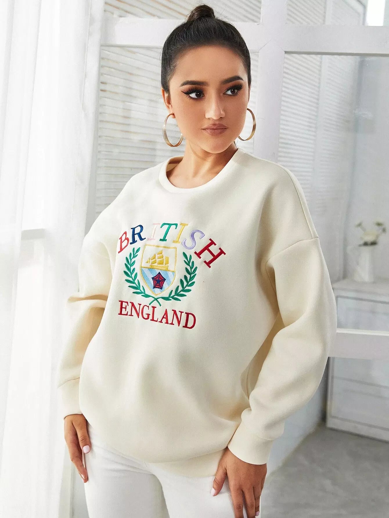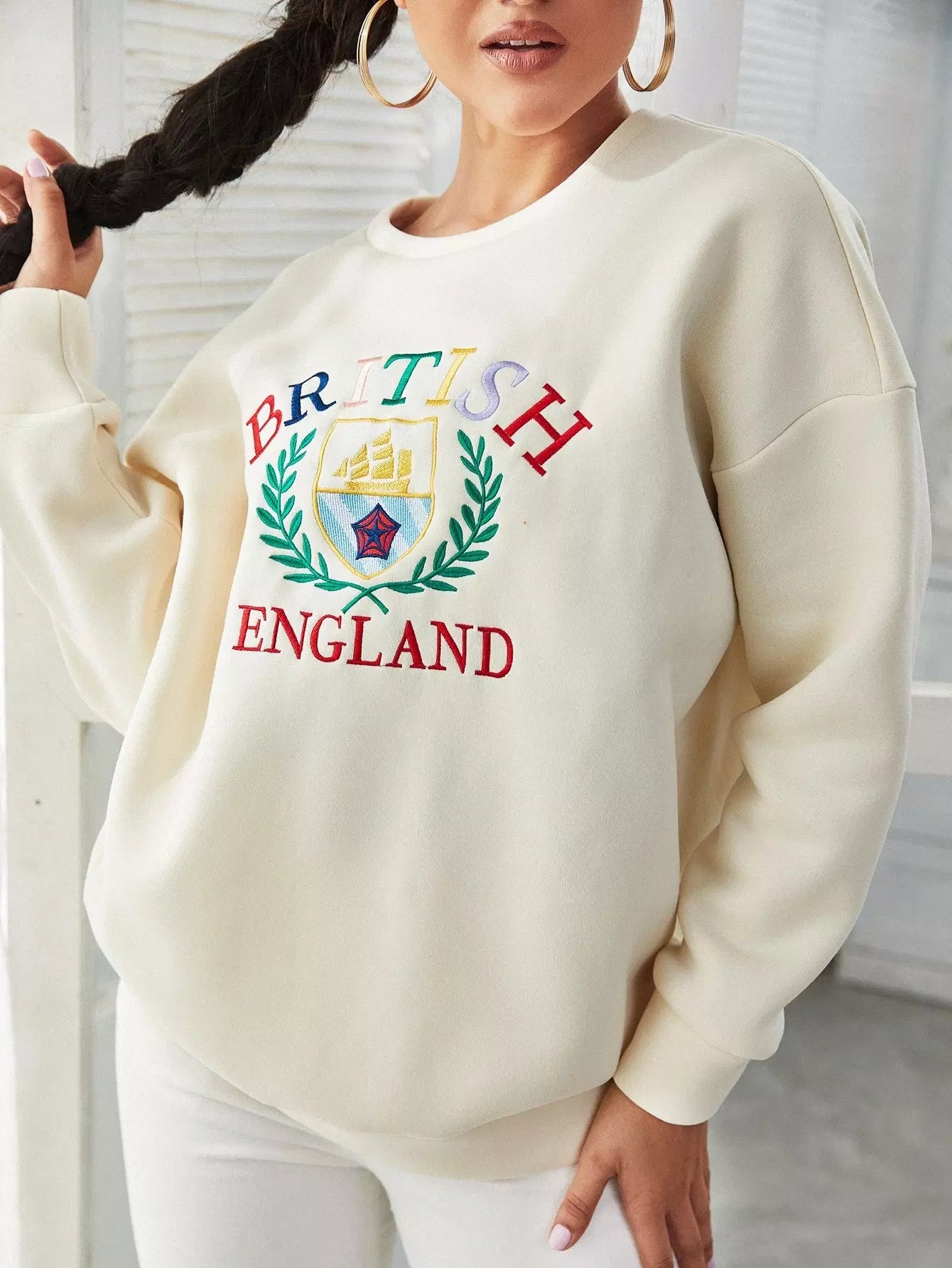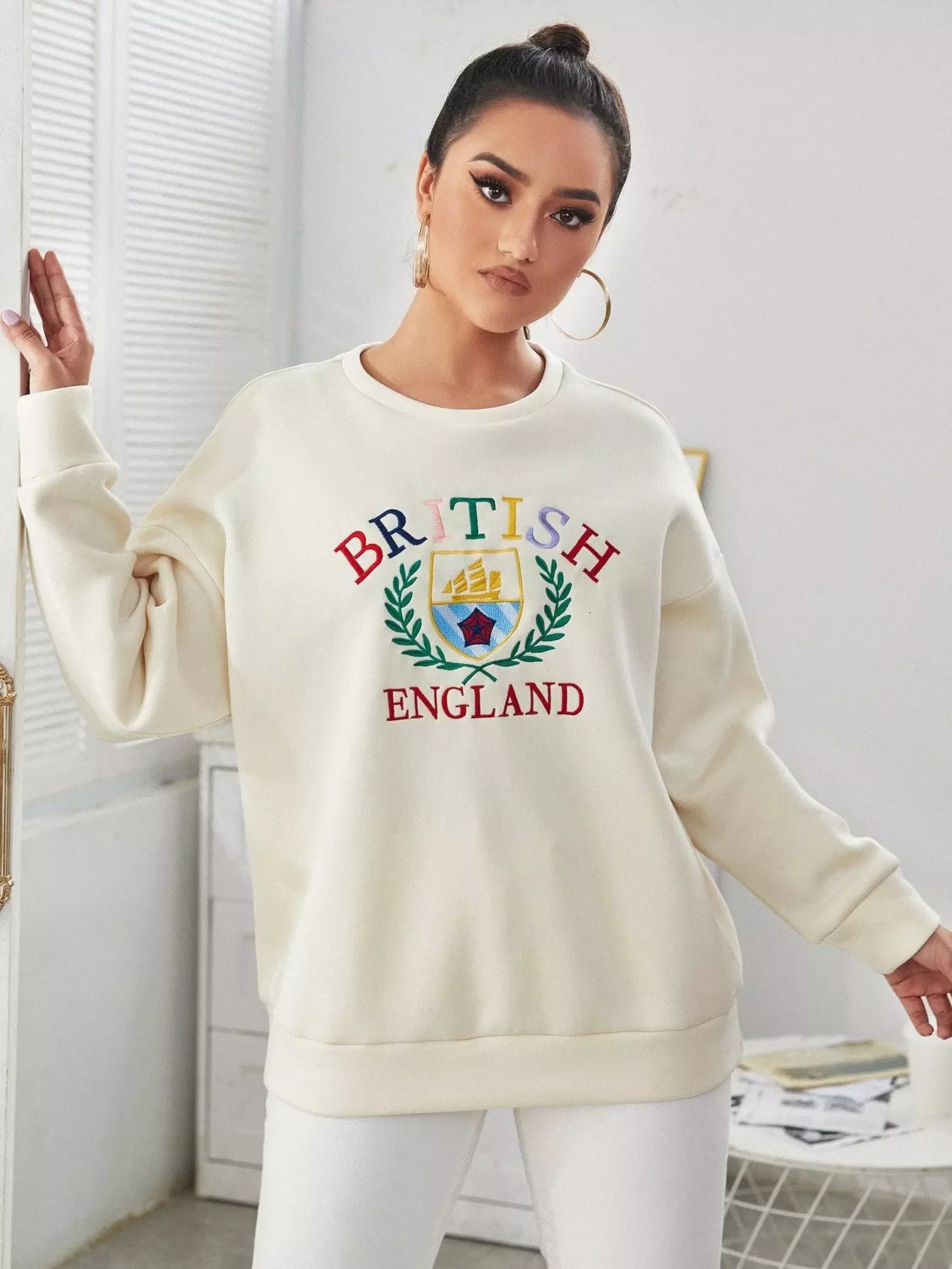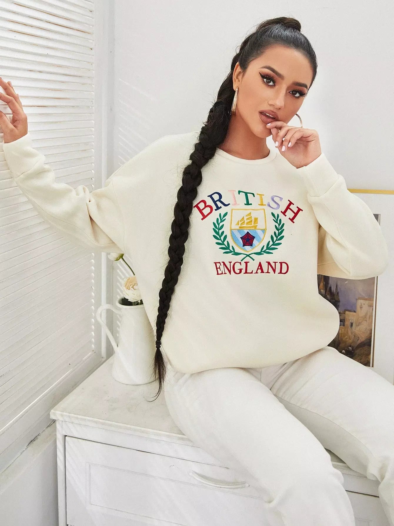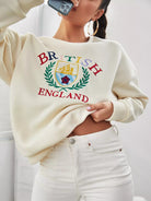 كنزة صوفية منسدلة الكتف مطرزة بحروف ونباتات