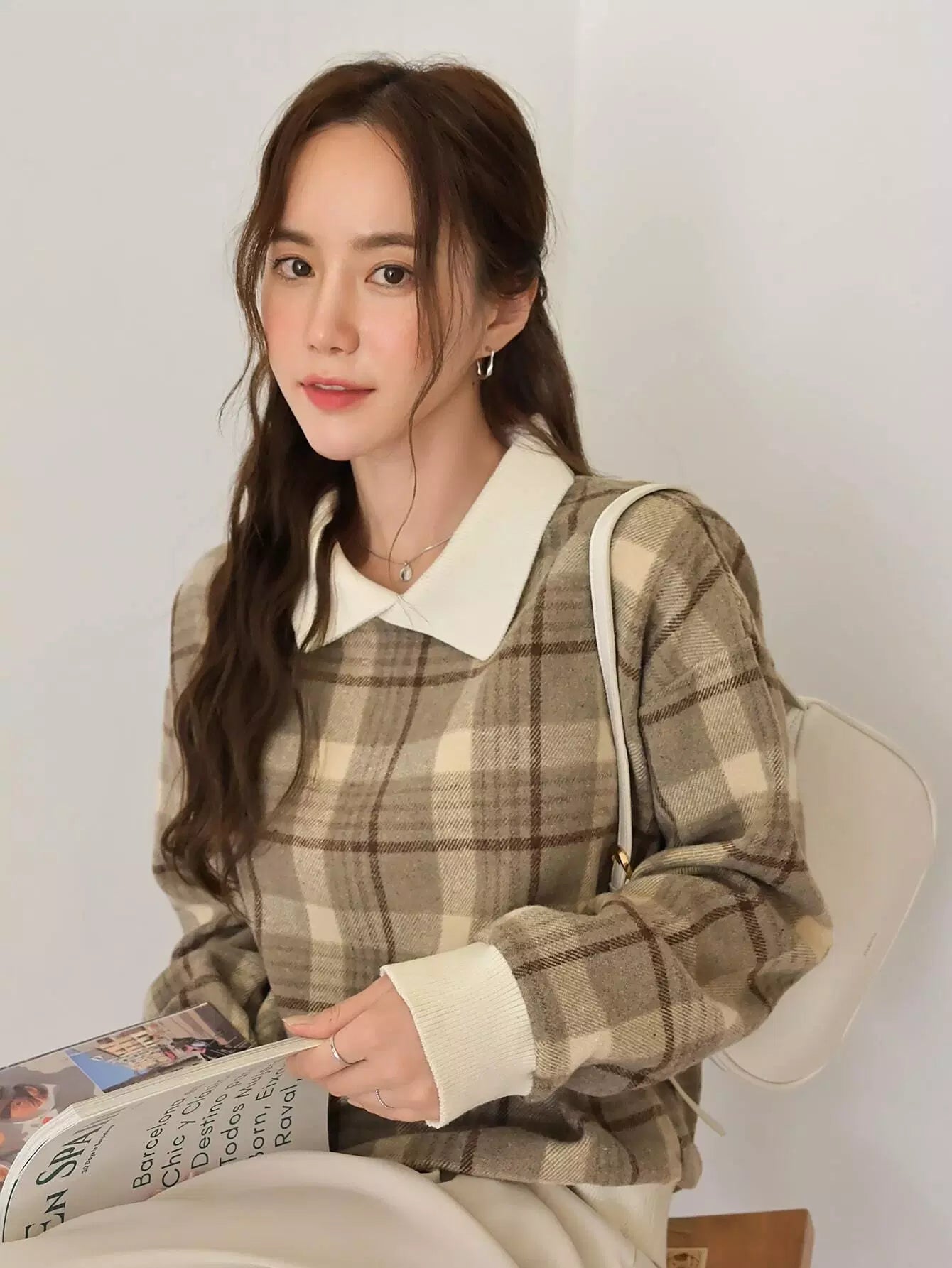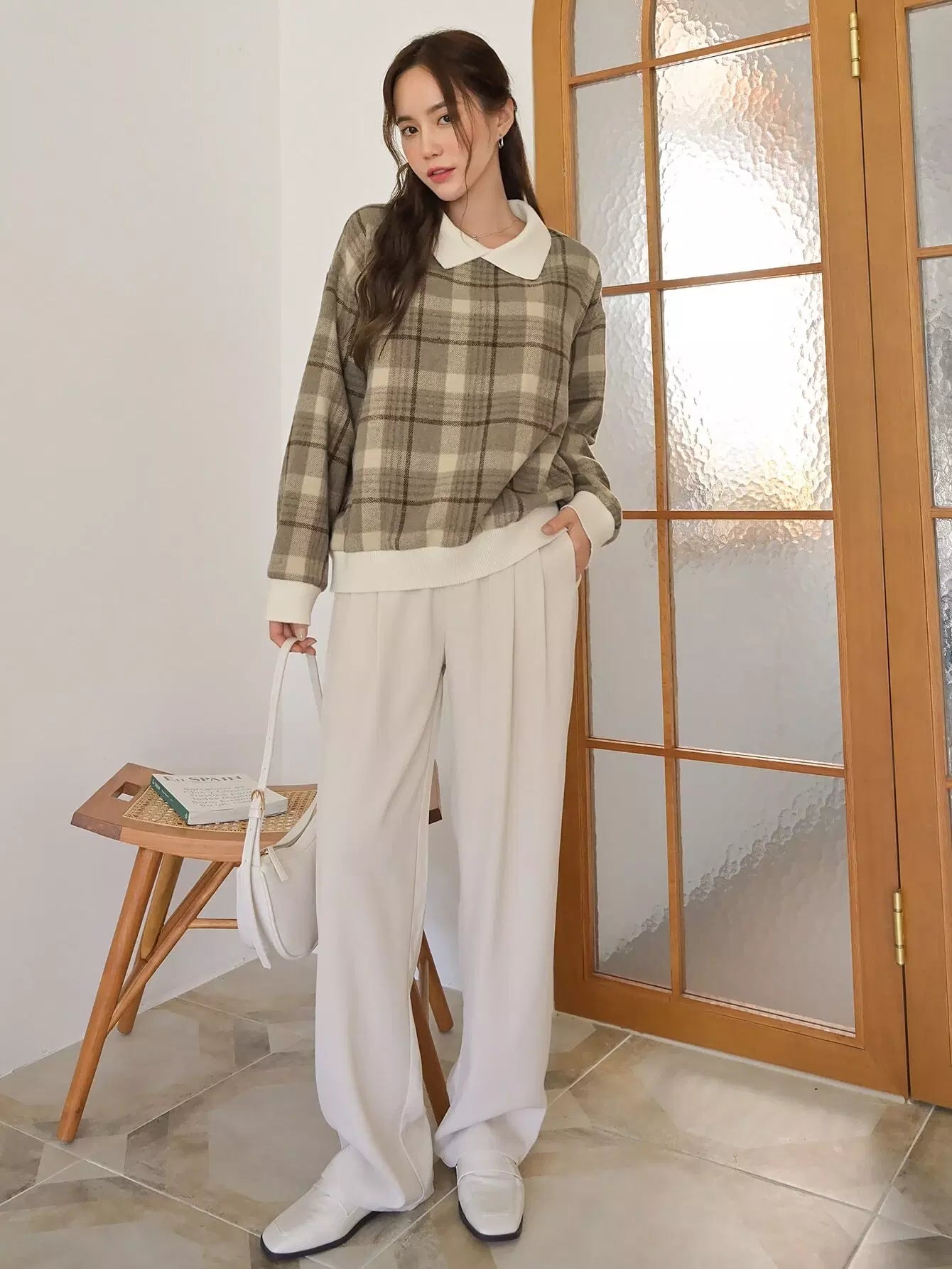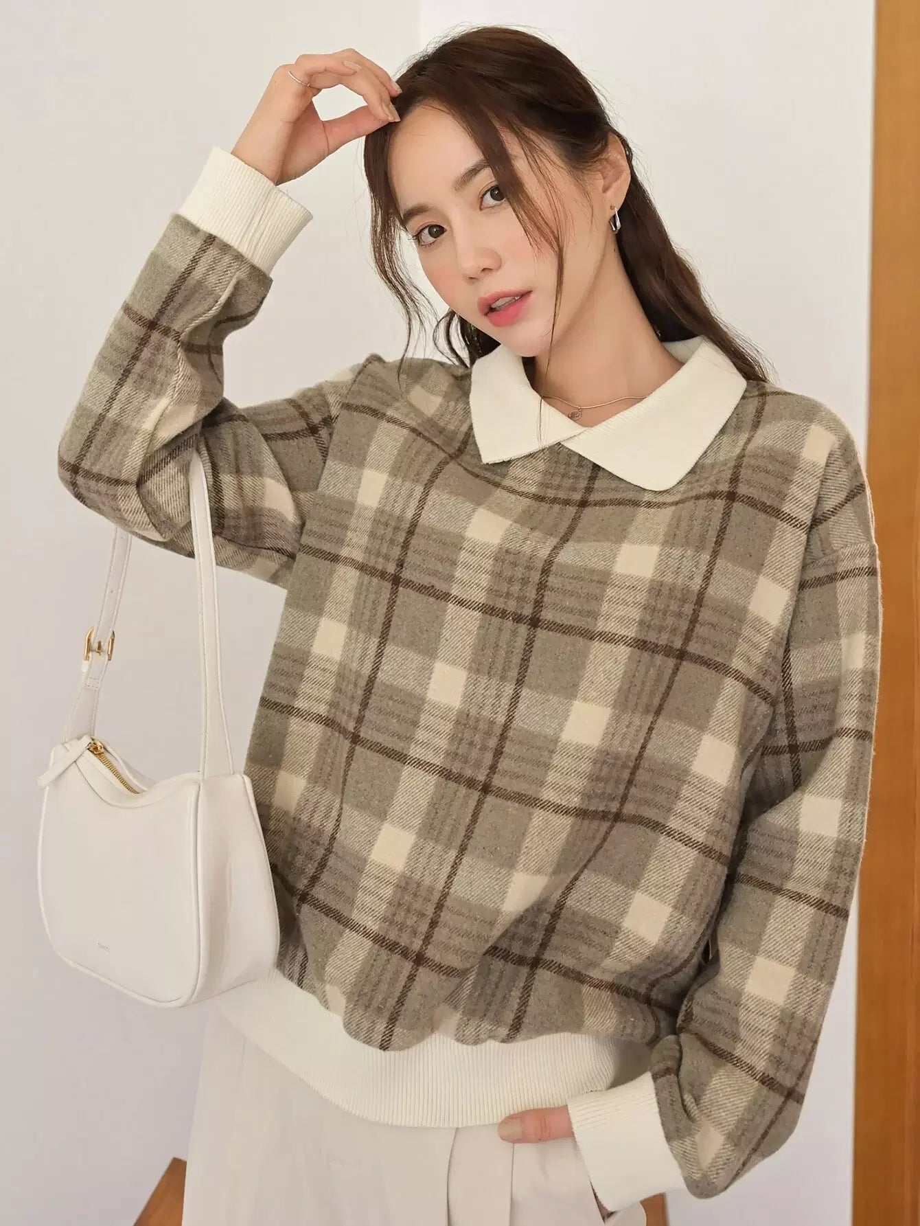 بلوفر منقوش بنقشة مربعات متباينة اللون مع أكتاف منسدلة