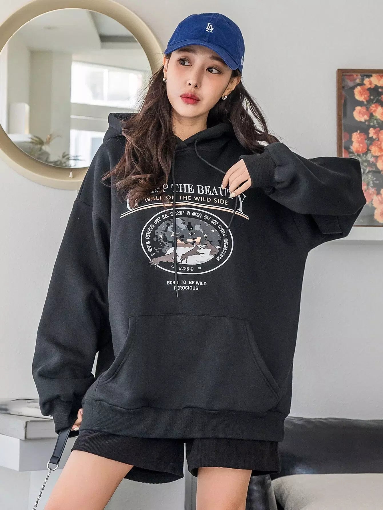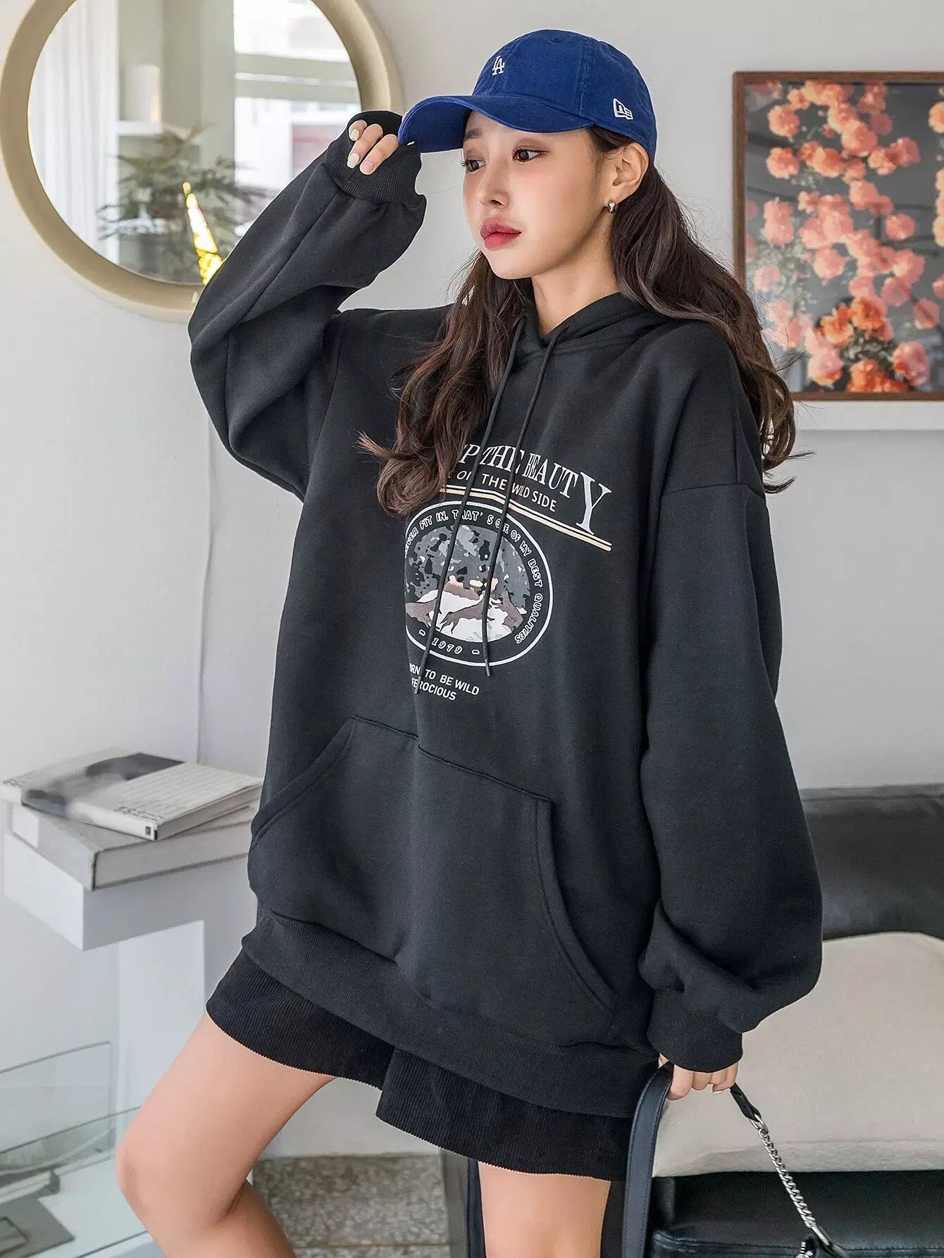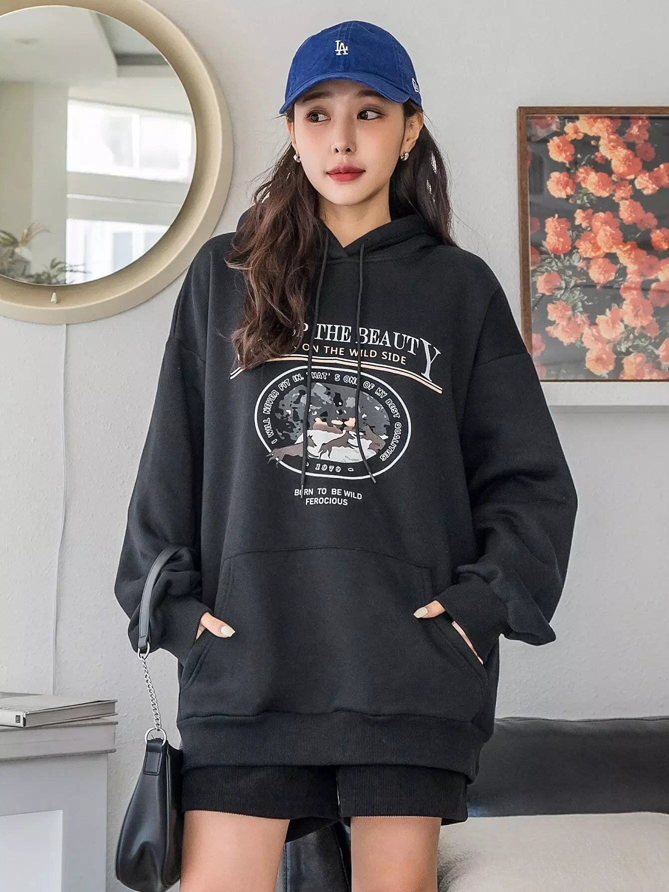 شعار وطبعة حيوانات مطبوع عليها شعار الكنغر بجيب منسدل على الكتف برباط رباط هودي