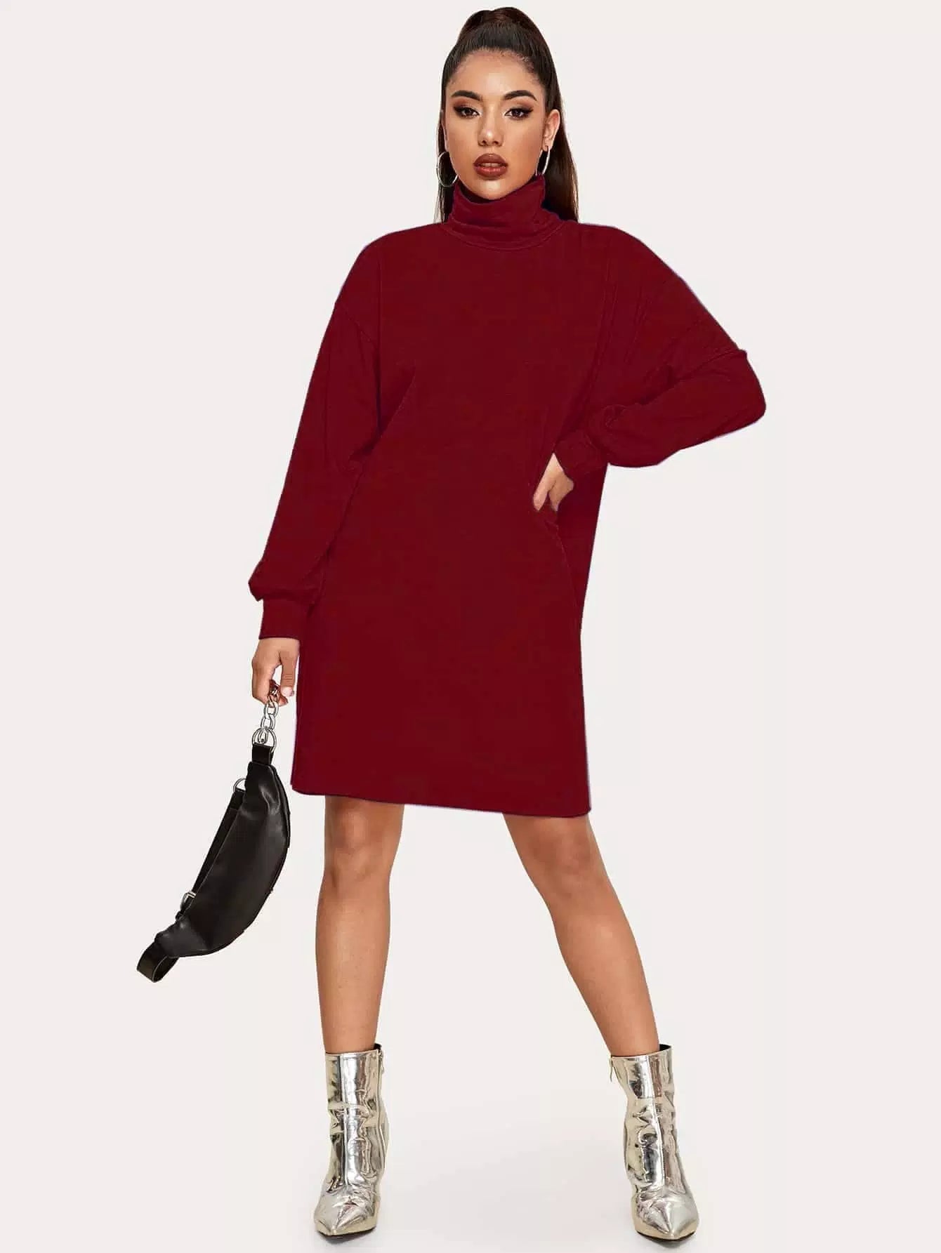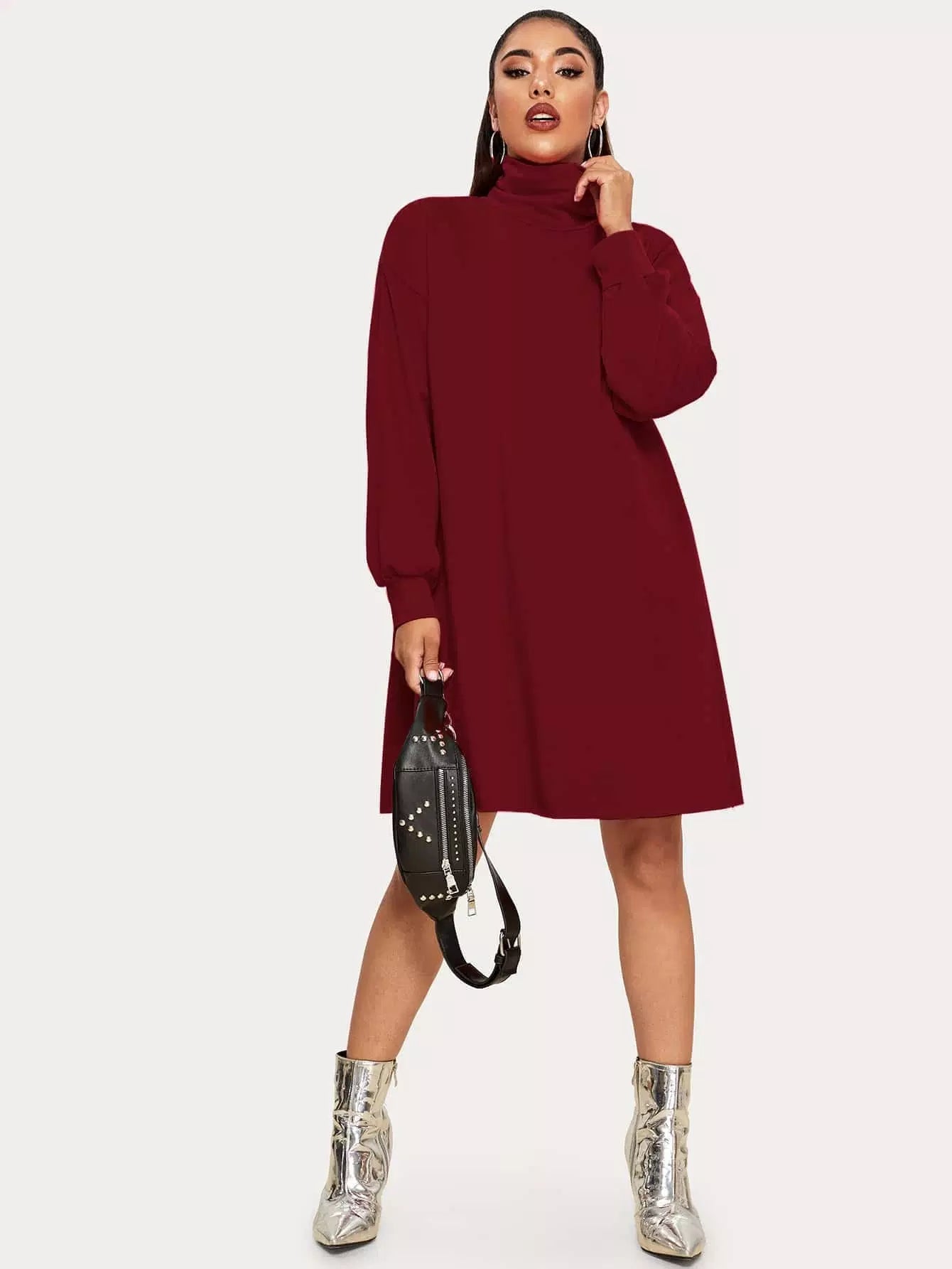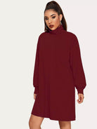 فستان سادة بياقة عالية الرقبة سادة