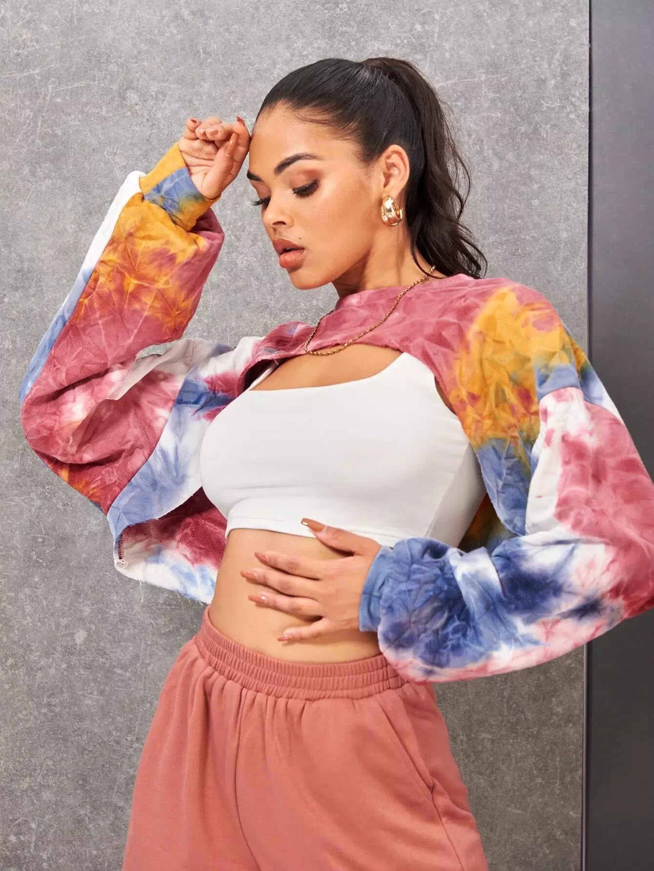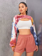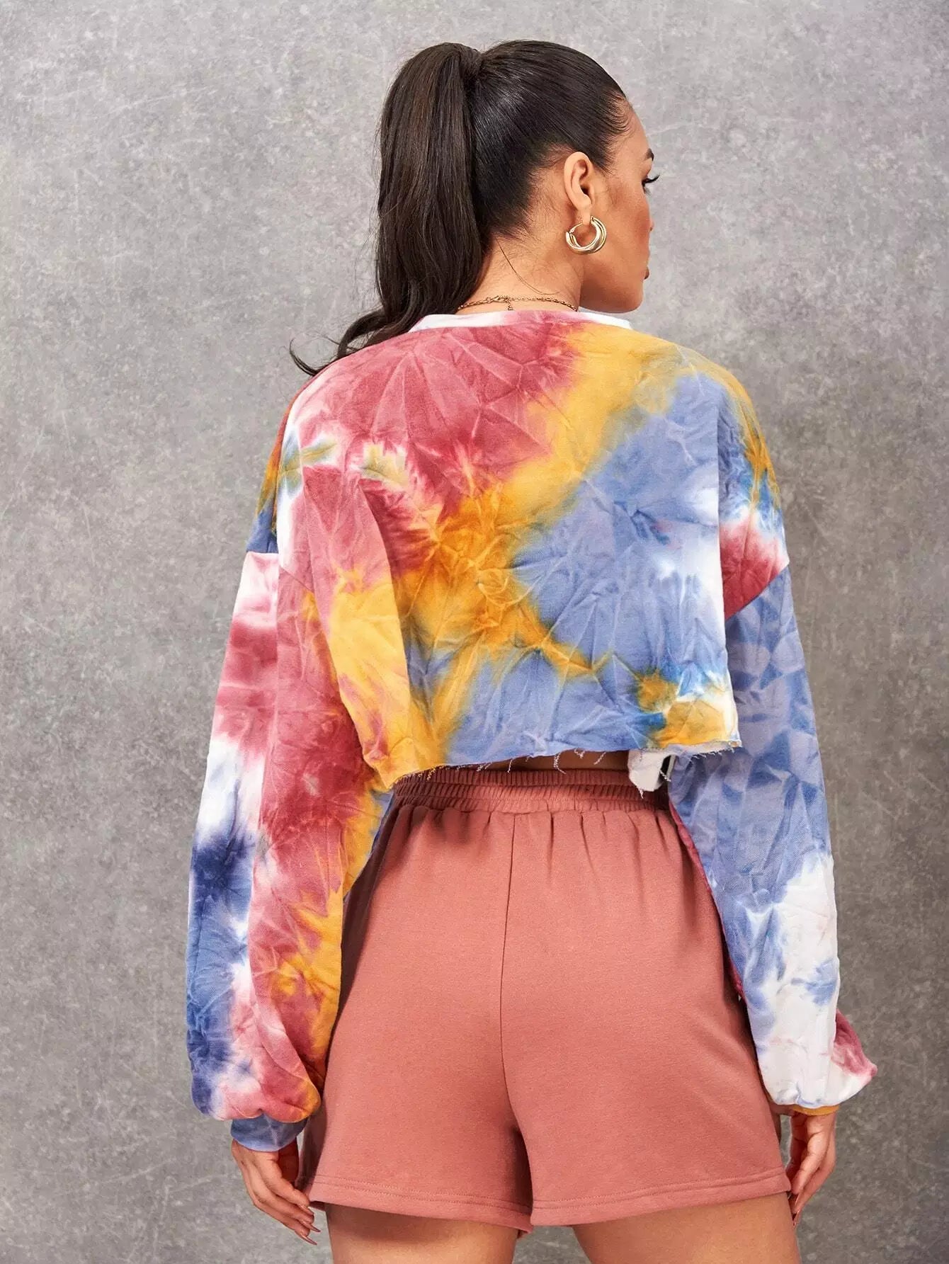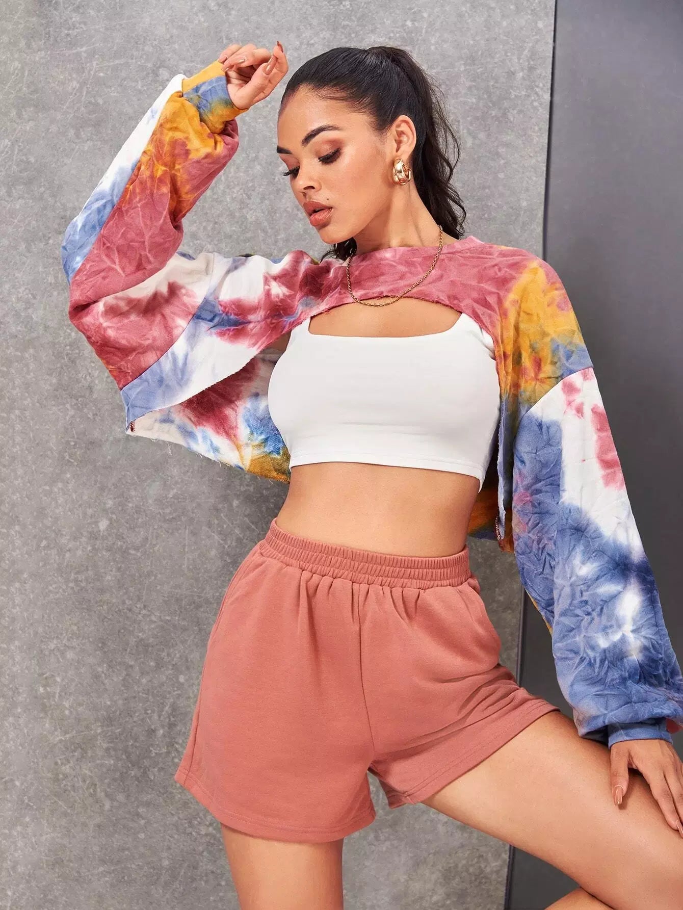 سويت شيرت قصير للغاية بقصّة كتف منسدلة وصباغة التعادل بدون قميص داخلي