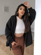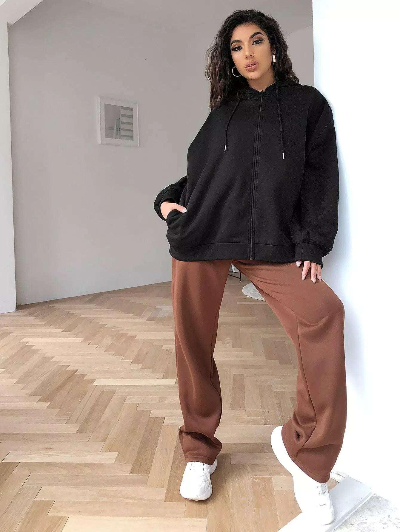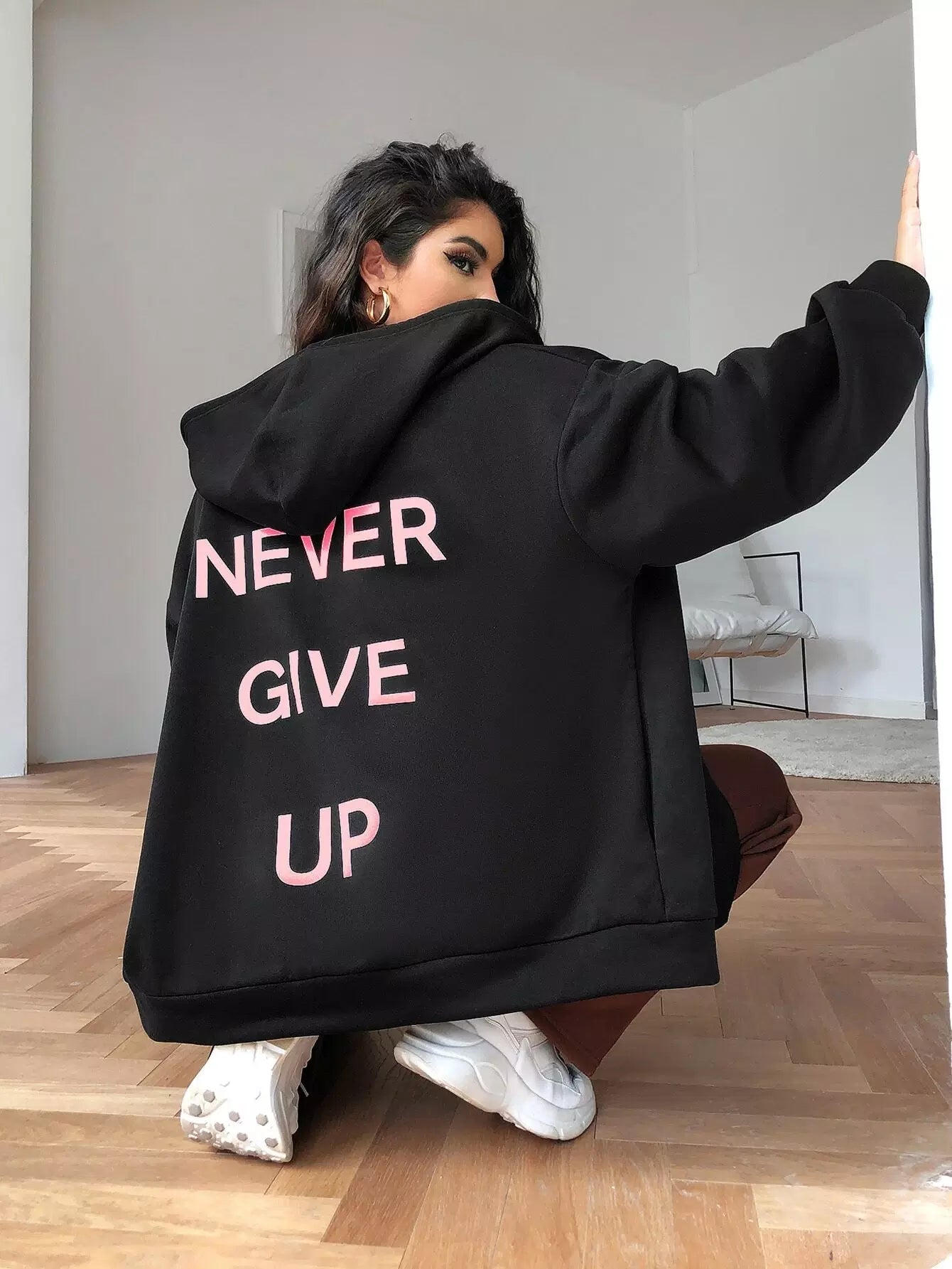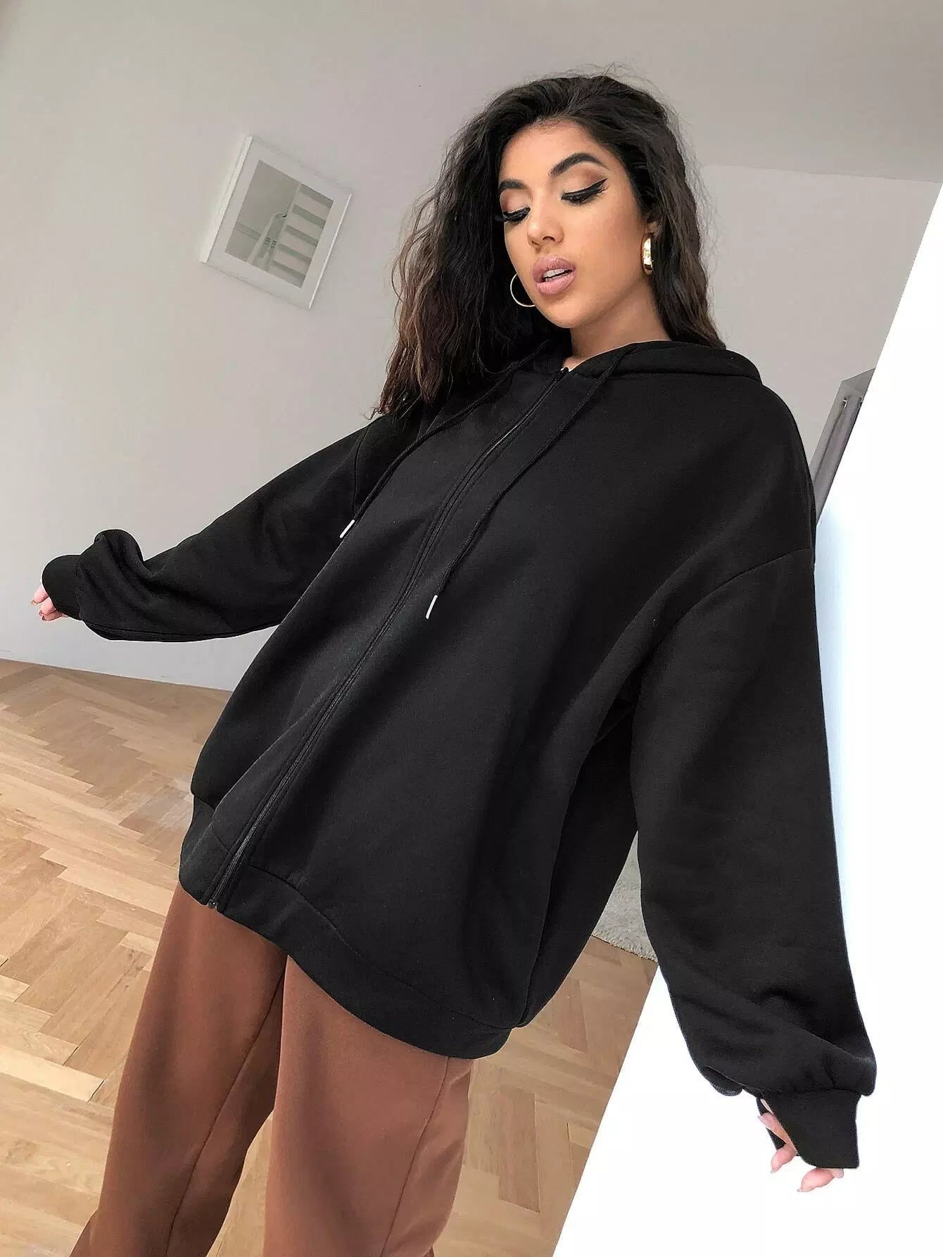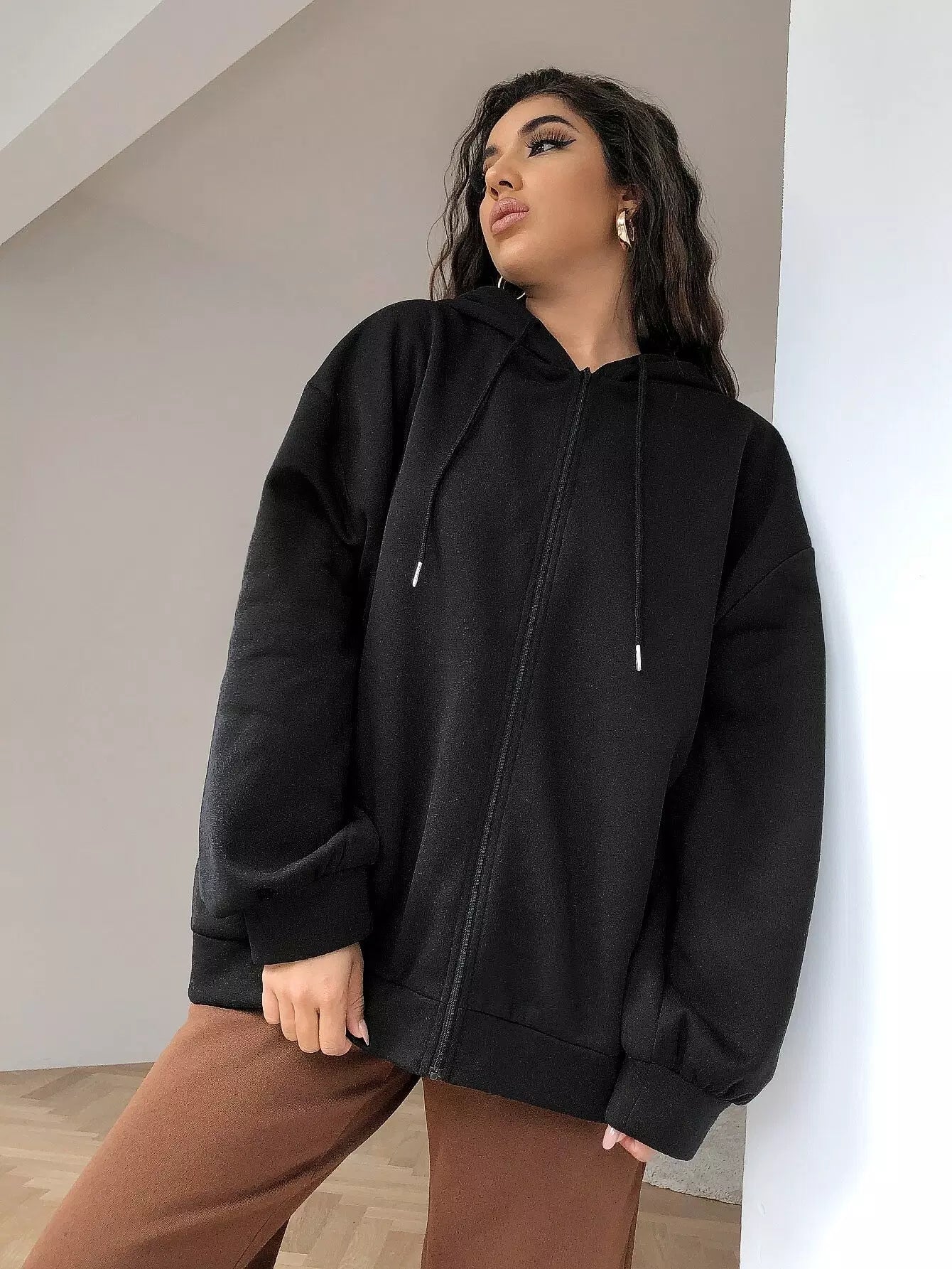هودي طويل قصير بسحّاب برسومات كبيرة الحجم بسحاب فوق الحرف