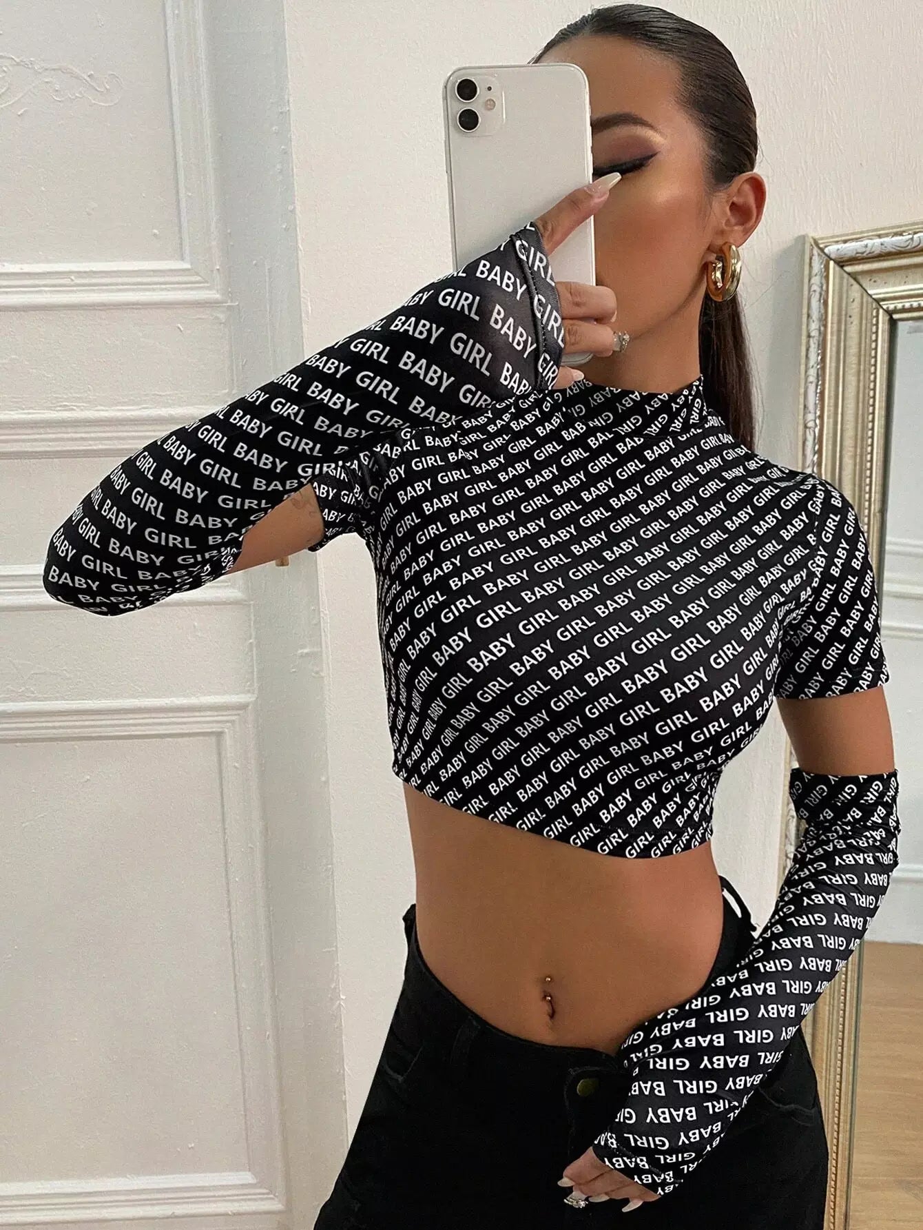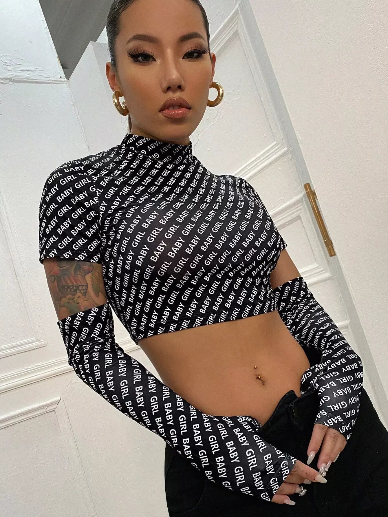 تي شيرت كوبي برقبة قميص كوبي برسومات على شكل حرف كامل وأكمام من الخلف