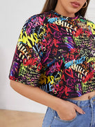 تي شيرت قصير منسدل الكتف مطبوع عليه حروف بالكامل