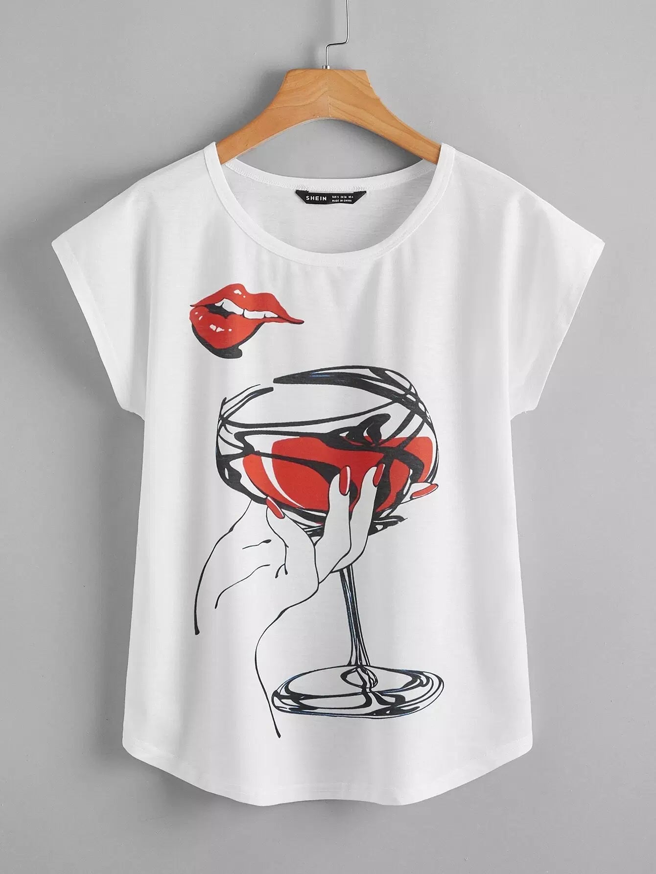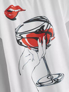 تي شيرت بأكمام بطبعة زجاج نبيذ أحمر وشفاه بأكمام عريضة